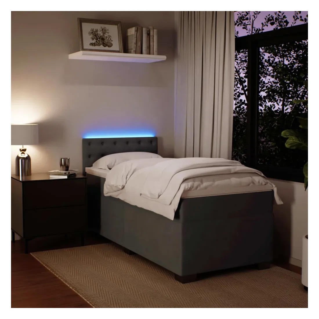 Utilisez ce lit à sommier pour profiter d'une nuit de sommeil réparatrice ! Il vous offre une relaxation maximale et un sommeil agréable. Matériau doux et confortable : le tissu en velours présente une surface douce et lisse qui offre une sensation agréable contre la peau, vous apportant chaleur et confort ultime.Matelas à ressorts ensachés : ce matelas à ressorts ensachés comporte des ressorts ensachés individuels qui fonctionnent indépendamment pour offrir un soutien personnalisé en réagissant uniquement à la pression exercée dans chaque zone. Cette conception empêche « l'enroulement » et réduit le transfert de mouvement par rapport aux matelas traditionnels à ressorts ouverts. Chaque ressort ensaché soutient le corps individuellement.Lumières LED pour une ambiance agréable : ce lit est équipé de lumières LED qui peuvent être facilement réglées pour créer un spectacle lumineux personnalisé. Vous pouvez personnaliser les modes, les couleurs et la luminosité pour améliorer l'ambiance de votre espace intérieur.Surmatelas confortable : ce surmatelas améliore le soutien et le confort grâce à sa surface douce et respirante, tout en prolongeant la durée de vie de votre matelas. Sa housse amovible permet un lavage facile, ce qui facilite l'entretien. Bon à savoir :Ce produit est doté d'un connecteur USB qui nécessite une source d'alimentation USB de 5V certifiée (non incluse).Pour des raisons d'hygiène, le matelas ne peut pas être retourné si l'emballage est retiré ou ouvert.Seule la partie avec un symbole de ciseaux peut être coupée et seule la partie avec l'USB continuera à fonctionner comme avant.