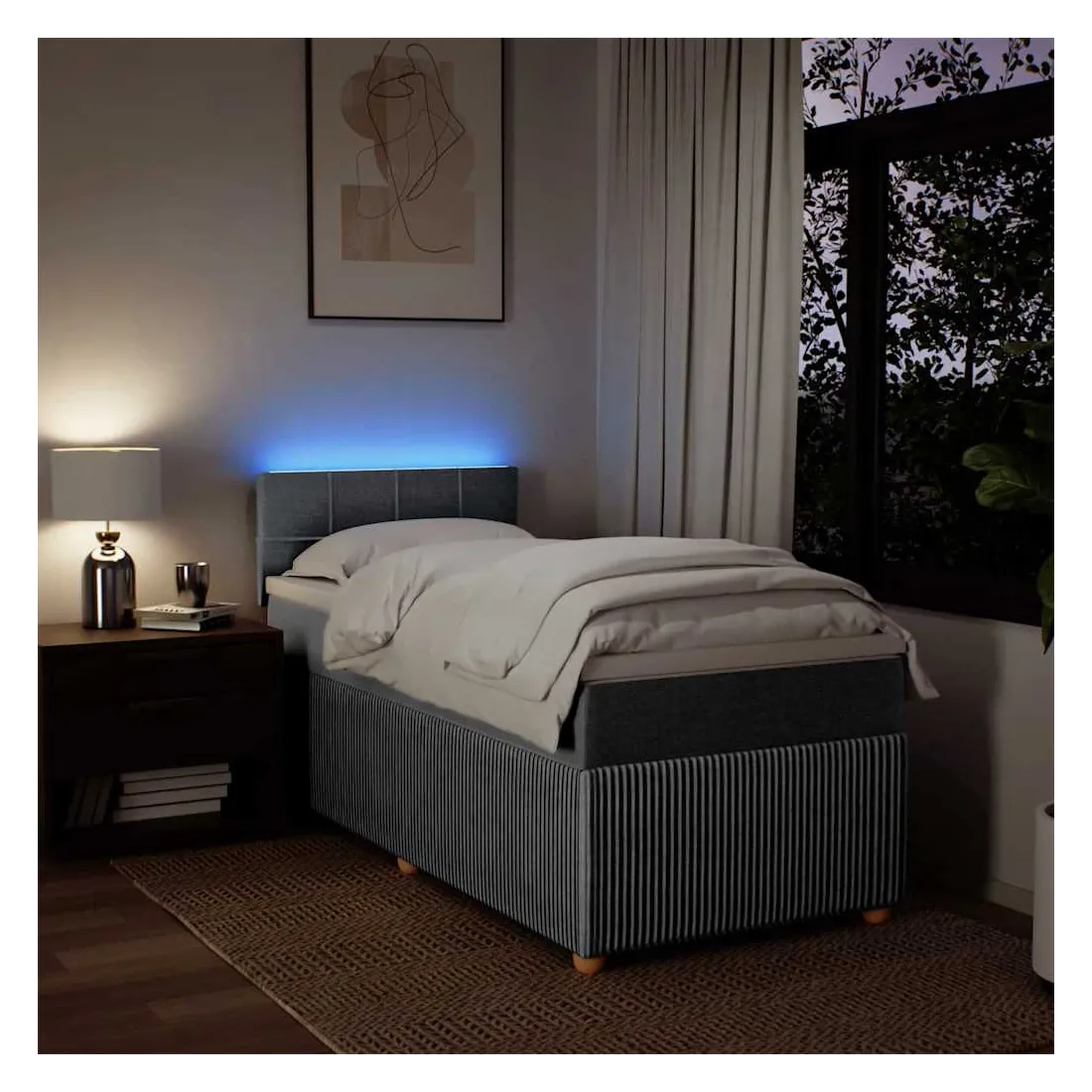 Utilisez ce lit à sommier pour profiter d'une nuit de sommeil réparatrice ! Il vous offre une relaxation maximale et un sommeil agréable. Matériau doux et durable : le tissu en polyester allie douceur, respirabilité et durabilité, vous garantissant un confort et une convivialité ultimes.Matelas à ressorts ensachés : ce matelas à ressorts ensachés comporte des ressorts ensachés individuels qui fonctionnent indépendamment pour offrir un soutien personnalisé en réagissant uniquement à la pression exercée dans chaque zone. Cette conception empêche « l'enroulement » et réduit le transfert de mouvement par rapport aux matelas traditionnels à ressorts ouverts. Chaque ressort ensaché soutient le corps individuellement.Lumières LED pour une ambiance agréable : ce lit est équipé de lumières LED qui peuvent être facilement réglées pour créer un spectacle lumineux personnalisé. Vous pouvez personnaliser les modes, les couleurs et la luminosité pour améliorer l'ambiance de votre espace intérieur.Surmatelas confortable : ce surmatelas améliore le soutien et le confort grâce à sa surface douce et respirante, tout en prolongeant la durée de vie de votre matelas. Sa housse amovible permet un lavage facile, ce qui facilite l'entretien. Bon à savoir :Ce produit est doté d'un connecteur USB qui nécessite une source d'alimentation USB de 5V certifiée (non incluse).Pour des raisons d'hygiène, le matelas ne peut pas être retourné si l'emballage est retiré ou ouvert.Seule la partie avec un symbole de ciseaux peut être coupée et seule la partie avec l'USB continuera à fonctionner comme avant.