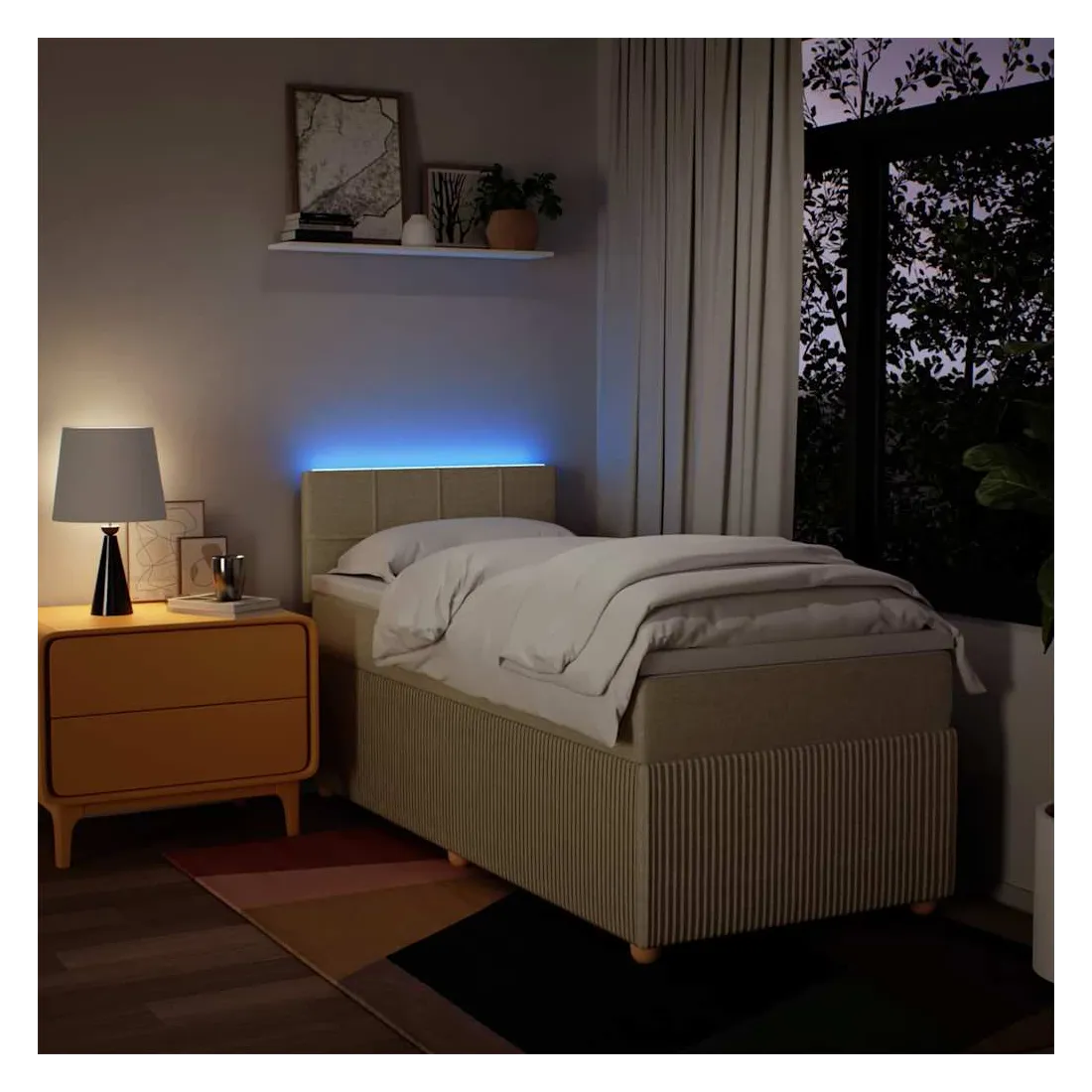 Utilisez ce lit à sommier pour profiter d'une nuit de sommeil réparatrice ! Il vous offre une relaxation maximale et un sommeil agréable. Matériau doux et durable : le tissu en polyester allie douceur, respirabilité et durabilité, vous garantissant un confort et une convivialité ultimes.Matelas à ressorts ensachés : ce matelas à ressorts ensachés comporte des ressorts ensachés individuels qui fonctionnent indépendamment pour offrir un soutien personnalisé en réagissant uniquement à la pression exercée dans chaque zone. Cette conception empêche « l'enroulement » et réduit le transfert de mouvement par rapport aux matelas traditionnels à ressorts ouverts. Chaque ressort ensaché soutient le corps individuellement.Lumières LED pour une ambiance agréable : ce lit est équipé de lumières LED qui peuvent être facilement réglées pour créer un spectacle lumineux personnalisé. Vous pouvez personnaliser les modes, les couleurs et la luminosité pour améliorer l'ambiance de votre espace intérieur.Surmatelas confortable : ce surmatelas améliore le soutien et le confort grâce à sa surface douce et respirante, tout en prolongeant la durée de vie de votre matelas. Sa housse amovible permet un lavage facile, ce qui facilite l'entretien. Bon à savoir :Ce produit est doté d'un connecteur USB qui nécessite une source d'alimentation USB de 5V certifiée (non incluse).Pour des raisons d'hygiène, le matelas ne peut pas être retourné si l'emballage est retiré ou ouvert.Seule la partie avec un symbole de ciseaux peut être coupée et seule la partie avec l'USB continuera à fonctionner comme avant.