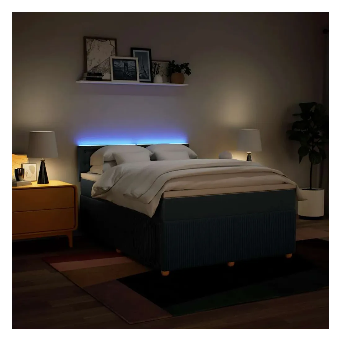Utilisez ce lit à sommier pour profiter d'une nuit de sommeil réparatrice ! Il vous offre une relaxation maximale et un sommeil agréable. Matériau doux et durable : le tissu en polyester allie douceur, respirabilité et durabilité, vous garantissant un confort et une convivialité ultimes.Matelas à ressorts ensachés : ce matelas à ressorts ensachés comporte des ressorts ensachés individuels qui fonctionnent indépendamment pour offrir un soutien personnalisé en réagissant uniquement à la pression exercée dans chaque zone. Cette conception empêche « l'enroulement » et réduit le transfert de mouvement par rapport aux matelas traditionnels à ressorts ouverts. Chaque ressort ensaché soutient le corps individuellement.Lumières LED pour une ambiance agréable : ce lit est équipé de lumières LED qui peuvent être facilement réglées pour créer un spectacle lumineux personnalisé. Vous pouvez personnaliser les modes, les couleurs et la luminosité pour améliorer l'ambiance de votre espace intérieur.Surmatelas confortable : ce surmatelas améliore le soutien et le confort grâce à sa surface douce et respirante, tout en prolongeant la durée de vie de votre matelas. Sa housse amovible permet un lavage facile, ce qui facilite l'entretien. Bon à savoir :Ce produit est doté d'un connecteur USB qui nécessite une source d'alimentation USB de 5V certifiée (non incluse).Pour des raisons d'hygiène, le matelas ne peut pas être retourné si l'emballage est retiré ou ouvert.Seule la partie avec un symbole de ciseaux peut être coupée et seule la partie avec l'USB continuera à fonctionner comme avant.