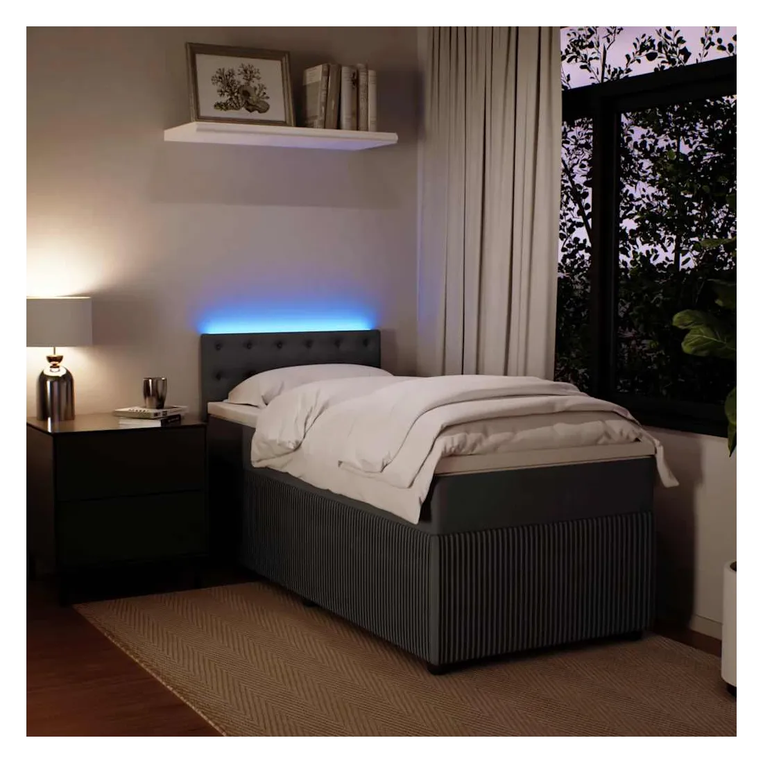 Utilisez ce lit à sommier pour profiter d'une nuit de sommeil réparatrice ! Il vous offre une relaxation maximale et un sommeil agréable. Matériau doux et confortable : le tissu en velours présente une surface douce et lisse qui offre une sensation agréable contre la peau, vous apportant chaleur et confort ultime.Matelas à ressorts ensachés : ce matelas à ressorts ensachés comporte des ressorts ensachés individuels qui fonctionnent indépendamment pour offrir un soutien personnalisé en réagissant uniquement à la pression exercée dans chaque zone. Cette conception empêche « l'enroulement » et réduit le transfert de mouvement par rapport aux matelas traditionnels à ressorts ouverts. Chaque ressort ensaché soutient le corps individuellement.Lumières LED pour une ambiance agréable : ce lit est équipé de lumières LED qui peuvent être facilement réglées pour créer un spectacle lumineux personnalisé. Vous pouvez personnaliser les modes, les couleurs et la luminosité pour améliorer l'ambiance de votre espace intérieur.Surmatelas confortable : ce surmatelas améliore le soutien et le confort grâce à sa surface douce et respirante, tout en prolongeant la durée de vie de votre matelas. Sa housse amovible permet un lavage facile, ce qui facilite l'entretien. Bon à savoir :Ce produit est doté d'un connecteur USB qui nécessite une source d'alimentation USB de 5V certifiée (non incluse).Pour des raisons d'hygiène, le matelas ne peut pas être retourné si l'emballage est retiré ou ouvert.Seule la partie avec un symbole de ciseaux peut être coupée et seule la partie avec l'USB continuera à fonctionner comme avant.