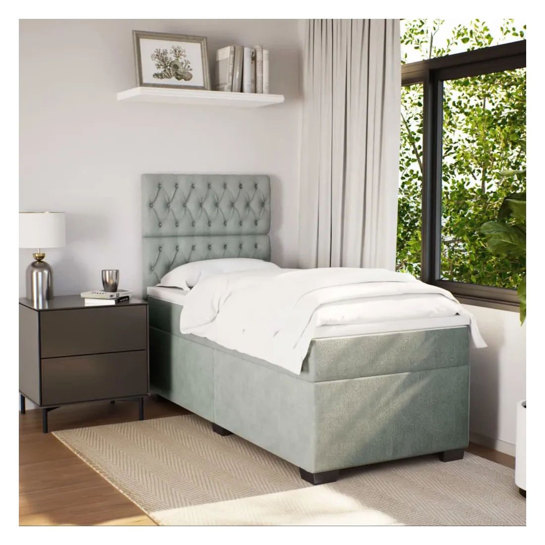 Utilisez ce lit à sommier pour profiter d'une nuit de sommeil réparatrice ! Il vous offre une relaxation maximale et un sommeil agréable. Matériau doux et confortable : le tissu en velours présente une surface douce et lisse qui offre une sensation agréable contre la peau, vous apportant chaleur et confort ultime.Matelas à ressorts ensachés : ce matelas à ressorts ensachés comporte des ressorts ensachés individuels qui fonctionnent indépendamment pour offrir un soutien personnalisé en réagissant uniquement à la pression exercée dans chaque zone. Cette conception empêche « l'enroulement » et réduit le transfert de mouvement par rapport aux matelas traditionnels à ressorts ouverts. Chaque ressort ensaché soutient le corps individuellement.Tête de lit réglable en hauteur : la tête de lit est réglable en hauteur pour s'adapter à vos préférences.Surmatelas confortable : ce surmatelas améliore le soutien et le confort grâce à sa surface douce et respirante, tout en prolongeant la durée de vie de votre matelas. Sa housse amovible permet un lavage facile, ce qui facilite l'entretien.Lattes pour un soutien optimal : le cadre de lit est complété par des lattes pour offrir un soutien et une respirabilité essentiels à votre matelas. Bon à savoir :Pour des raisons d'hygiène, le matelas ne peut pas être retourné si l'emballage est retiré ou ouvert.