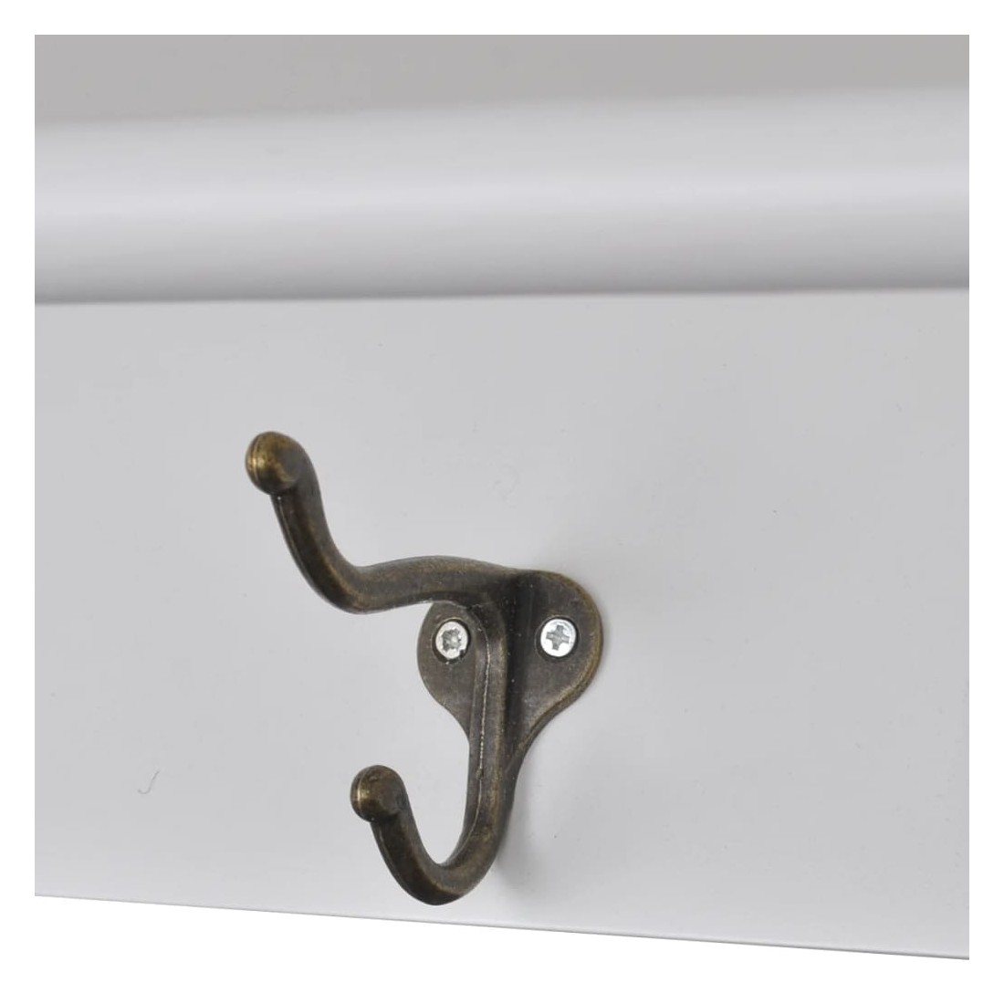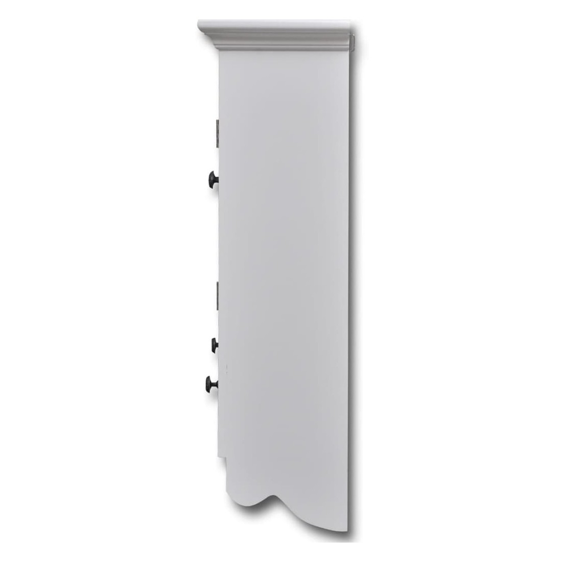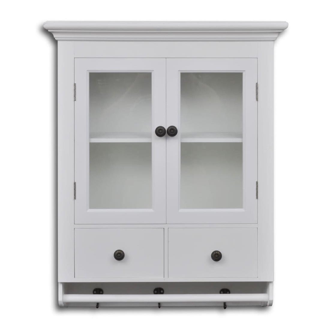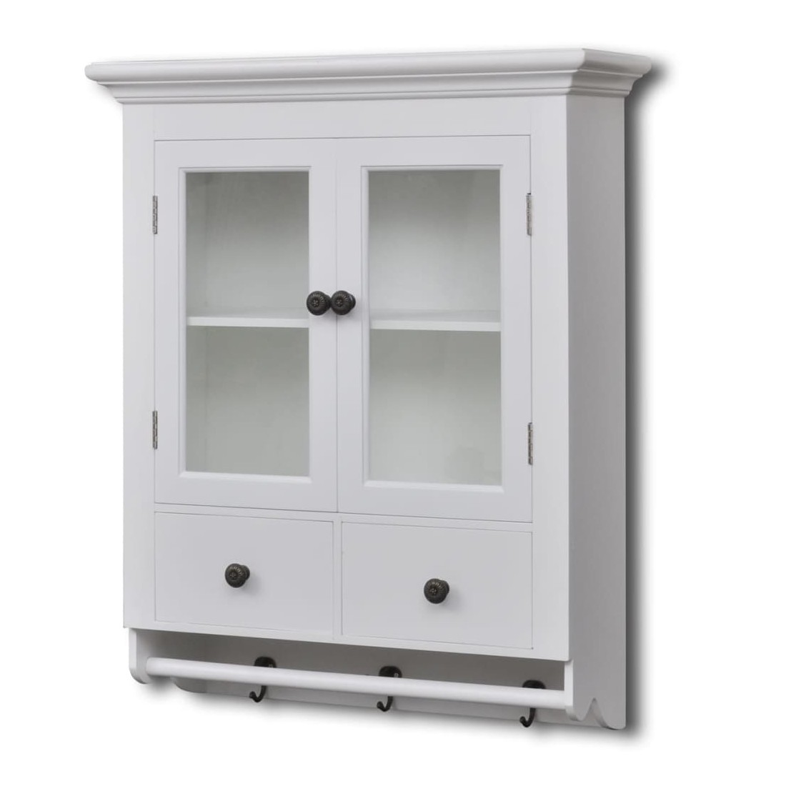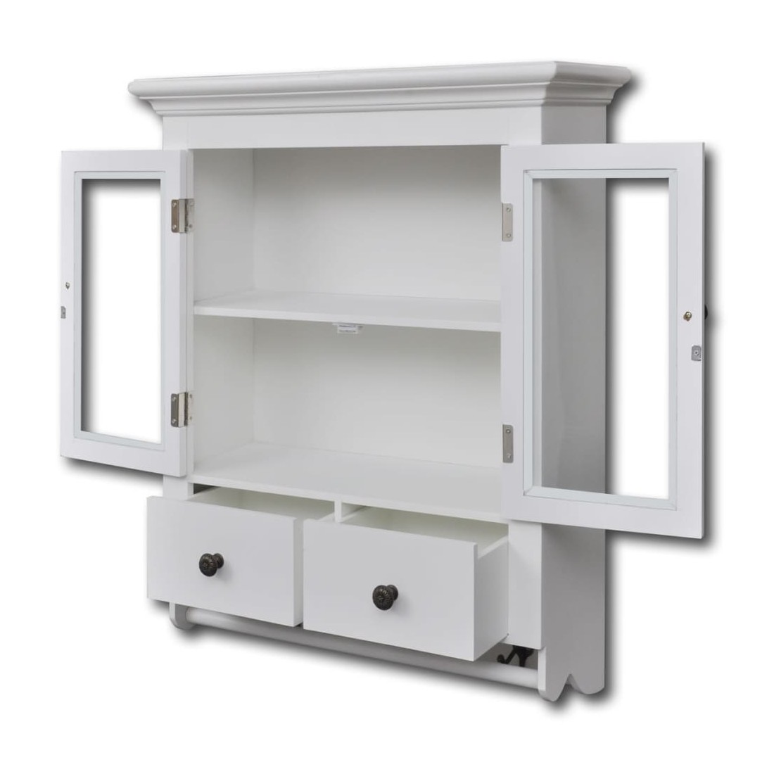 Cet élégant placard mural à l'aspect antique vous donnera amplement d'espace de rangement dans la cuisine et aidera à garder les choses bien organisées. Le placard a deux tiroirs et deux étagères, ce qui vous permet de ranger facilement les céréales, les épices, les collations, les conserves et plus encore. Il est équipé de 2 portes vitrées et de 2 tiroirs qui s'ouvrent facilement pour que vous puissiez obtenir rapidement ce dont vous avez besoin. Les crochets et les patères peuvent être utilisés pour des tasses ou des serviettes. Fabriqué en bois de haute qualité, ce meuble est conçu pour résister à un environnement humide. La finition de peinture blanche facilite le nettoyage avec un chiffon humide.