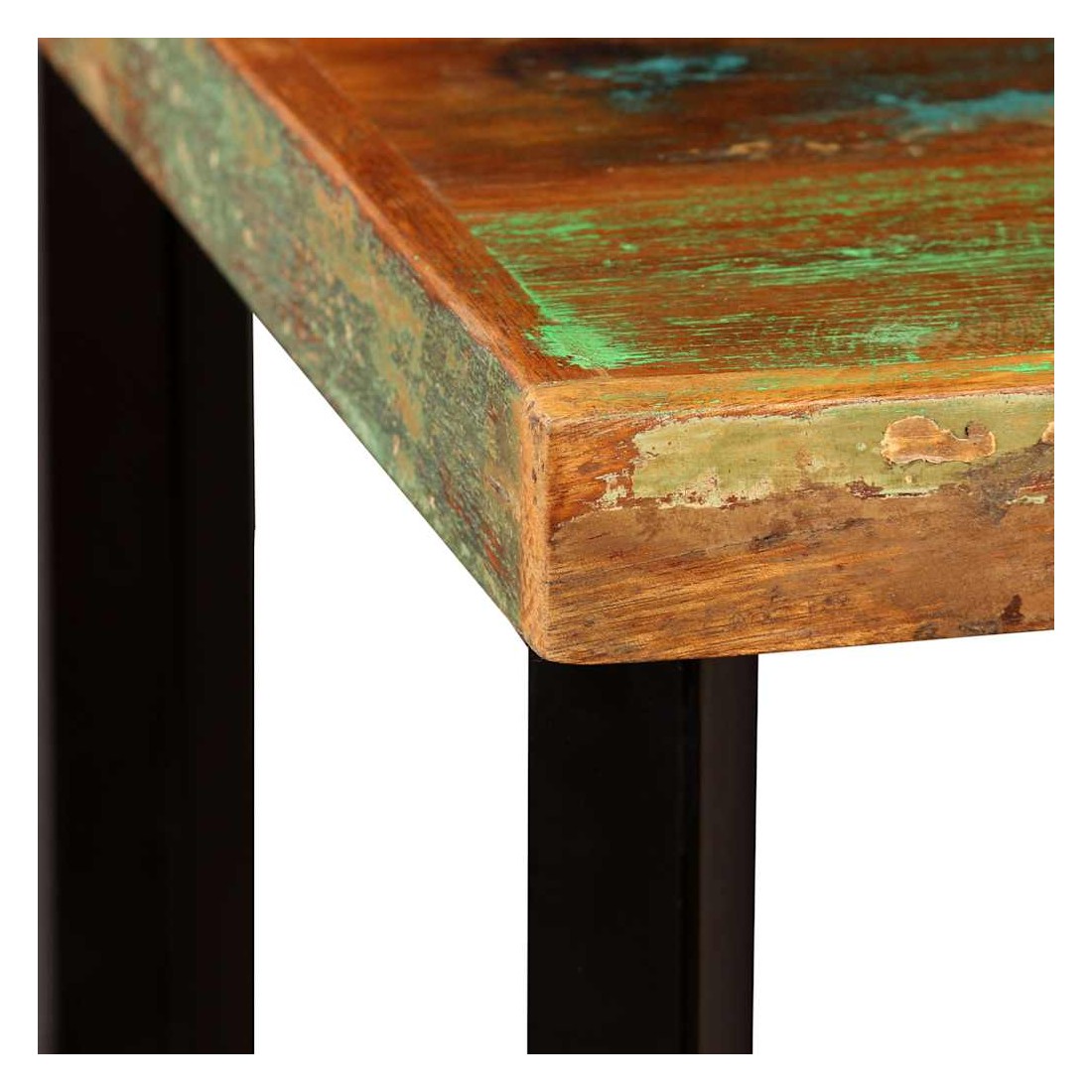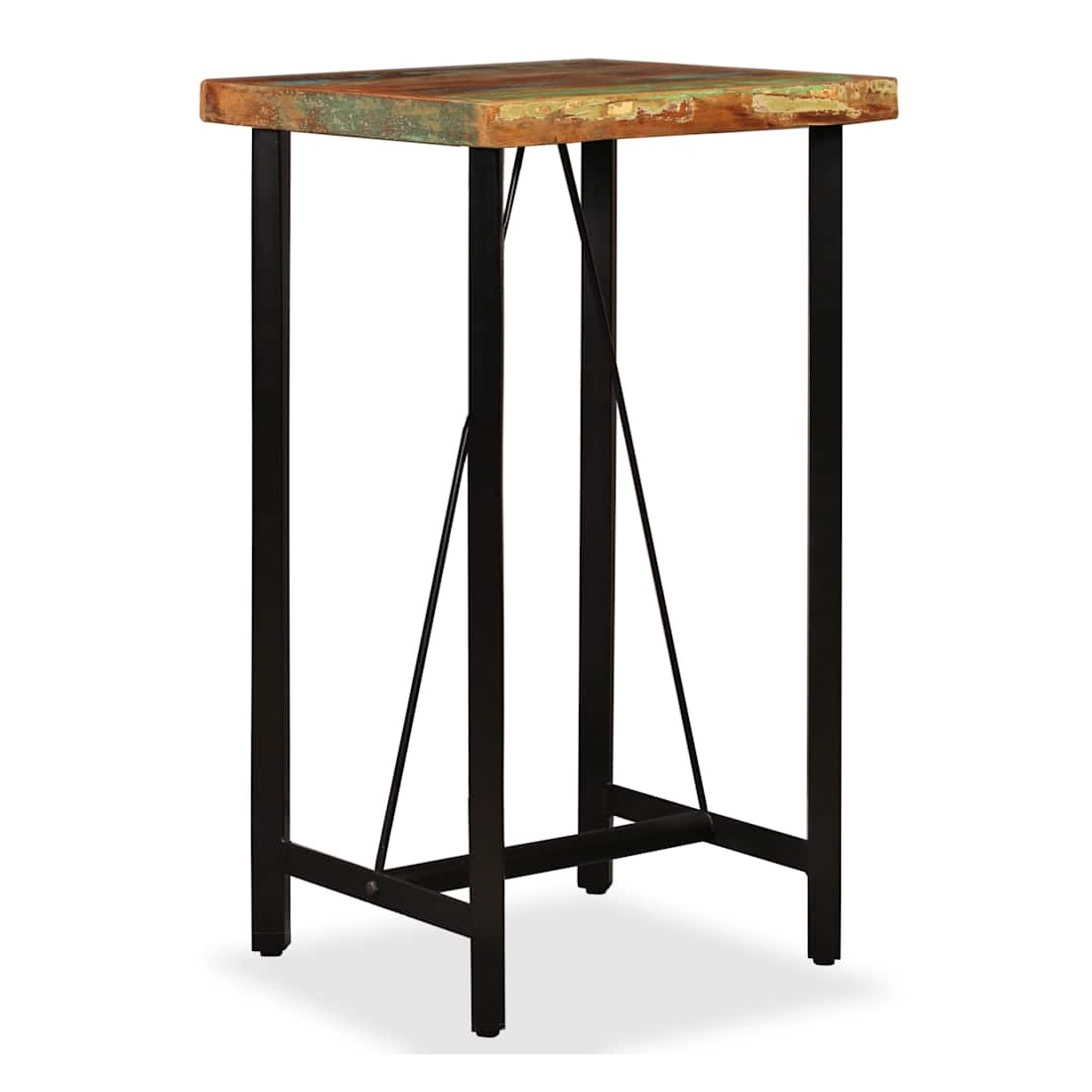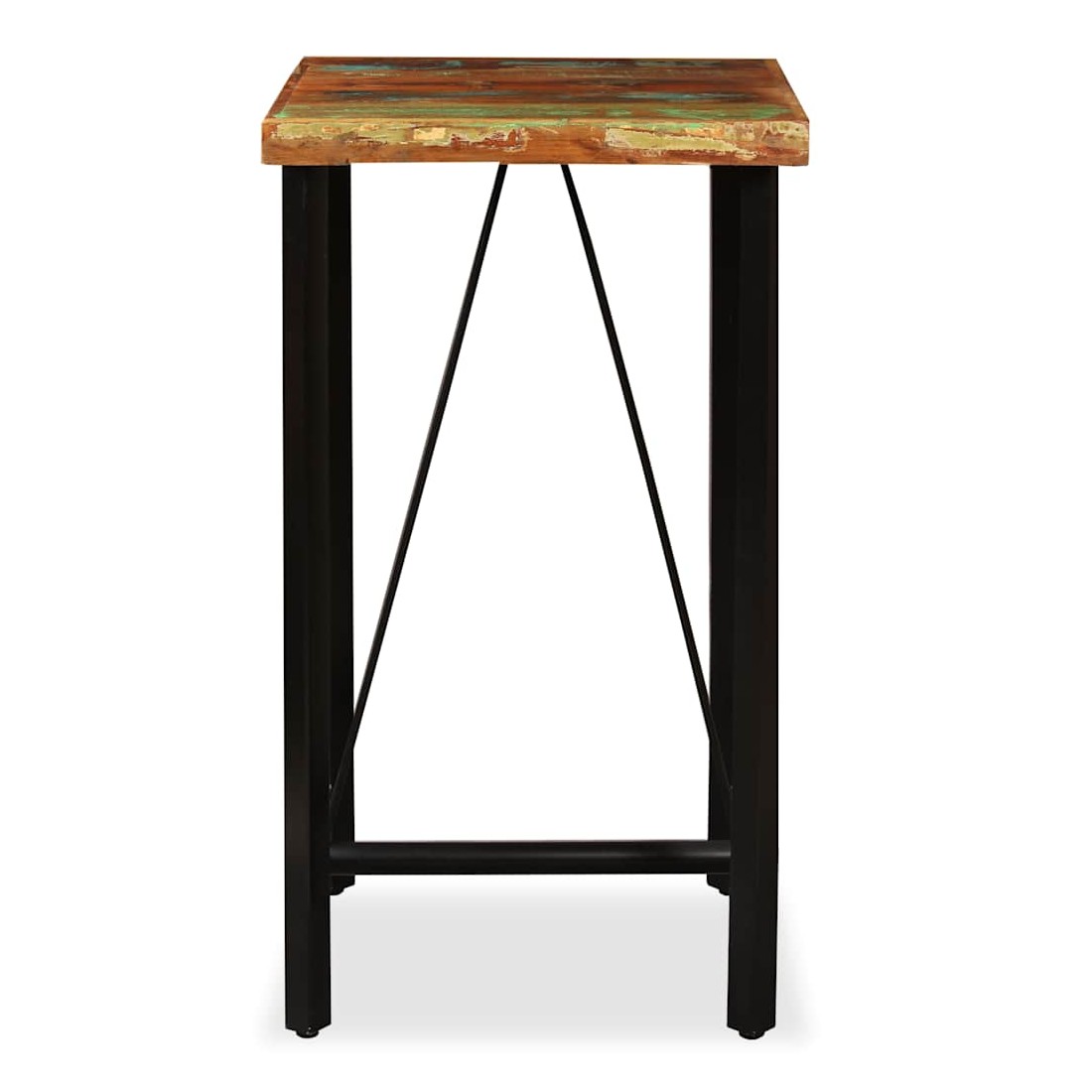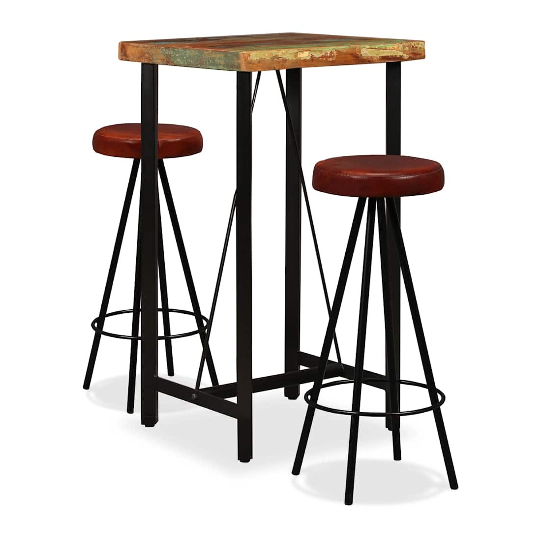 Cet ensemble de bar cool a un style industriel et sera un supplément distinctif à n'importe quelle maison, bar ou restaurant. La table de bar est faite de bois de récupération massif, ce qui signifie qu'elle a les caractéristiques de différents bois comme le teck, le bois de manguier, l'acacia, etc. Le bois de récupération est solide, stable, durable et beau. Des signes d'usure et d'artisanat donnent à chaque pièce un style unique. Il est entièrement fait à la main. Les pieds en acier robuste rendent la table de bar très robuste et durable et s'ajoutent à son style industriel spectaculaire. Remarque importante : Les grains et les couleurs du bois peuvent varier d'une pièce à l'autre, ce qui rend chaque pièce unique ; la livraison est aléatoire. Les tabourets de bar sont recouverts de cuir véritable doux au toucher, ce qui rend les tabourets extrêmement durables et confortables. Les pieds en acier font les tabourets très robustes et ajoutent à leur style industriel spectaculaire. La livraison comprend 1 table de bar et 2 tabourets de bar. L'assemblage est facile.