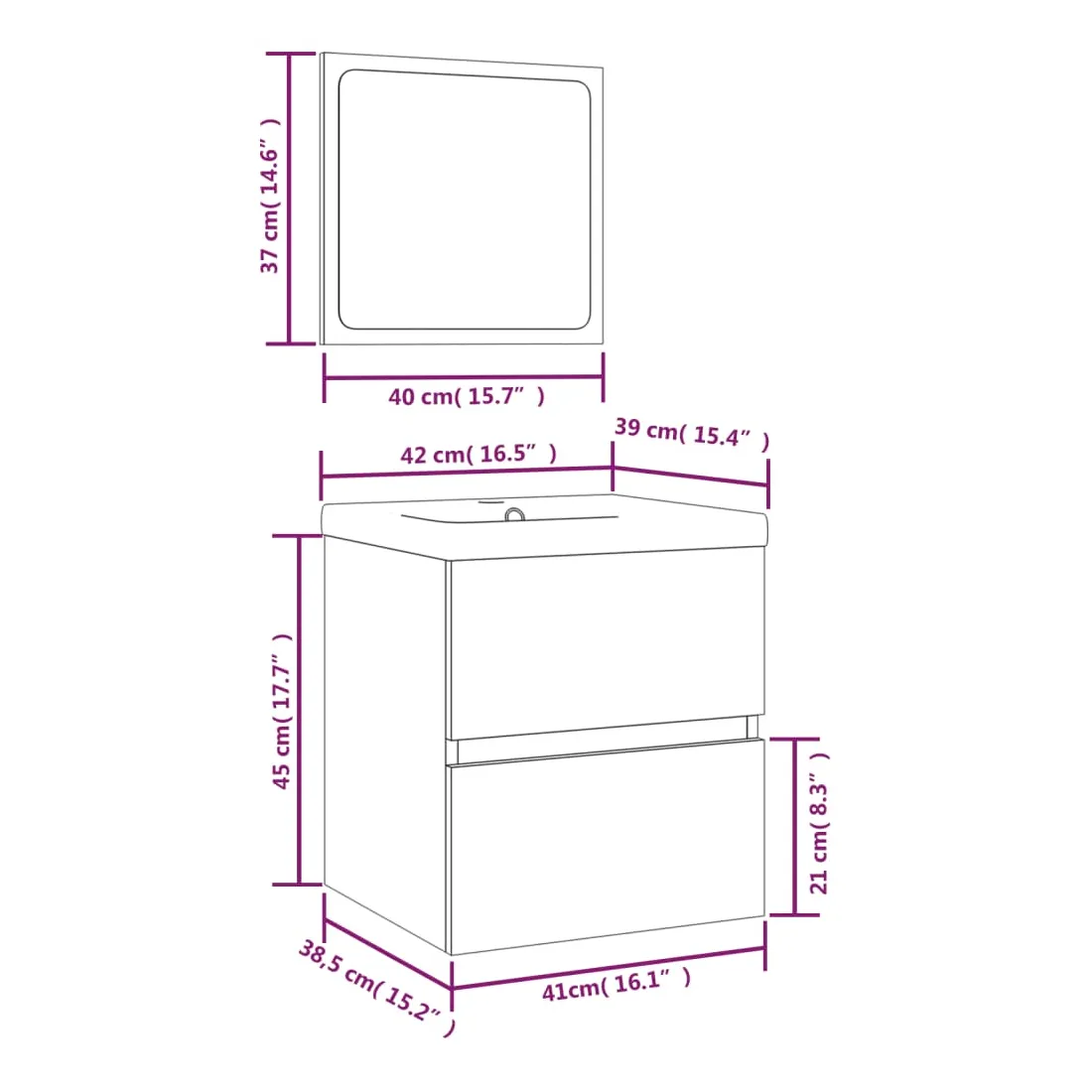 Cette armoire lavabo de salle de bain avec bassin intégré et miroir, doté d'un espace de rangement spacieux, est un supplément chic et intemporel à toute salle de bain ou salle d'eau. Matériau robuste : le meuble sous évier est fabriqué en bois d'ingénierie, qui est d'une qualité exceptionnelle avec une surface lisse et se caractérise également par sa solidité, stabilité et résistance à l'humidité.Grand espace de rangement : le meuble lavabo de salle de bain dispose d'un tiroir, offrant un grand espace de rangement pour ranger des articles dans votre salle de bain.Design pratique : le dessus de ce meuble de salle de bain est idéal pour placer le lavabo.Fonction murale : l'armoire de salle de bain et le miroir de maquillage peuvent être fixés au mur pour plus d'espace de rangement. De cette façon, vous pouvez maximiser votre espace au sol et garder la zone propre.Fonction de trop-plein : un trop-plein est également équipé pour vidanger l'eau lorsqu'il est trop plein. Remarque :Les vis et les chevilles pour l'intérieur du mur ne sont pas incluses. Recherchez et utilisez des vis et des chevilles adaptées à vos murs. Si vous n'êtes pas sûr, demandez conseil à un professionnel. Lisez et suivez attentivement chaque étape des instructions.Le robinet et le vidange ne sont pas inclus dans la livraison.Chaque produit est livré avec un manuel de montage dans la boîte pour un montage facile.