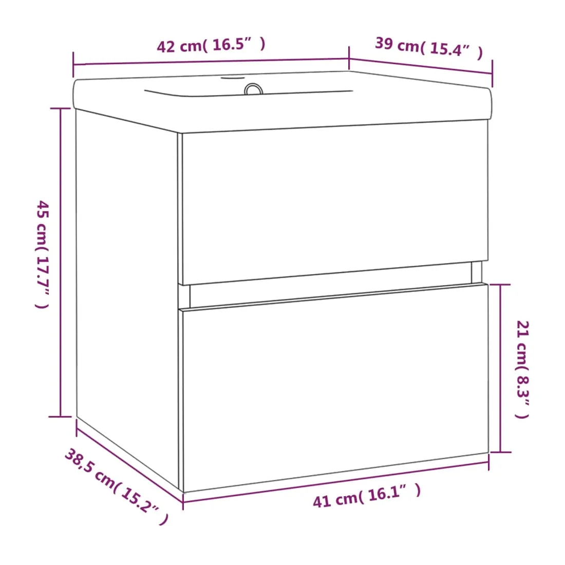 Cet élégant meuble-lavabo avec bassin intégré, avec un espace de rangement spacieux, est un excellent supplément à votre salle de bain, ce qui lui donne une apparence ordonnée et saisissante ! Matériau robuste : le meuble sous évier est fabriqué en bois d'ingénierie, qui est d'une qualité exceptionnelle avec une surface lisse et se caractérise également par sa solidité, stabilité et résistance à l'humidité.Grand espace de rangement : le meuble lavabo de salle de bain dispose d'un tiroir, offrant un grand espace de rangement pour ranger des articles dans votre salle de bain.Design pratique : le dessus de ce meuble de salle de bain est idéal pour placer le lavabo.Fonction murale : l'armoire de salle de bain peut être fixée au mur pour ajouter de l'espace de stockage supplémentaire. De cette façon, vous pouvez maximiser votre espace au sol et garder la zone propre.Fonction de trop-plein : un trop-plein est également équipé pour vidanger l'eau lorsqu'il est trop plein. Remarque :Les vis et les chevilles pour l'intérieur du mur ne sont pas incluses. Recherchez et utilisez des vis et des chevilles adaptées à vos murs. Si vous n'êtes pas sûr, demandez conseil à un professionnel. Lisez et suivez attentivement chaque étape des instructions.Le robinet et le vidange ne sont pas inclus dans la livraison.Chaque produit est livré avec un manuel de montage dans la boîte pour un montage facile.