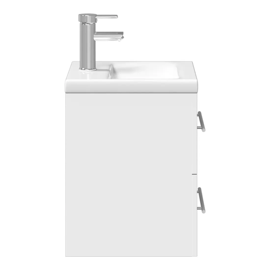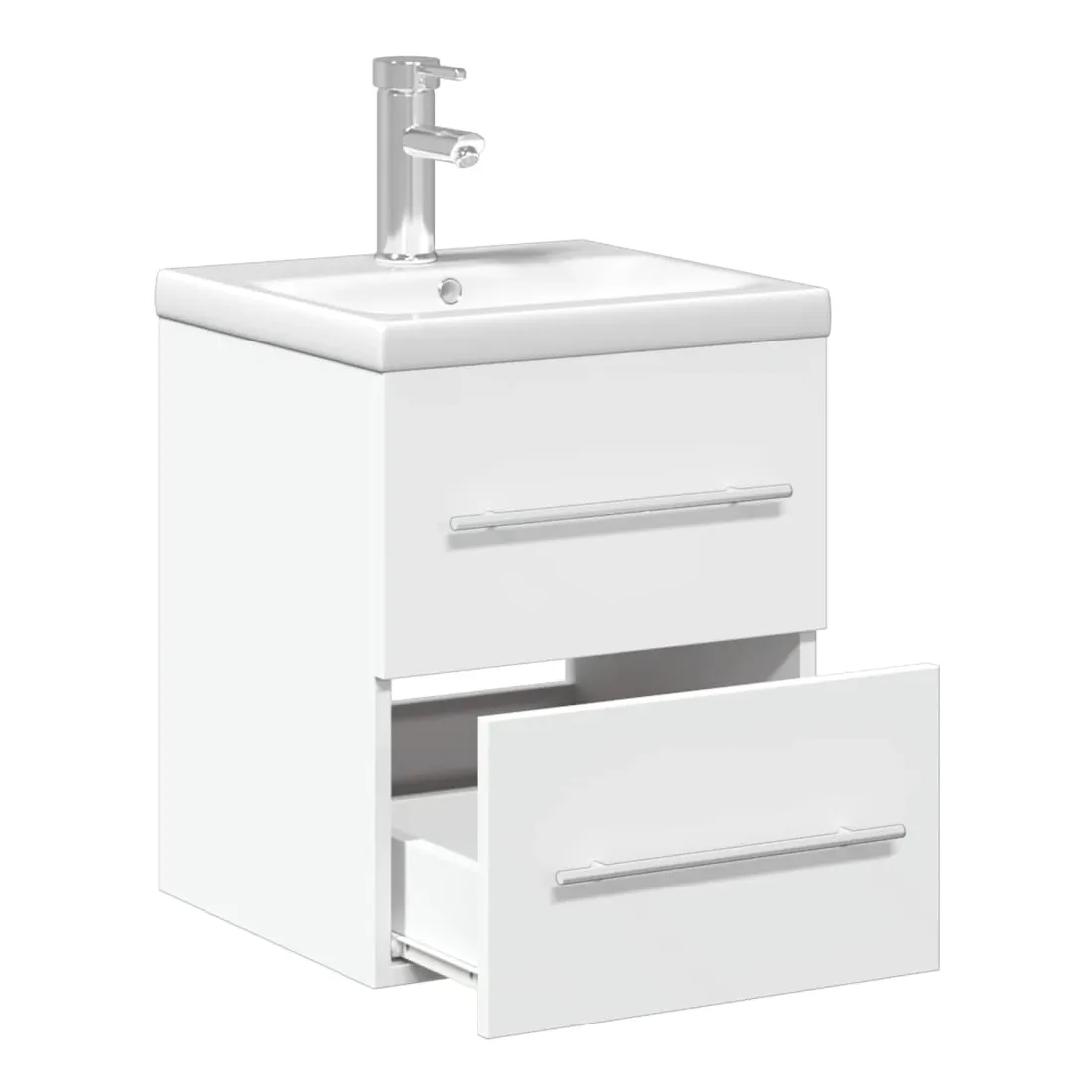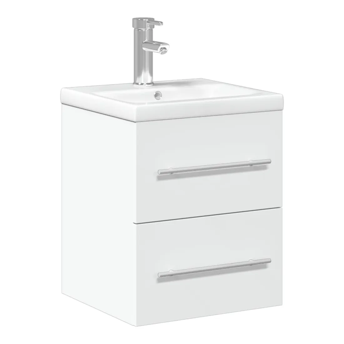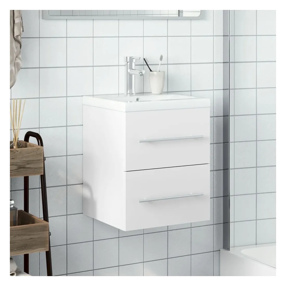 Cet élégant meuble-lavabo de salle de bain avec bassin intégré, avec un espace de rangement spacieux, est un excellent supplément à votre salle de bain, ce qui lui donne une apparence ordonnée et saisissante ! Matériau robuste : le meuble sous évier est fabriqué en bois d'ingénierie, qui est d'une qualité exceptionnelle avec une surface lisse et se caractérise également par sa solidité, stabilité et résistance à l'humidité.Grand espace de rangement : le meuble lavabo de salle de bain dispose de 1 tiroir, offrant un grand espace de rangement pour ranger des articles dans votre salle de bain.Fonction murale : l'armoire de salle de bain peut être fixée au mur pour ajouter de l'espace de stockage supplémentaire. De cette façon, vous pouvez maximiser votre espace au sol et garder la zone propre.Lavabo élégant : le lavabo de la salle de bain est fabriqué en céramique lisse, durable et facile à nettoyer. La surface vitrée apporte un design à la fois moderne et élégant.Trop-plein pratique : le lavabo est équipé d'une option anti-débordement qui permet d'évacuer l'eau lorsqu'il est trop plein. Bon à savoir :Les vis et les chevilles pour l'intérieur du mur ne sont pas incluses. Recherchez et utilisez des vis et des chevilles adaptées à vos murs. Si vous n'êtes pas sûr, demandez conseil à un professionnel. Lisez et suivez attentivement chaque étape des instructions.Le robinet et l'égouttoir à pousser avec fonction de trop-plein sont inclus.Le robinet est un robinet d'eau chaude et froide, et si vous avez besoin d'eau chaude, un chauffe-eau doit être connecté.