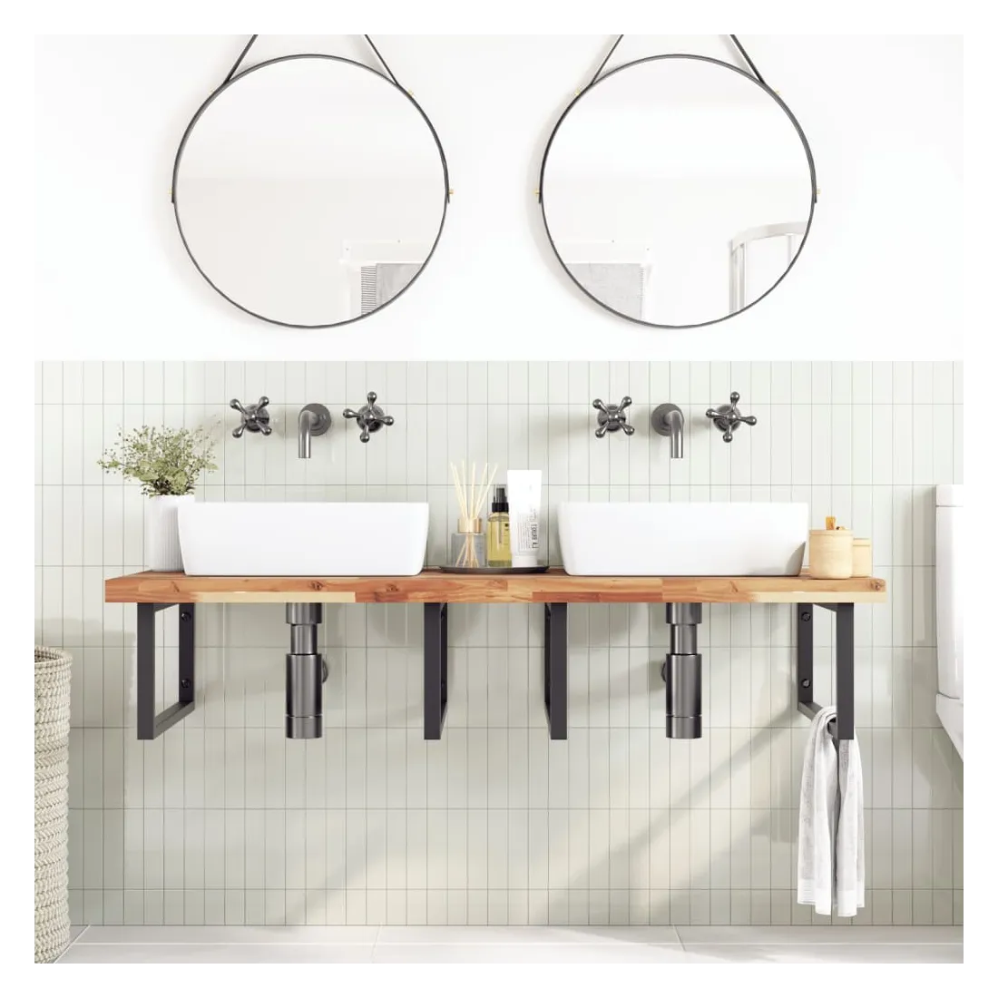 Améliorez votre salle de bain avec ce dessus de meuble-lavabo en bois pour une touche de charme rustique ! Matériau robuste et stable : le bois d'acacia massif est connu pour sa solidité et sa durabilité. Ses couleurs variées et ses grains uniques lui confèrent un aspect attrayant. Avec une excellente stabilité et résistance aux intempéries, il est idéal pour la fabrication de mobilier d'intérieur et d'extérieur.Surface finie à l’huile : ce dessus de meuble est fait de bois d'acacia avec une finition à l'huile qui le rend plus résistant à l'humidité et aux dégâts d'eau, tout en préservant son caractère unique.Utilisation polyvalente : ce comptoir multifonctionnel peut être associé à différentes bases pour un large éventail d'utilisations, telles qu'un poste de travail dans la cuisine, un établi dans le garage, une étagère dans la salle de bain ou un bureau.Entretien facile : grâce à sa surface lisse, le dessus est facile à nettoyer avec un chiffon humide. Bon à savoir :Chaque article est unique, avec des variations de couleurs et de grains. La livraison est aléatoire, ce qui garantit l'exclusivité et l'individualité de votre produit.Il est recommandé de réappliquer une finition à l’huile pour conserver sa qualité et son apparence au moins une fois par an.