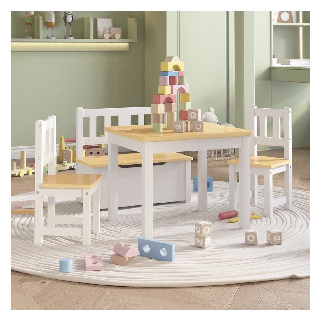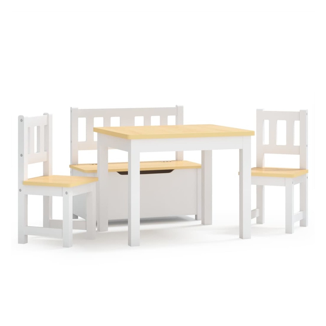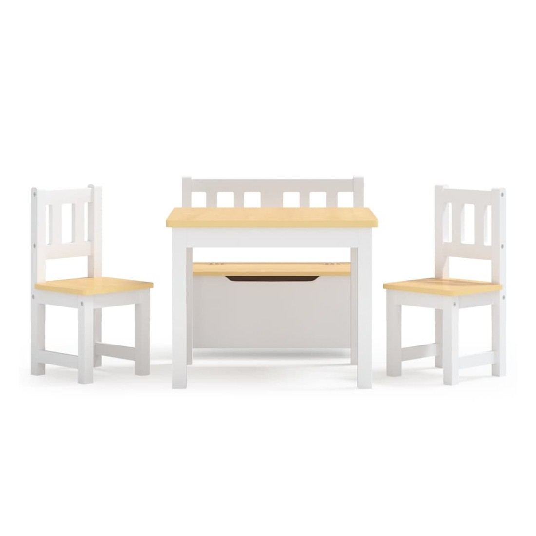Avec cet ensemble de table et de chaises, votre enfant et son ami peuvent s'asseoir à table et peindre, bricoler, manger et même jouer ensemble. Cet ensemble de table et de chaises est construit avec du MDF durable, ce qui le rend facile à nettoyer et à entretenir. La table peut être utilisée pour jouer à des puzzles, des jeux de société, faire des travaux manuels et des collations pour le dîner en plus de la lecture et de l'écriture de routine. Le banc a une combinaison parfaite d'assise et d'espace de rangement. Le coffre de rangement intégré avec couvercle est idéal pour bien ranger les jouets et autres objets. Les bords et les coins de la table et des chaises sont arrondis, assurant la sécurité des enfants. C'est un cadre parfait pour vos enfants à utiliser à la maison, à l'école,