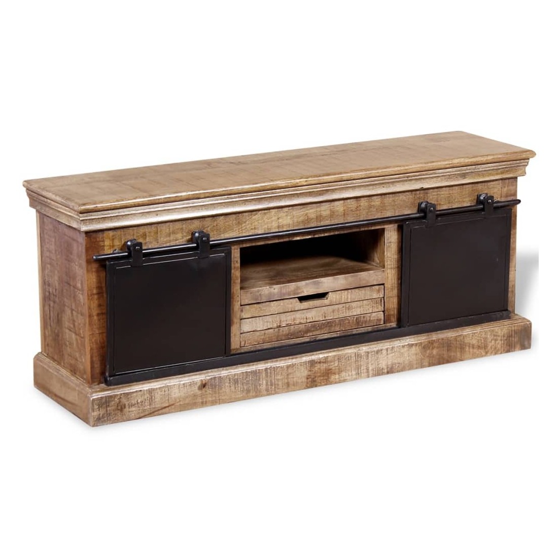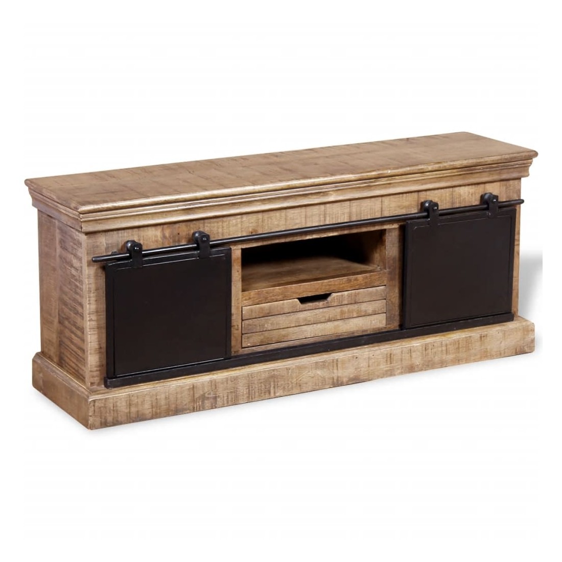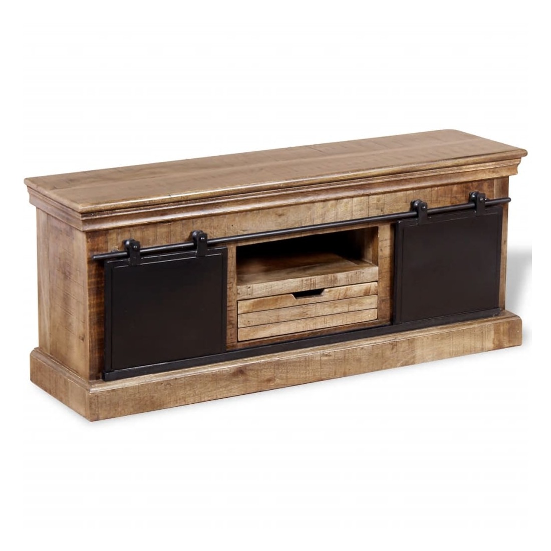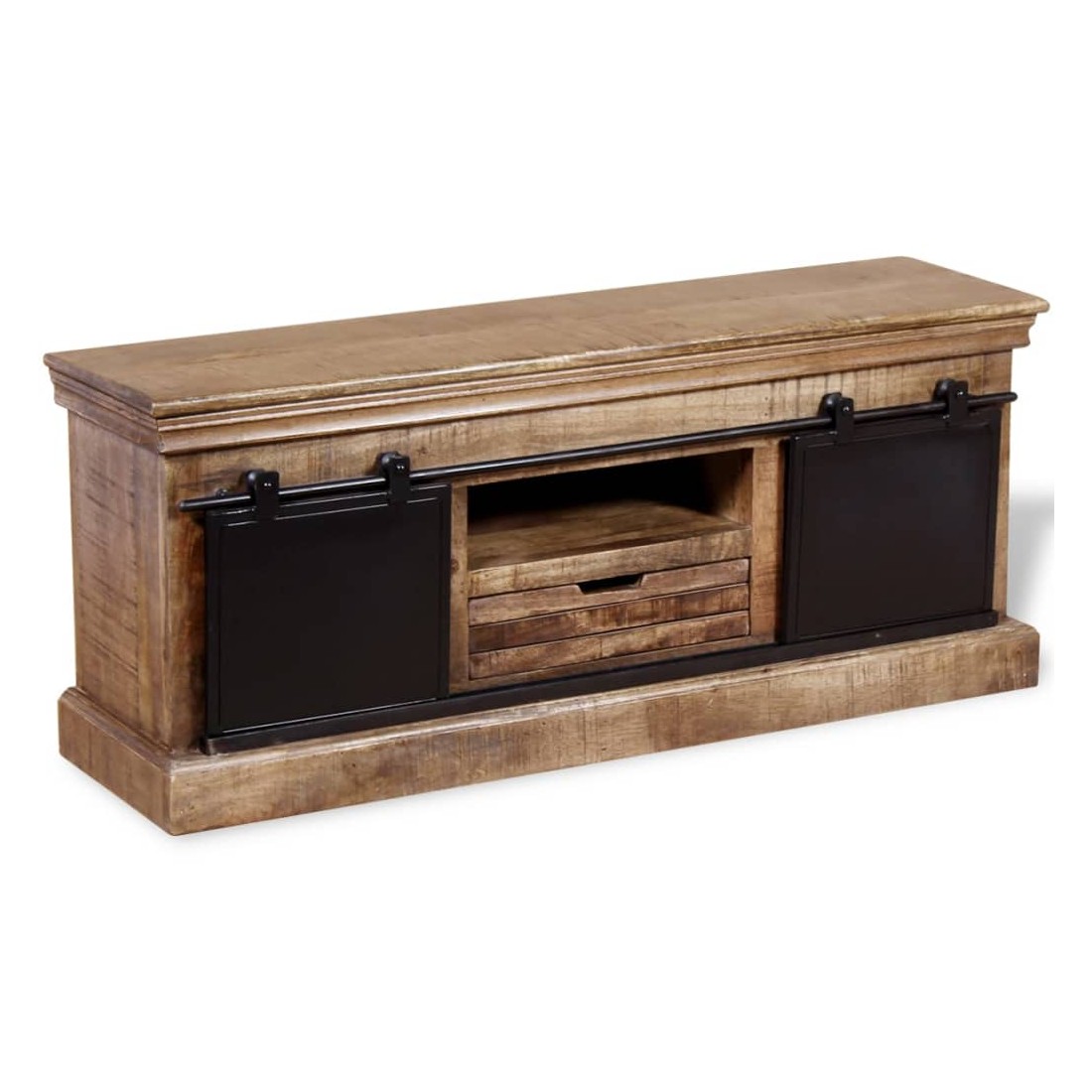 Ce meuble TV industriel excentrique est très pratique et dispose d'un espace de stockage suffisant. Il peut également être utilisé comme un buffet, un placard, une armoire latérale, etc. Il fera un accessoire décoratif unique à votre salon ou chambre. Ce meuble TV est fait en bois de manguier massif, ce qui signifie que ce meuble est robuste, stable et durable. Ses étagères ont de la place pour placer vos appareils multimédias, magazines, etc. Le meuble possède également deux compartiments, chacun avec une porte coulissante, offrant assez de place pour ranger vos CD et vos magazines. Le design en fer forgé de la porte coulissante contribue à sa solidité et rend ce meuble absolument saisissant et unique. Les grains visibles rendent chaque meuble unique et légèrement différent du suivant. Le meuble TV est entièrement fait à la main et la qualité de l'artisanat contribue à son style rétro spectaculaire. Chaque étape du processus est effectuée avec le plus grand soin, qu'il s'agisse du polissage ou du cirage. Remarque importante : les couleurs varient d'une pièce à l'autre, ce qui rend chacun de nos meubles TV unique. La livraison est aléatoire, ce qui garantit l'exclusivité et l'individualité de votre produit.