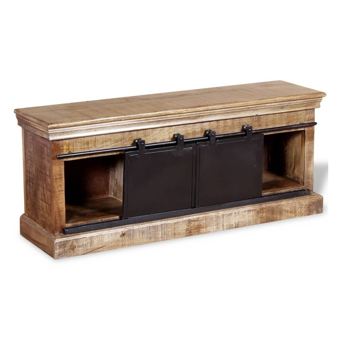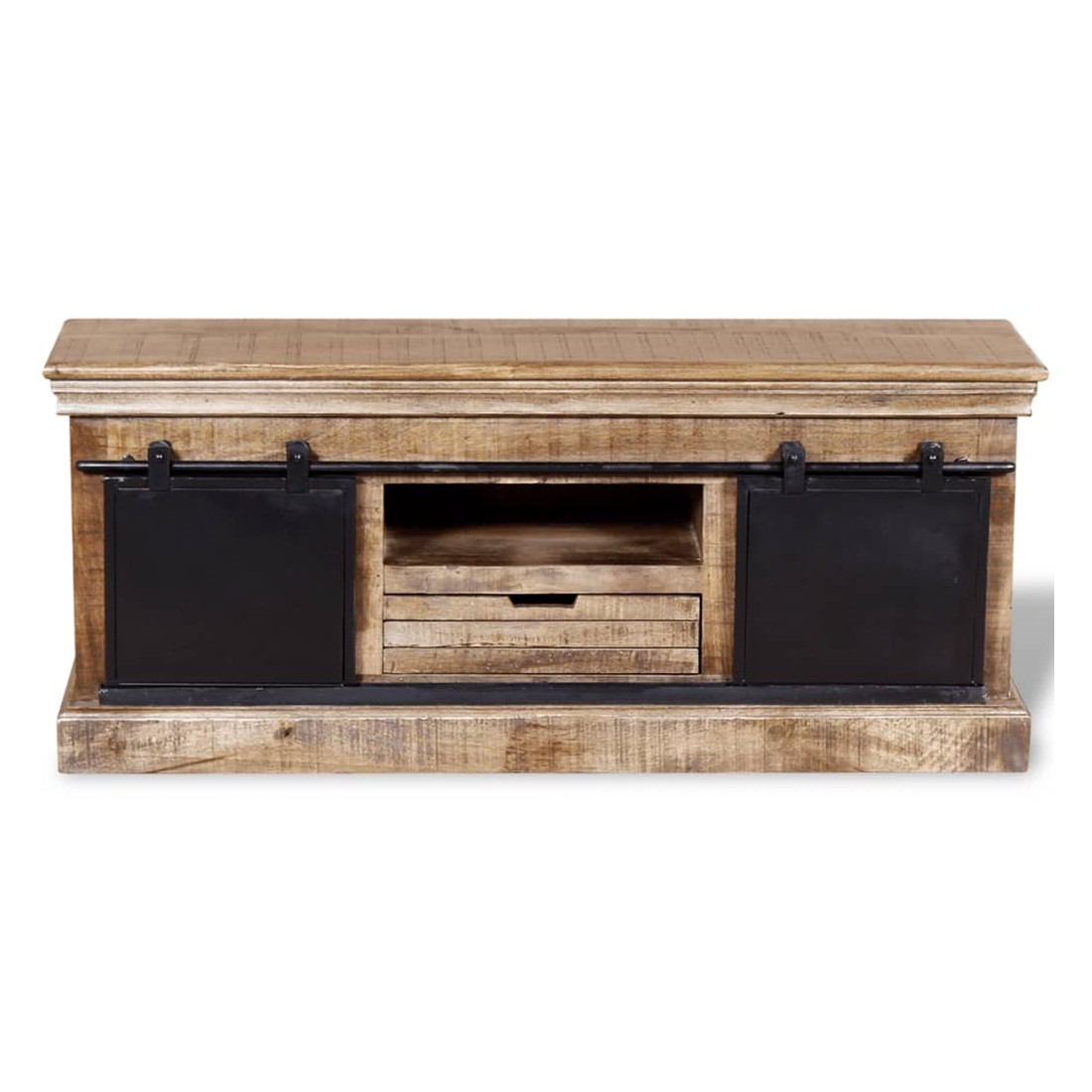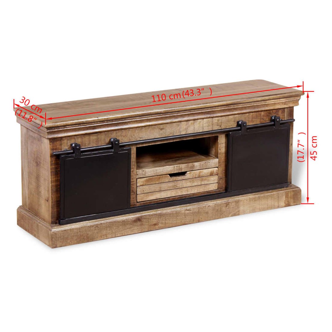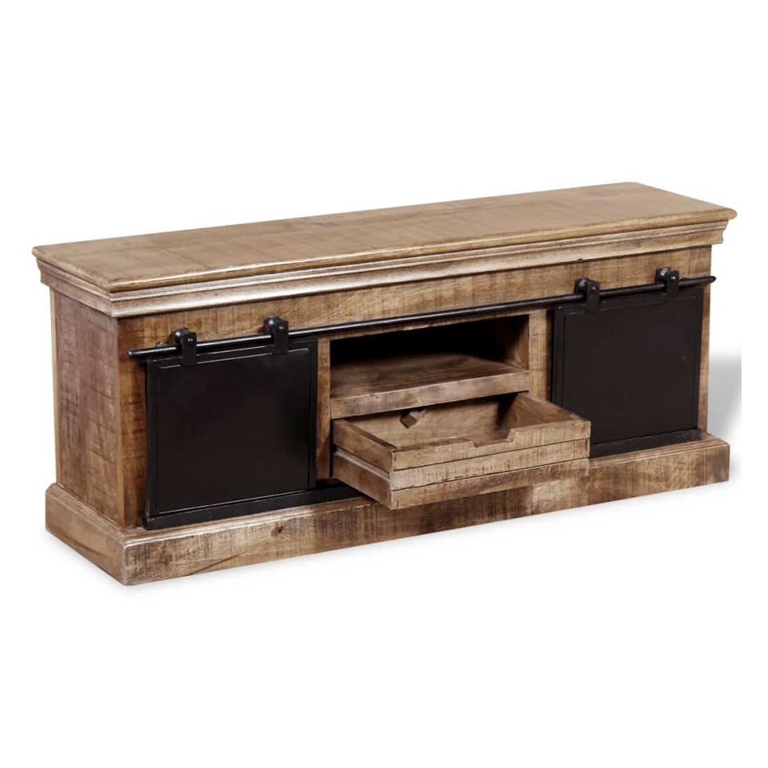 Ce meuble TV industriel excentrique est très pratique et dispose d'un espace de stockage suffisant. Il peut également être utilisé comme un buffet, un placard, une armoire latérale, etc. Il fera un accessoire décoratif unique à votre salon ou chambre. Ce meuble TV est fait en bois de manguier massif, ce qui signifie que ce meuble est robuste, stable et durable. Ses étagères ont de la place pour placer vos appareils multimédias, magazines, etc. Le meuble possède également deux compartiments, chacun avec une porte coulissante, offrant assez de place pour ranger vos CD et vos magazines. Le design en fer forgé de la porte coulissante contribue à sa solidité et rend ce meuble absolument saisissant et unique. Les grains visibles rendent chaque meuble unique et légèrement différent du suivant. Le meuble TV est entièrement fait à la main et la qualité de l'artisanat contribue à son style rétro spectaculaire. Chaque étape du processus est effectuée avec le plus grand soin, qu'il s'agisse du polissage ou du cirage. Remarque importante : les couleurs varient d'une pièce à l'autre, ce qui rend chacun de nos meubles TV unique. La livraison est aléatoire, ce qui garantit l'exclusivité et l'individualité de votre produit.