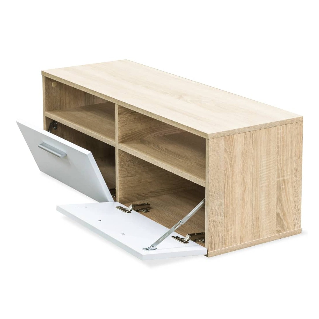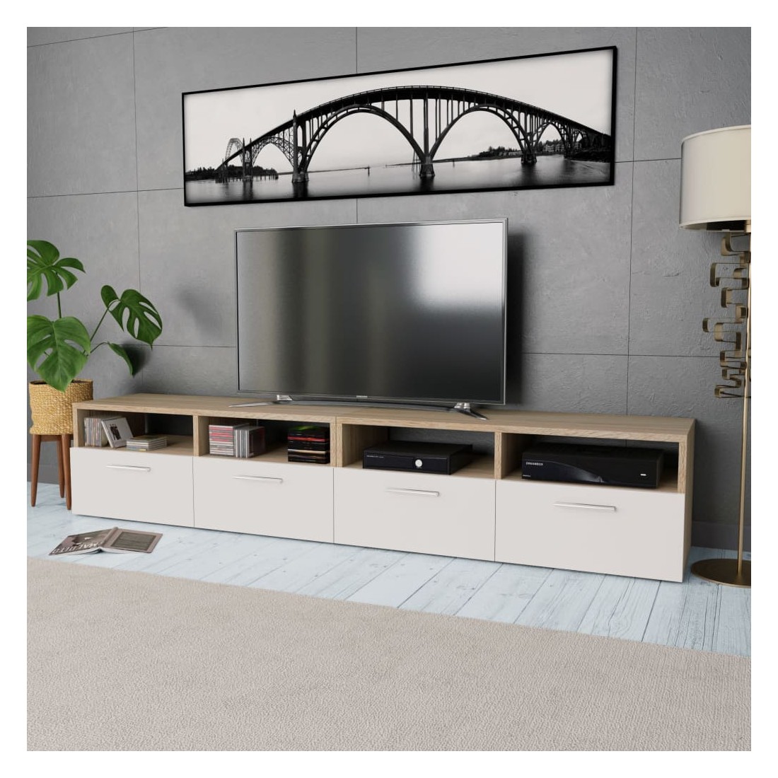 Les meubles TV modernes ont un design sobre et pratique et conviendront à n'importe quel décor de maison. Les meubles HiFi sont en bois d’ingénierie avec des bords en PVC et sont stables et durables. Chaque meuble a deux étagères ouvertes et deux armoires avec des portes s'ouvrant vers le bas qui ont amplement d'espace de rangement pour votre lecteur DVD, console de jeu, récepteur numérique ou vos supports média. Les meubles TV seront un excellent supplément à votre chambre à coucher ou salon. L'assemblage est facile. La livraison comprend 2 armoires TV.