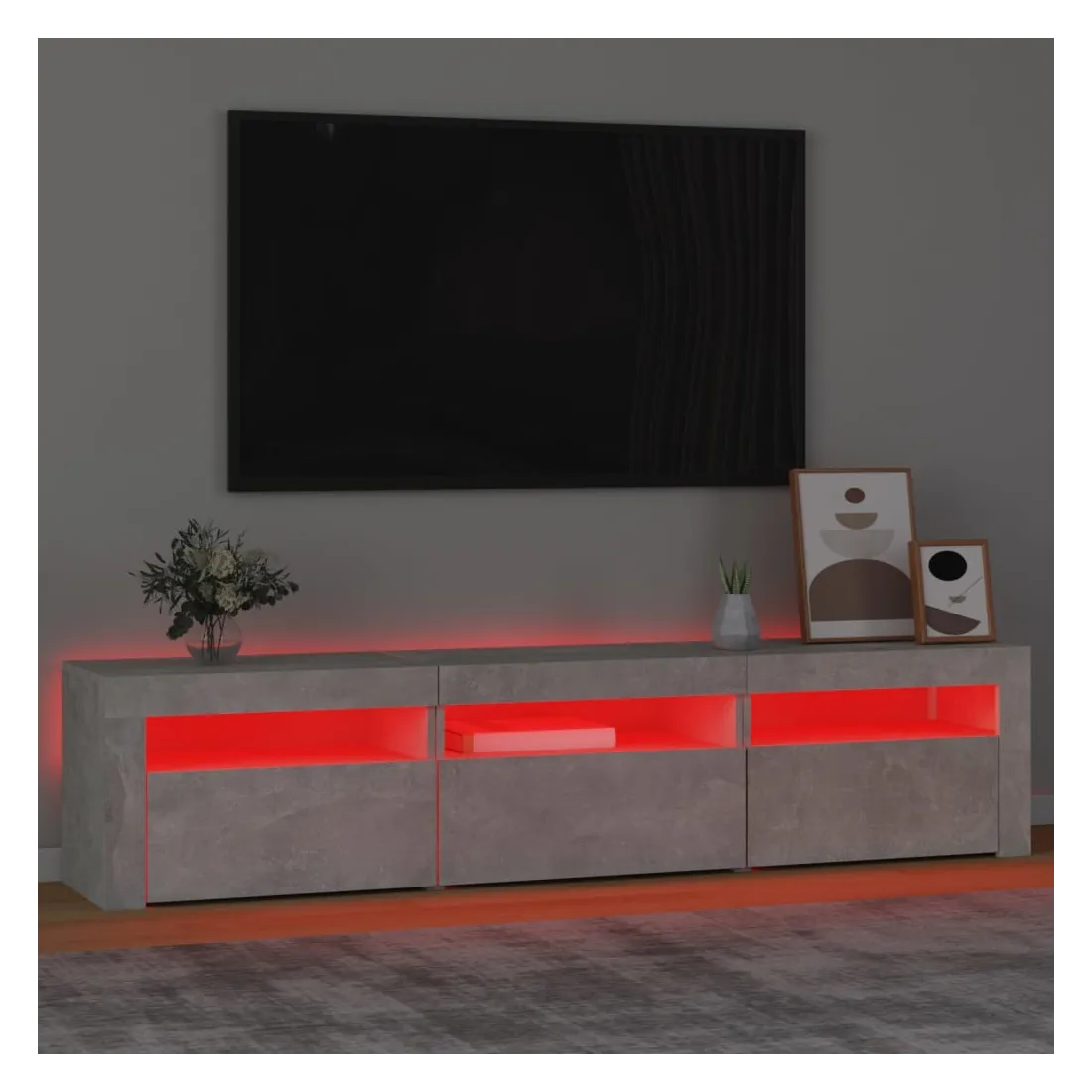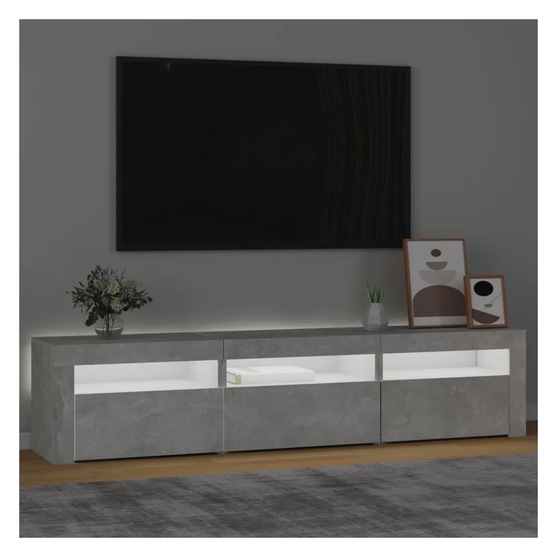 Avec un design à la fois tendance et pratique, ce meuble TV avec éclairage LED deviendra certainement un point central de votre pièce. Matériau pratique : le bois d'ingénierie est d'une qualité exceptionnelle avec une surface lisse et présente également résistance, stabilité et résistance à l'humidité. Lumières LED colorées : le meuble TV est doté de lumières LED RVB, qui ont différents menus pour changer la couleur des lumières et laisser la couleur s'ajuster automatiquement. Les lumières LED soulignent l'aspect moderne et contribuent à la sensation de tendance.Grand espace de rangement : le meuble TV offre un grand espace de rangement pour garder vos magazines, livres, télécommandes et autres petits objets bien organisés et à portée de main.Fonction d'affichage : le dessus robuste du meuble média est idéal pour exposer des objets décoratifs, des cadres photo et des plantes en pot. Remarque :Ce produit est doté d'un connecteur USB, mais la source d'alimentation certifiée de USB 5V n'est pas incluse.Chaque produit est livré avec un manuel de montage dans la boîte pour un montage facile.