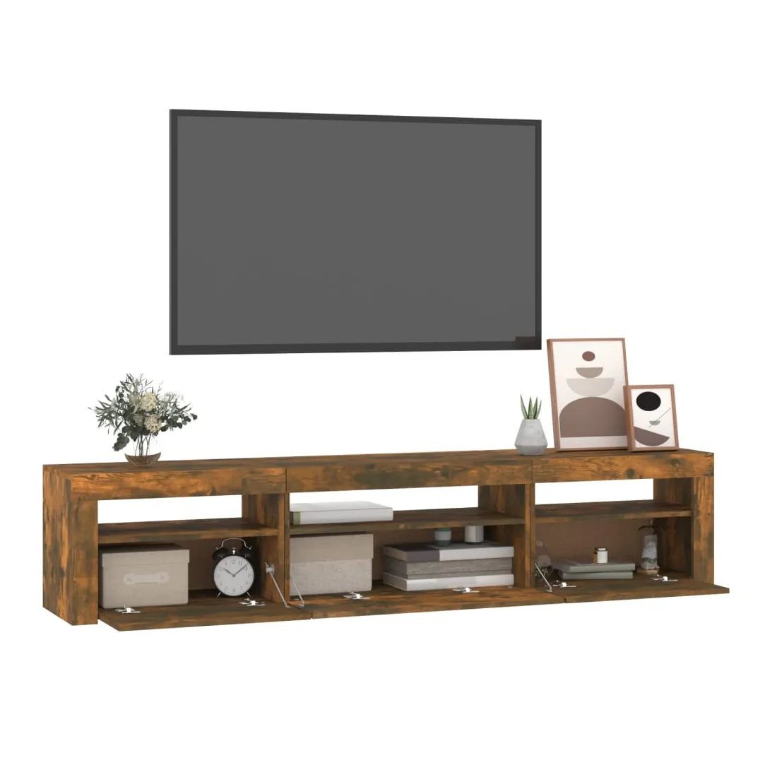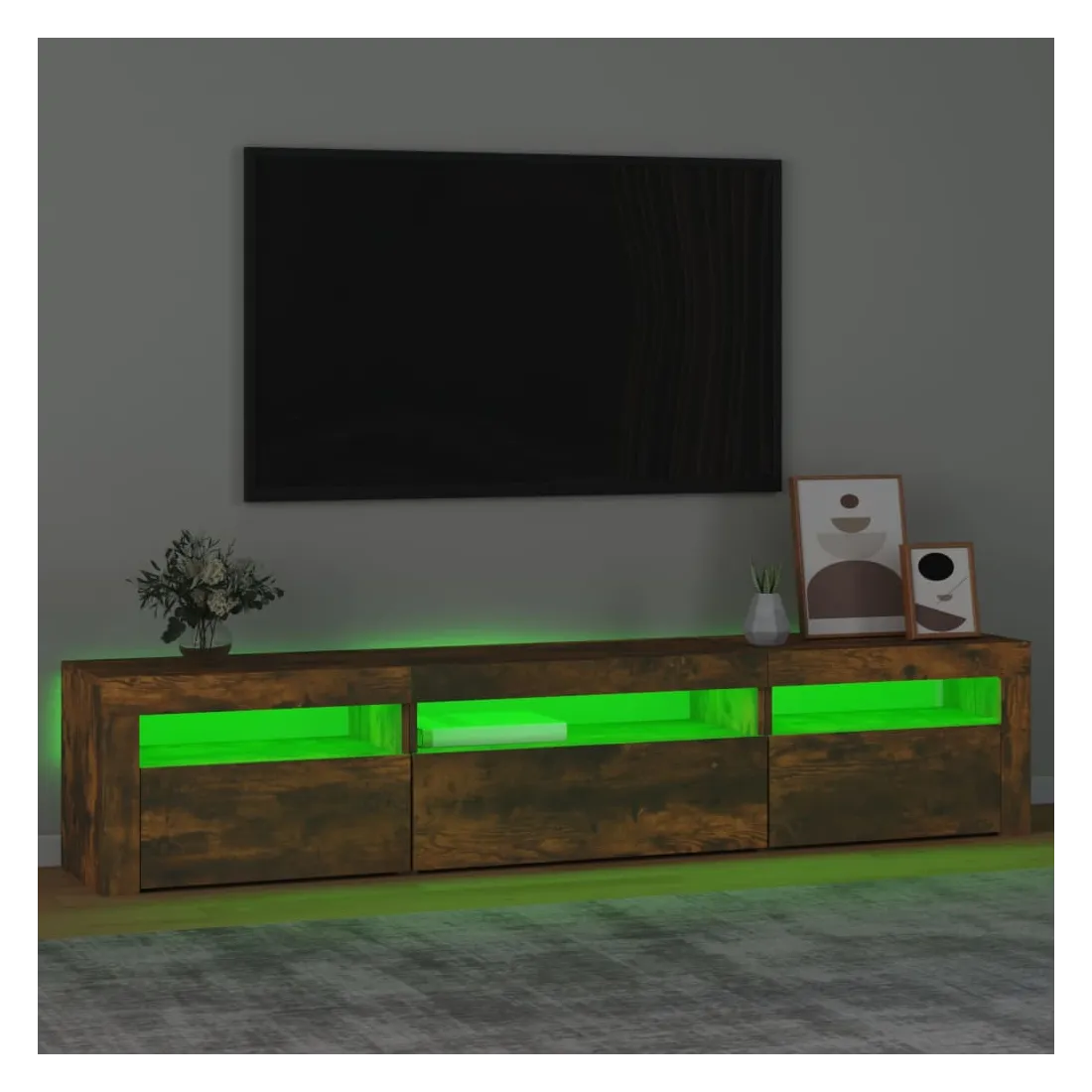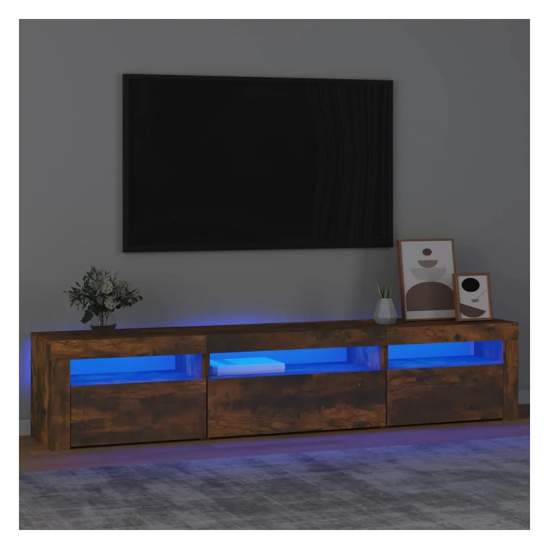 Avec un design à la fois tendance et pratique, ce meuble TV avec éclairage LED deviendra certainement un point central de votre pièce. Matériau pratique : le bois d'ingénierie est d'une qualité exceptionnelle avec une surface lisse et présente également résistance, stabilité et résistance à l'humidité. Lumières LED colorées : le meuble TV est doté de lumières LED RVB, qui ont différents menus pour changer la couleur des lumières et laisser la couleur s'ajuster automatiquement. Les lumières LED soulignent l'aspect moderne et contribuent à la sensation de tendance.Grand espace de rangement : le meuble TV offre un grand espace de rangement pour garder vos magazines, livres, télécommandes et autres petits objets bien organisés et à portée de main.Fonction d'affichage : le dessus robuste du meuble média est idéal pour exposer des objets décoratifs, des cadres photo et des plantes en pot. Remarque :Ce produit est doté d'un connecteur USB, mais la source d'alimentation certifiée de USB 5V n'est pas incluse.Chaque produit est livré avec un manuel de montage dans la boîte pour un montage facile.