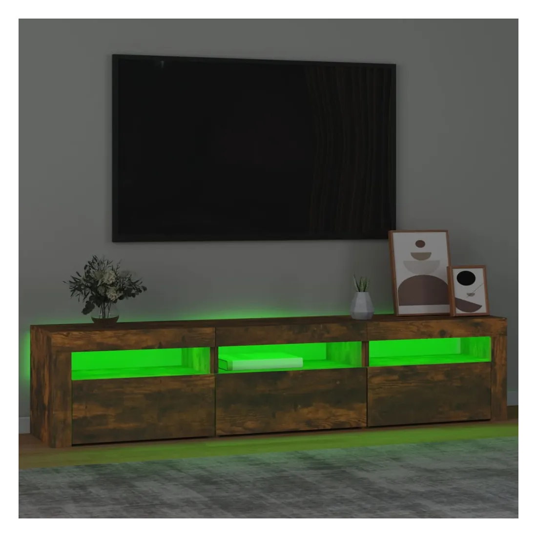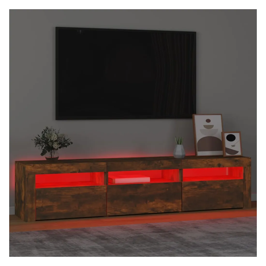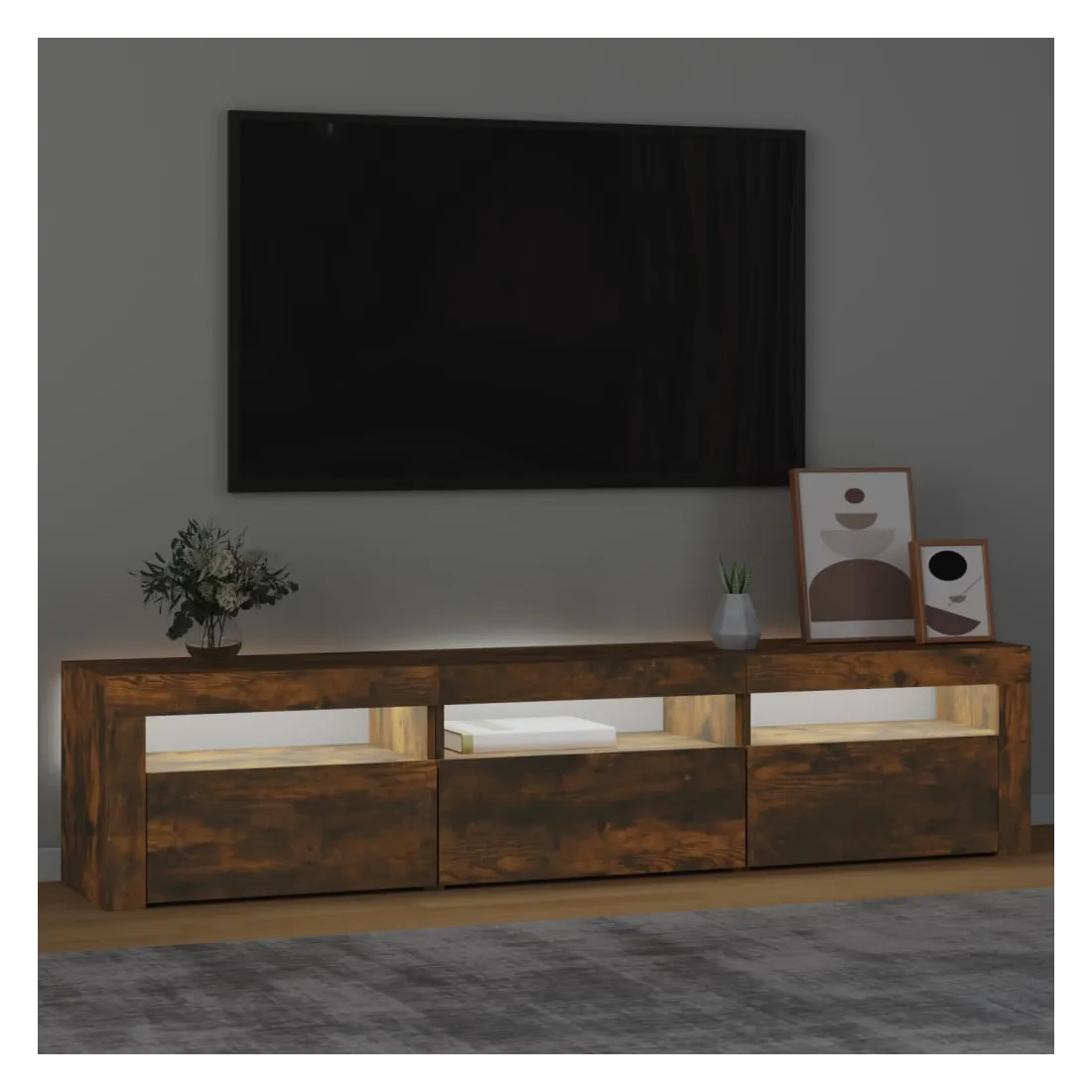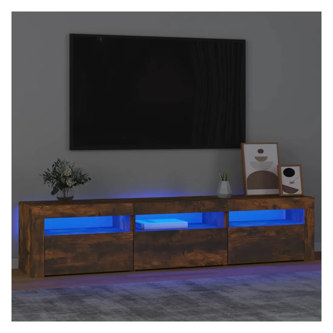 Avec un design à la fois tendance et pratique, ce meuble TV avec éclairage LED deviendra certainement un point central de votre pièce. Matériau pratique : le bois d'ingénierie est d'une qualité exceptionnelle avec une surface lisse et présente également résistance, stabilité et résistance à l'humidité. Lumières LED colorées : le meuble TV est doté de lumières LED RVB, qui ont différents menus pour changer la couleur des lumières et laisser la couleur s'ajuster automatiquement. Les lumières LED soulignent l'aspect moderne et contribuent à la sensation de tendance.Grand espace de rangement : le meuble TV offre un grand espace de rangement pour garder vos magazines, livres, télécommandes et autres petits objets bien organisés et à portée de main.Fonction d'affichage : le dessus robuste du meuble média est idéal pour exposer des objets décoratifs, des cadres photo et des plantes en pot. Remarque :Ce produit est doté d'un connecteur USB, mais la source d'alimentation certifiée de USB 5V n'est pas incluse.Chaque produit est livré avec un manuel de montage dans la boîte pour un montage facile.