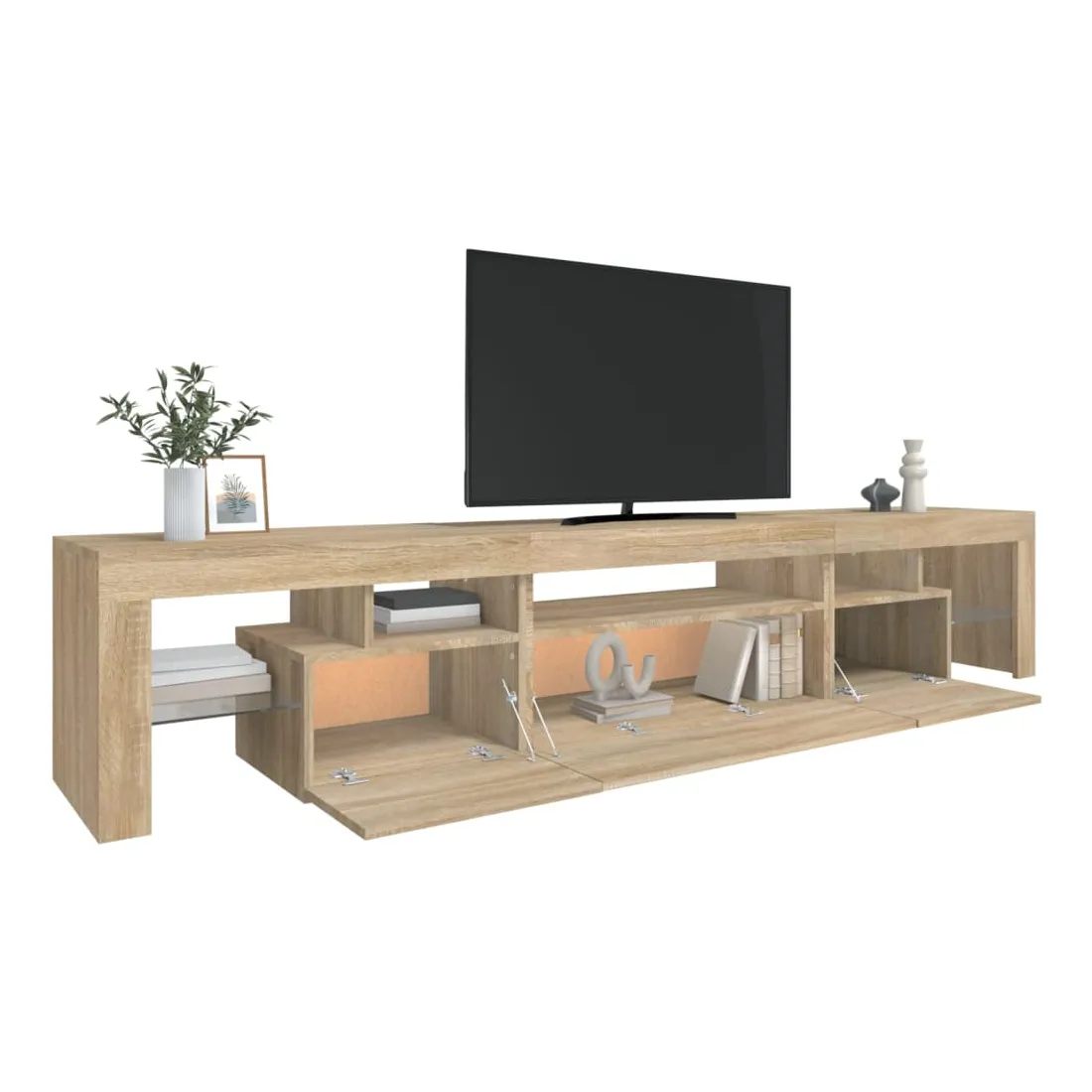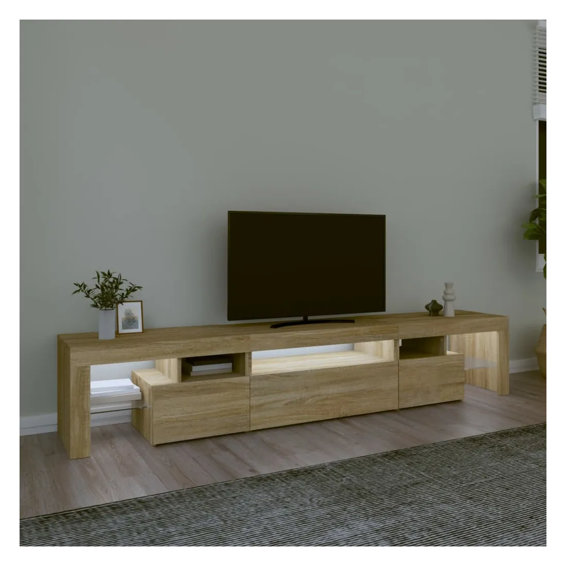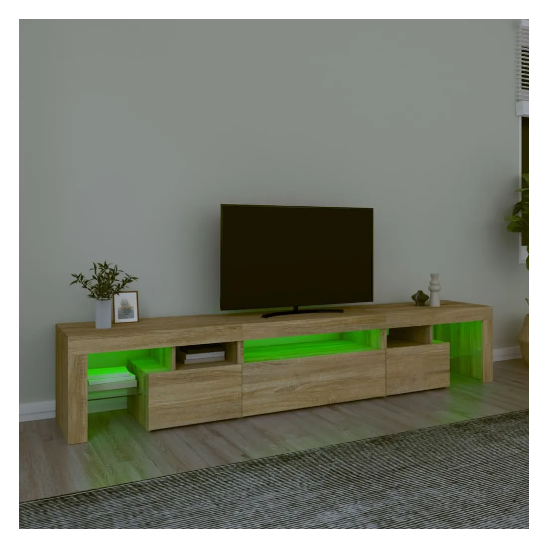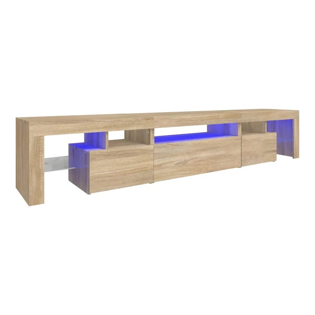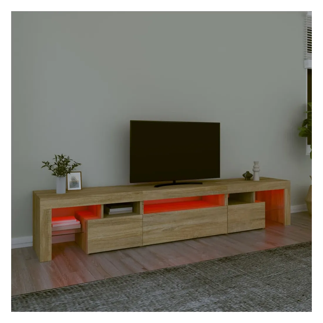 Avec un design à la fois tendance et pratique, ce meuble TV avec éclairage LED deviendra certainement un point central de votre pièce. Matériau pratique : le bois d'ingénierie est d'une qualité exceptionnelle avec une surface lisse et présente également résistance, stabilité et résistance à l'humidité. Lumières LED colorées : le meuble TV est doté de lumières LED RVB, qui ont différents menus pour changer la couleur des lumières et laisser la couleur s'ajuster automatiquement. Les lumières LED soulignent l'aspect moderne et contribuent à la sensation de tendance.Grand espace de rangement : le meuble TV offre un grand espace de rangement pour garder vos magazines, livres, télécommandes et autres petits objets bien organisés et à portée de main.Fonction d'affichage : le dessus robuste du meuble média est idéal pour exposer des objets décoratifs, des cadres photo et des plantes en pot. Remarque :Ce produit est doté d'un connecteur USB, mais la source d'alimentation certifiée de USB 5V n'est pas incluse.Chaque produit est livré avec un manuel de montage dans la boîte pour un montage facile.