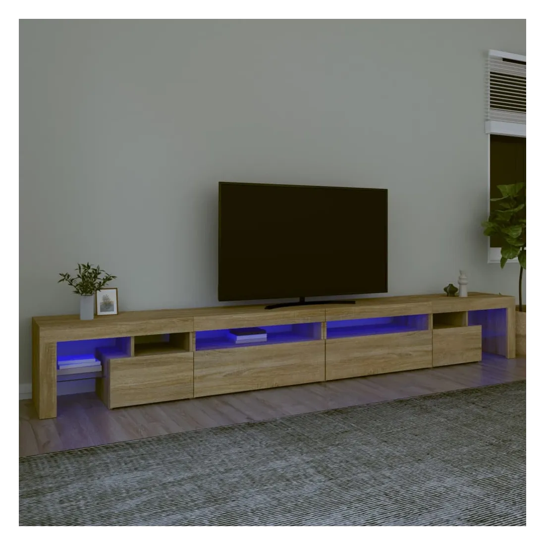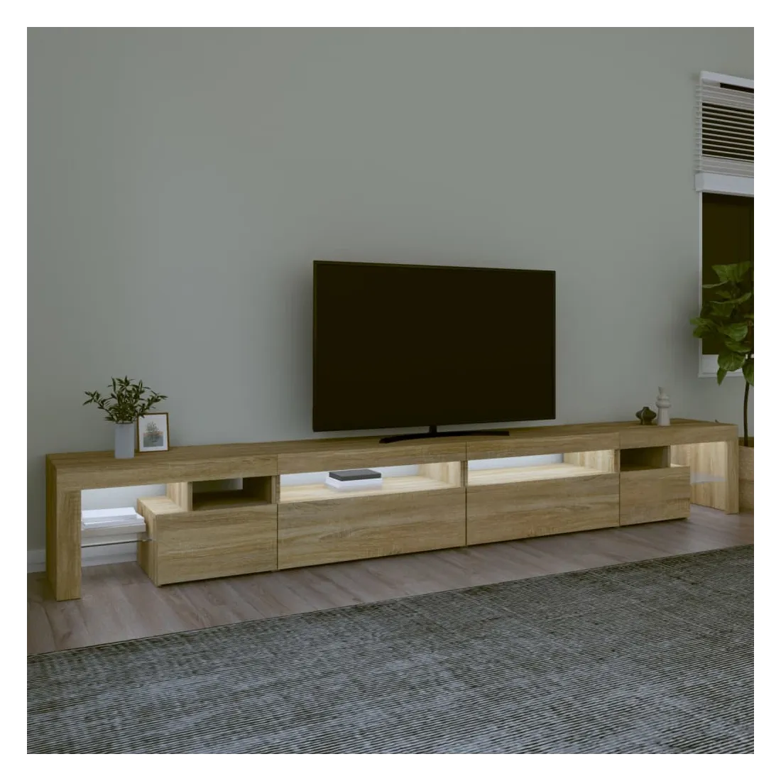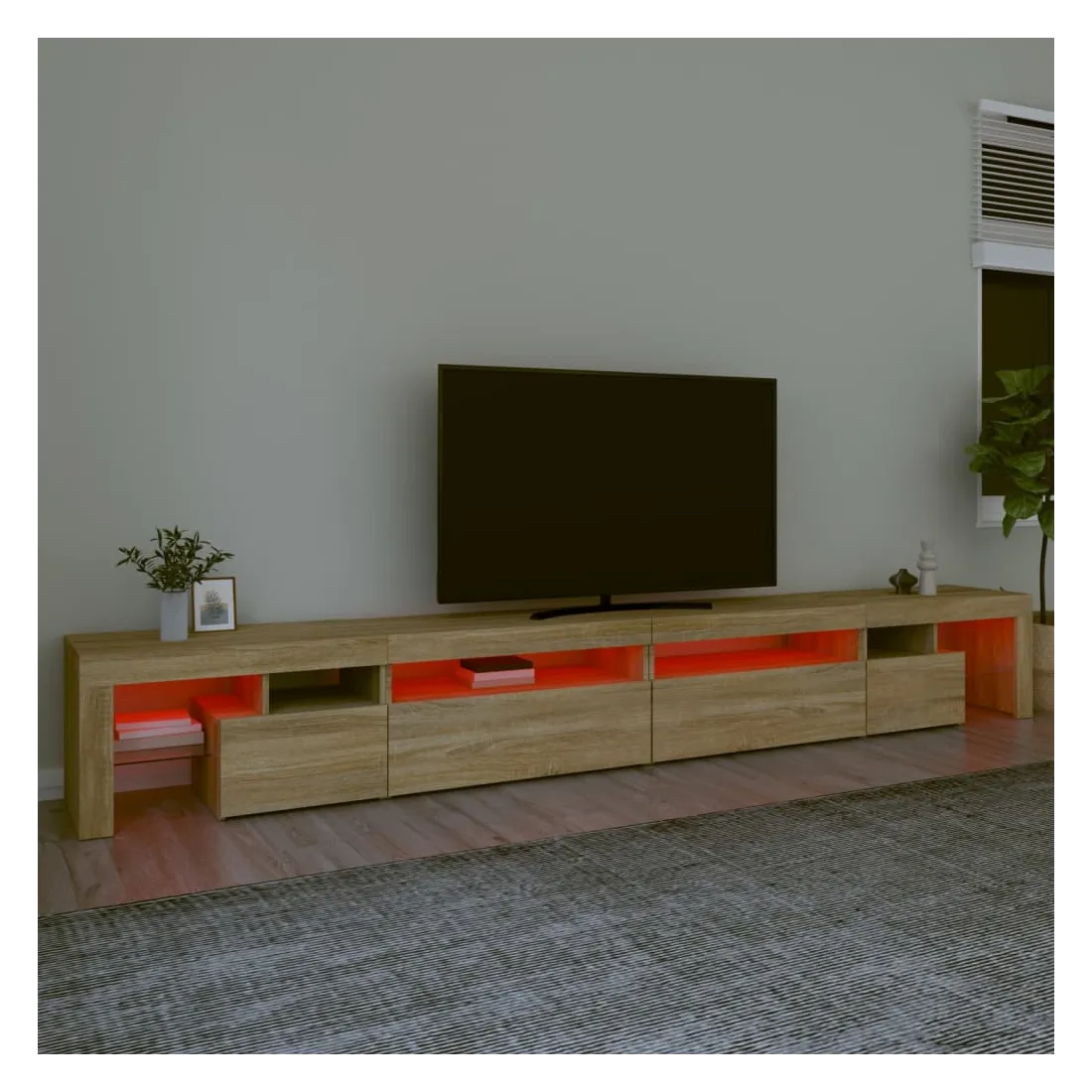 Avec un design à la fois tendance et pratique, ce meuble TV avec éclairage LED deviendra certainement un point central de votre pièce. Matériau pratique : le bois d'ingénierie est d'une qualité exceptionnelle avec une surface lisse et présente également résistance, stabilité et résistance à l'humidité. Lumières LED colorées : le meuble TV est doté de lumières LED RVB, qui ont différents menus pour changer la couleur des lumières et laisser la couleur s'ajuster automatiquement. Les lumières LED soulignent l'aspect moderne et contribuent à la sensation de tendance.Grand espace de rangement : le meuble TV offre un grand espace de rangement pour garder vos magazines, livres, télécommandes et autres petits objets bien organisés et à portée de main.Fonction d'affichage : le dessus robuste du meuble média est idéal pour exposer des objets décoratifs, des cadres photo et des plantes en pot. Remarque :Ce produit est doté d'un connecteur USB, mais la source d'alimentation certifiée de USB 5V n'est pas incluse.Chaque produit est livré avec un manuel de montage dans la boîte pour un montage facile.