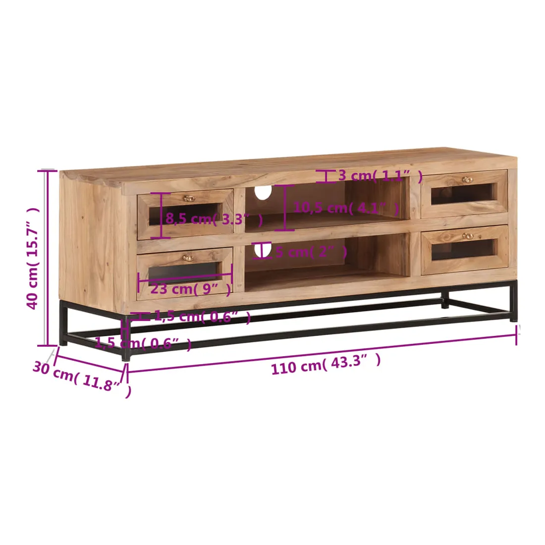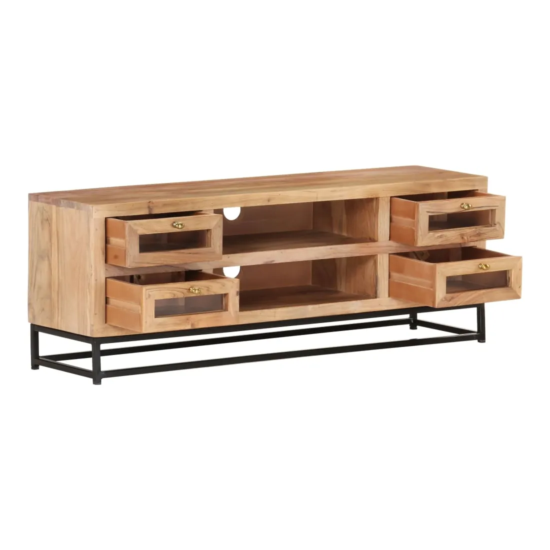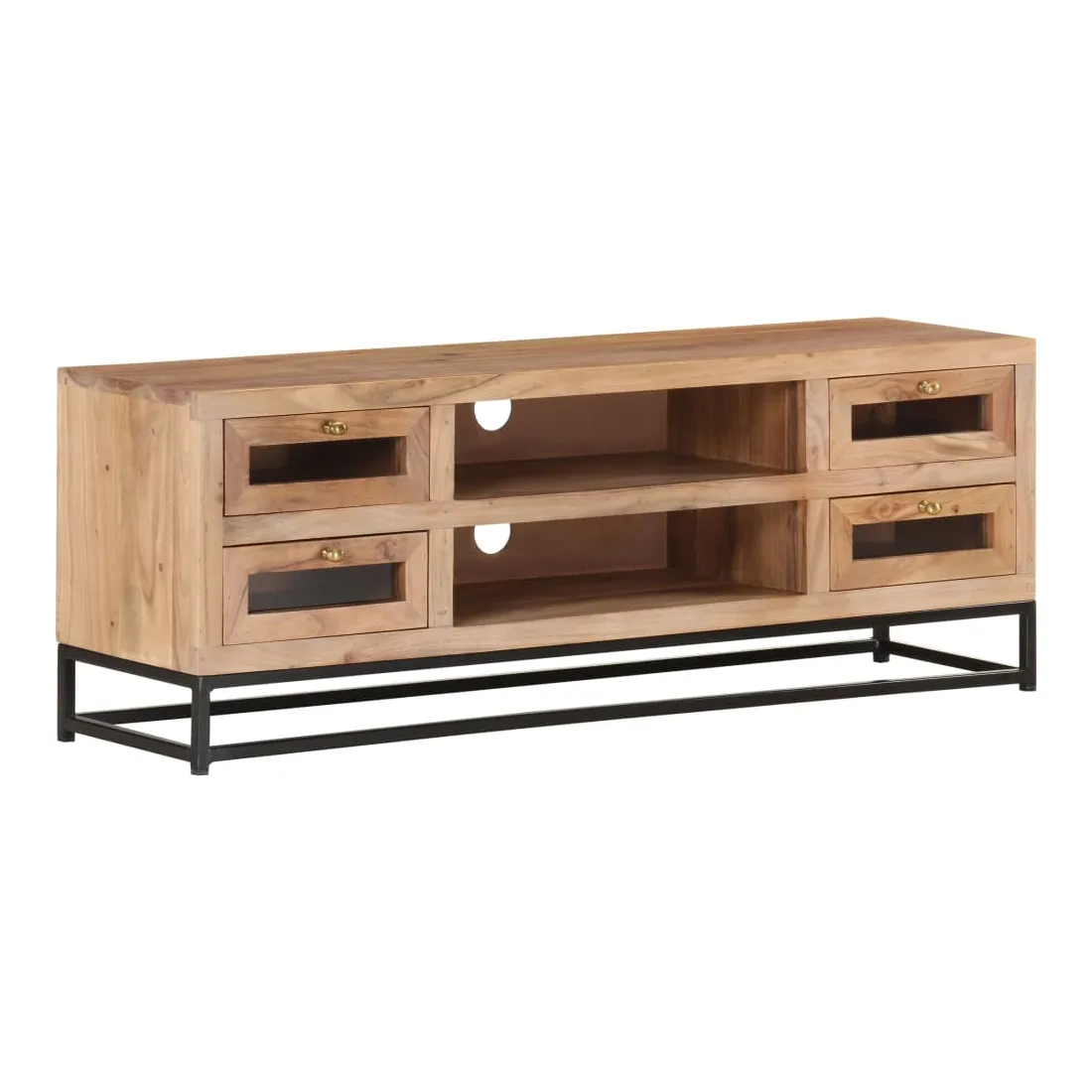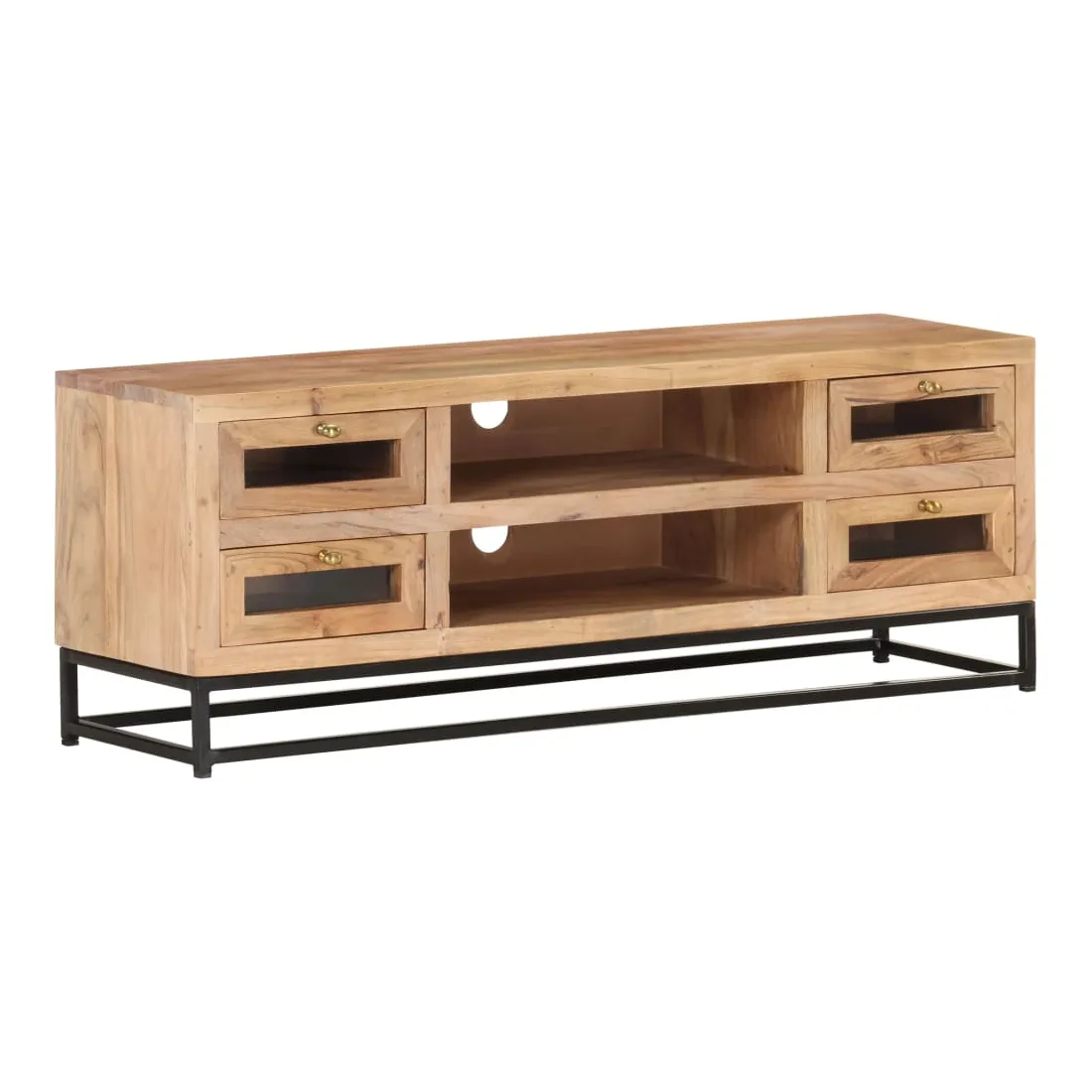 Introduisez un air de charme industriel dans votre décoration intérieure avec cet élégant meuble TV en bois ! Ce meuble stéréo est fabriqué en bois d'acacia massif, ce qui le rend robuste et stable. Le savoir-faire artisanal et les beaux grains du bois rendent chaque meuble unique et légèrement différent l'un de l'autre. Le meuble hi-fi est équipé de 4 tiroirs et de 2 étagères, afin que vous puissiez afficher ou garder tous les articles que vous souhaitez bien organisés. De plus, la base en acier ajoute à sa robustesse. Remarque importante : les grains et les couleurs du bois varient d’une pièce à l’autre, ce qui rend chaque armoire à vitrine unique.