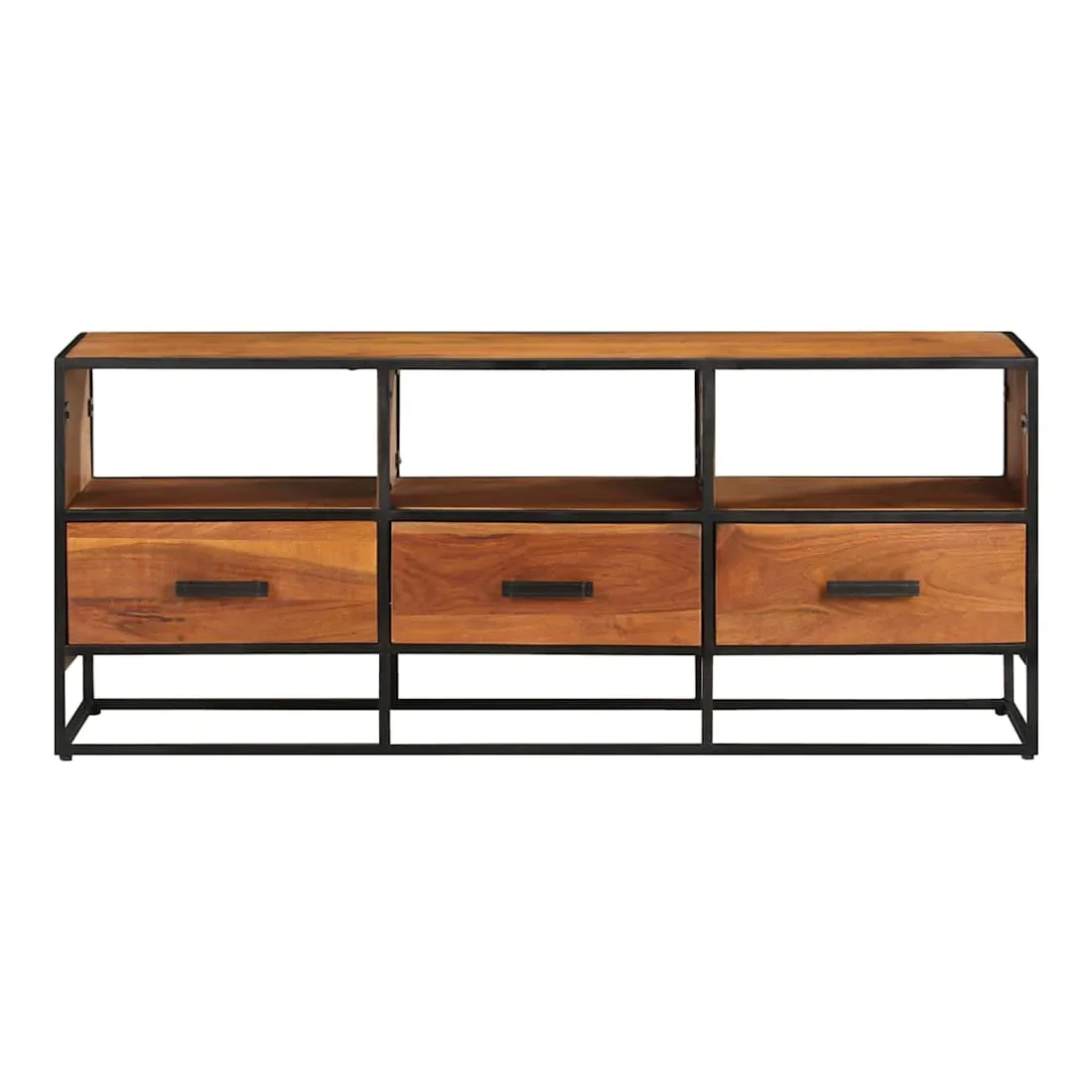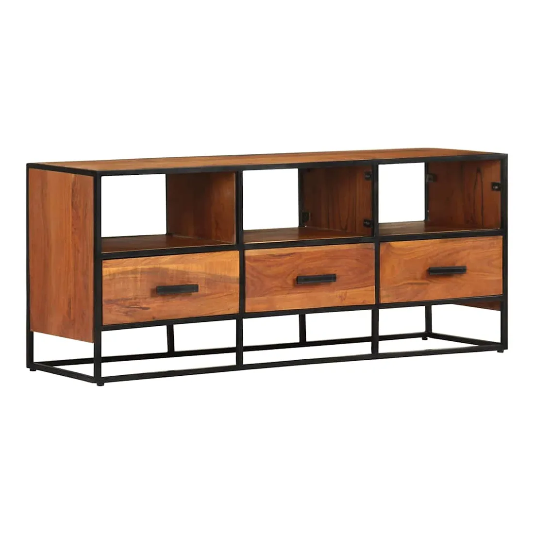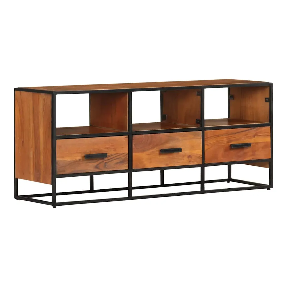 Si vous recherchez une touche simple de charme rustique et industriel à ajouter à votre décoration intérieure, ce meuble TV en bois massif fera l'affaire. Ce meuble TV est définitivement un supplément pratique et accrocheur à votre maison. Équipé de 3 tiroirs et de 3 étagères, ce buffet offre suffisamment d’espace pour garder vos magazines, livres, ainsi que divers autres petits articles à portée de main. Fabriquée en bois de manguier d’acacia massif avec une finition miel, cette armoire HiFi a des belles stries marronnes. Le savoir-faire exquis et les magnifiques grains de bois d'acacia rendent chaque meuble unique et légèrement différent l'un de l'autre. De plus, le cadre en fer enduit de poudre contribue à la structure stable et robuste et au style industriel de l'armoire stéréo. Remarque importante : Les variations de couleur et de grain du bois rendent chaque armoire à plasma unique et légèrement différente l'une de l'autre. La livraison est aléatoire, ce qui garantit l'exclusivité et l'individualité de votre produit.