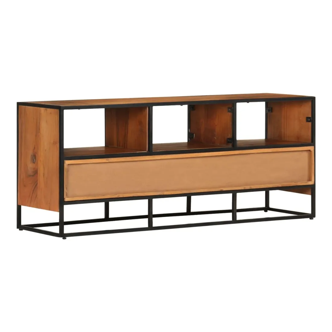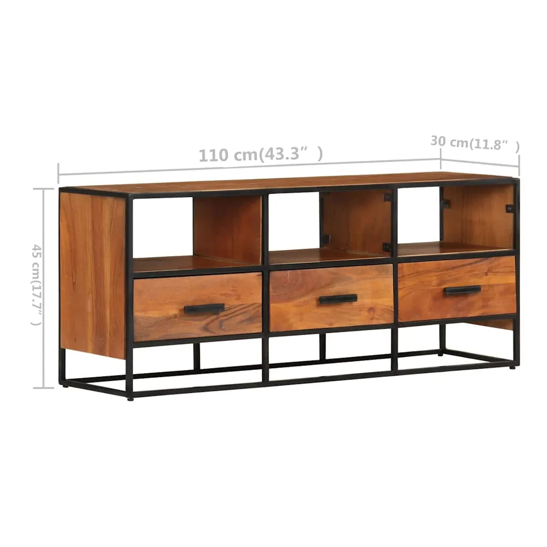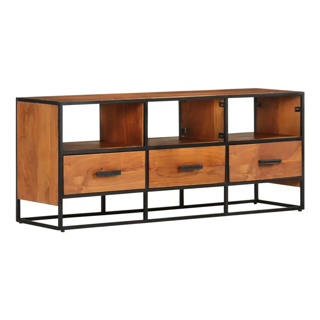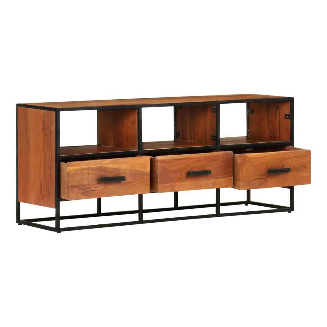 Si vous recherchez une touche simple de charme rustique et industriel à ajouter à votre décoration intérieure, ce meuble TV en bois massif fera l'affaire. Ce meuble TV est définitivement un supplément pratique et accrocheur à votre maison. Équipé de 3 tiroirs et de 3 étagères, ce buffet offre suffisamment d’espace pour garder vos magazines, livres, ainsi que divers autres petits articles à portée de main. Fabriquée en bois de manguier d’acacia massif avec une finition miel, cette armoire HiFi a des belles stries marronnes. Le savoir-faire exquis et les magnifiques grains de bois d'acacia rendent chaque meuble unique et légèrement différent l'un de l'autre. De plus, le cadre en fer enduit de poudre contribue à la structure stable et robuste et au style industriel de l'armoire stéréo. Remarque importante : Les variations de couleur et de grain du bois rendent chaque armoire à plasma unique et légèrement différente l'une de l'autre. La livraison est aléatoire, ce qui garantit l'exclusivité et l'individualité de votre produit.