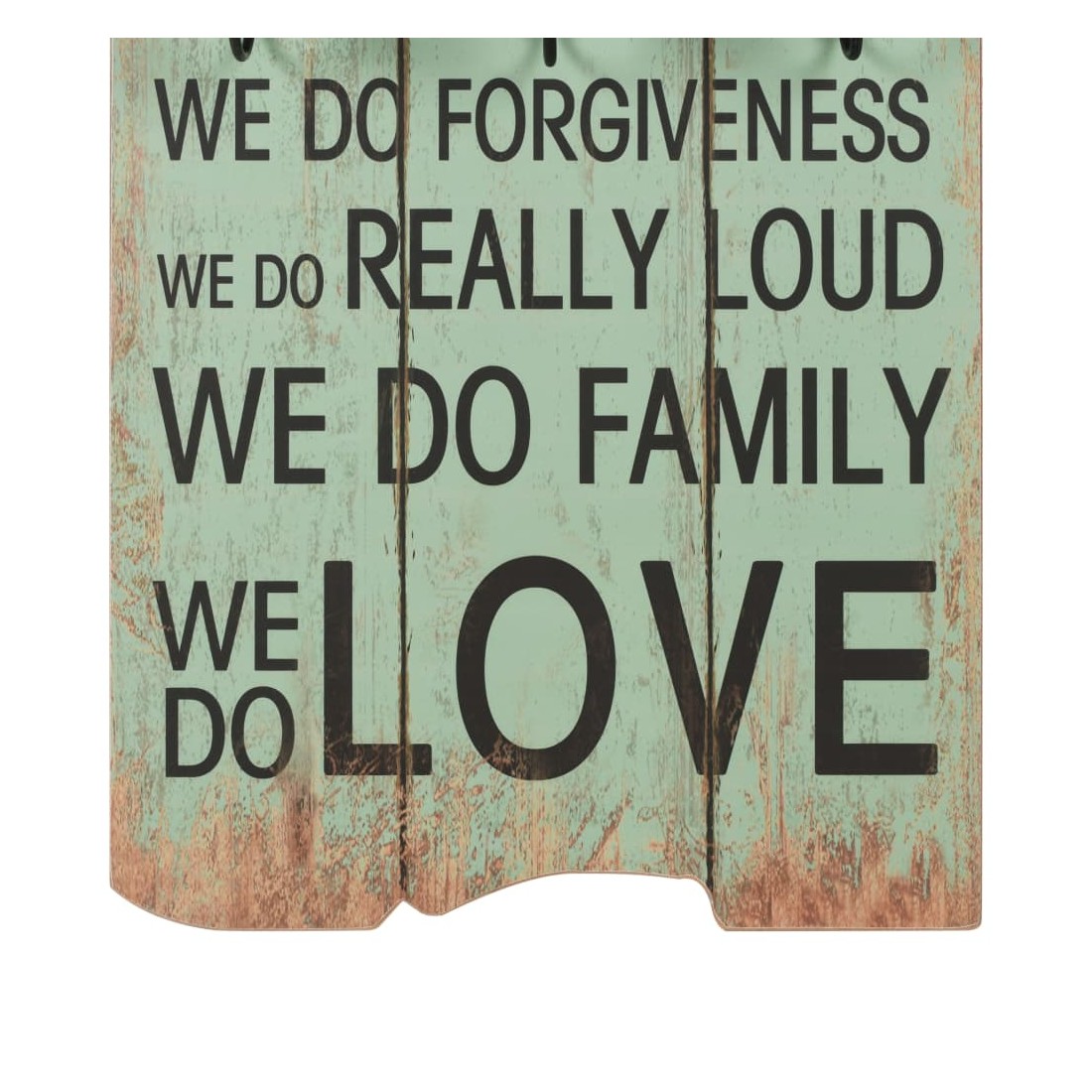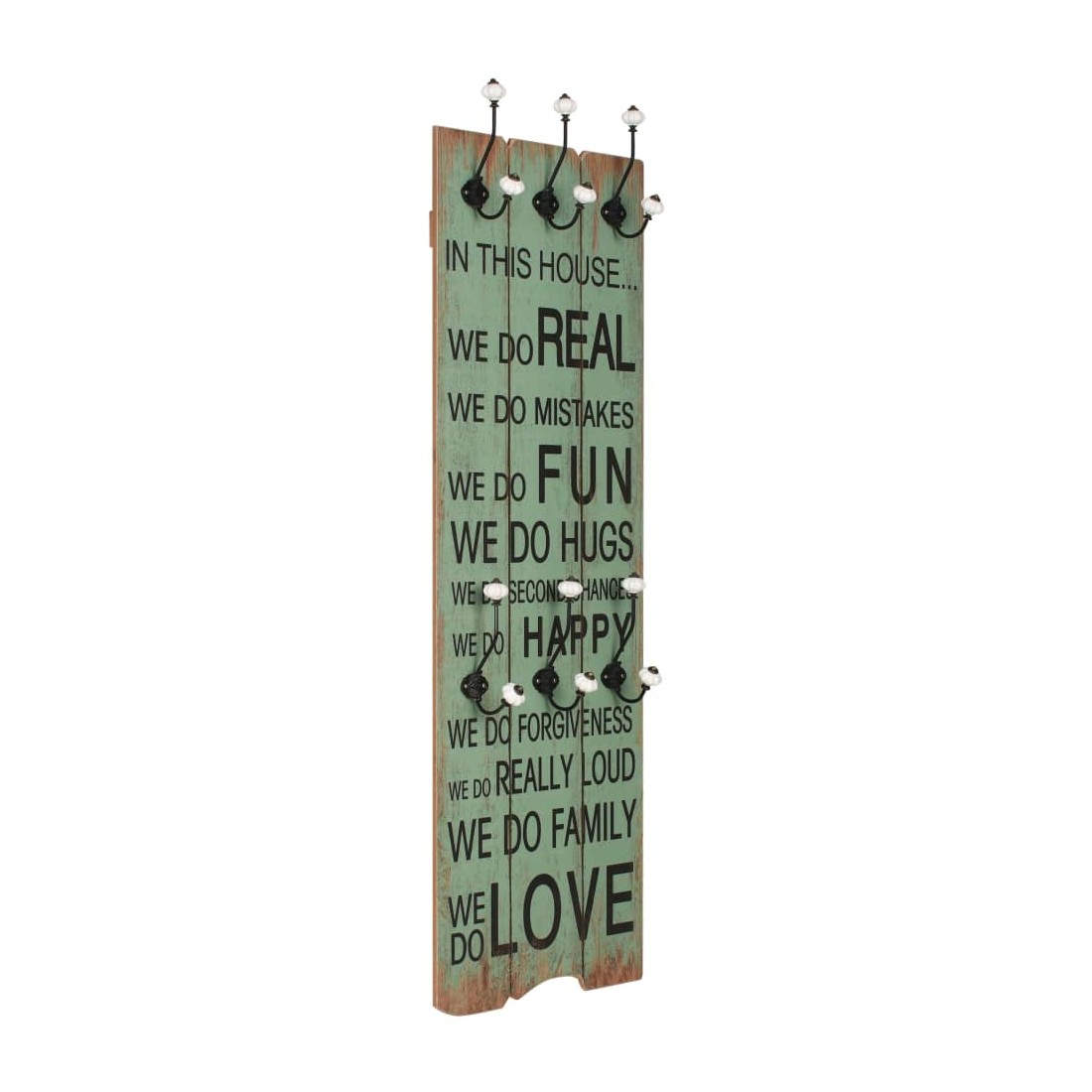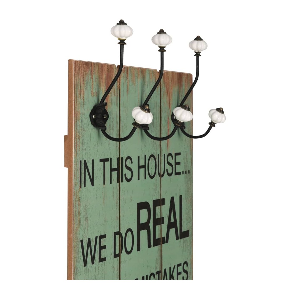 vidaXLAvec son imprimé de style vintage qui affiche « In this house…we do real we do mistakes we do fun we do hugs we do second chances we do happy we do forgiveness we do really loud we do family we do love », ce porte-manteau mural avec 6 crochets deviendra un véritable article attrayant que vos invités remarqueront immédiatement. Le porte-manteau est fabriqué en MDF, ce qui est très robuste. Conçu avec deux rangées de trois crochets en métal exquis, le porte-manteau offre amplement d'espace pour vos manteaux, sacs, foulards, chapeaux ou autres petits objets. Avec deux points d'attache à l'arrière, le porte-manteau peut être facilement monté sur le mur. L' assemblage est facile. La livraison comprend également le matériel de montage requis.