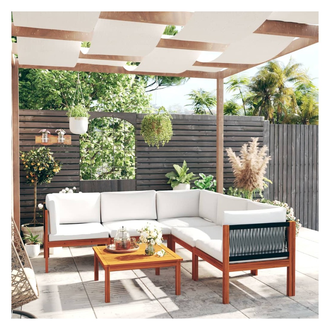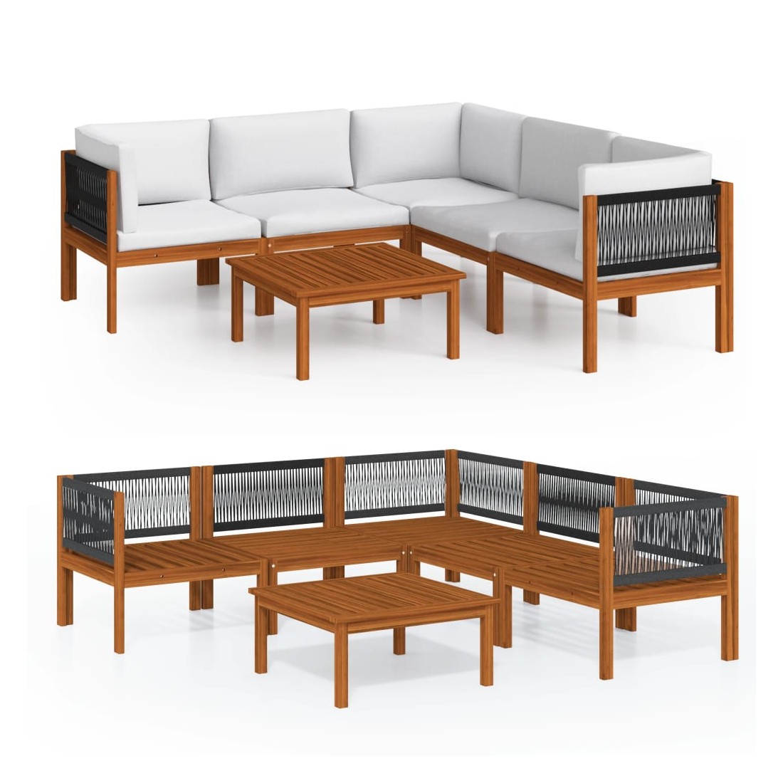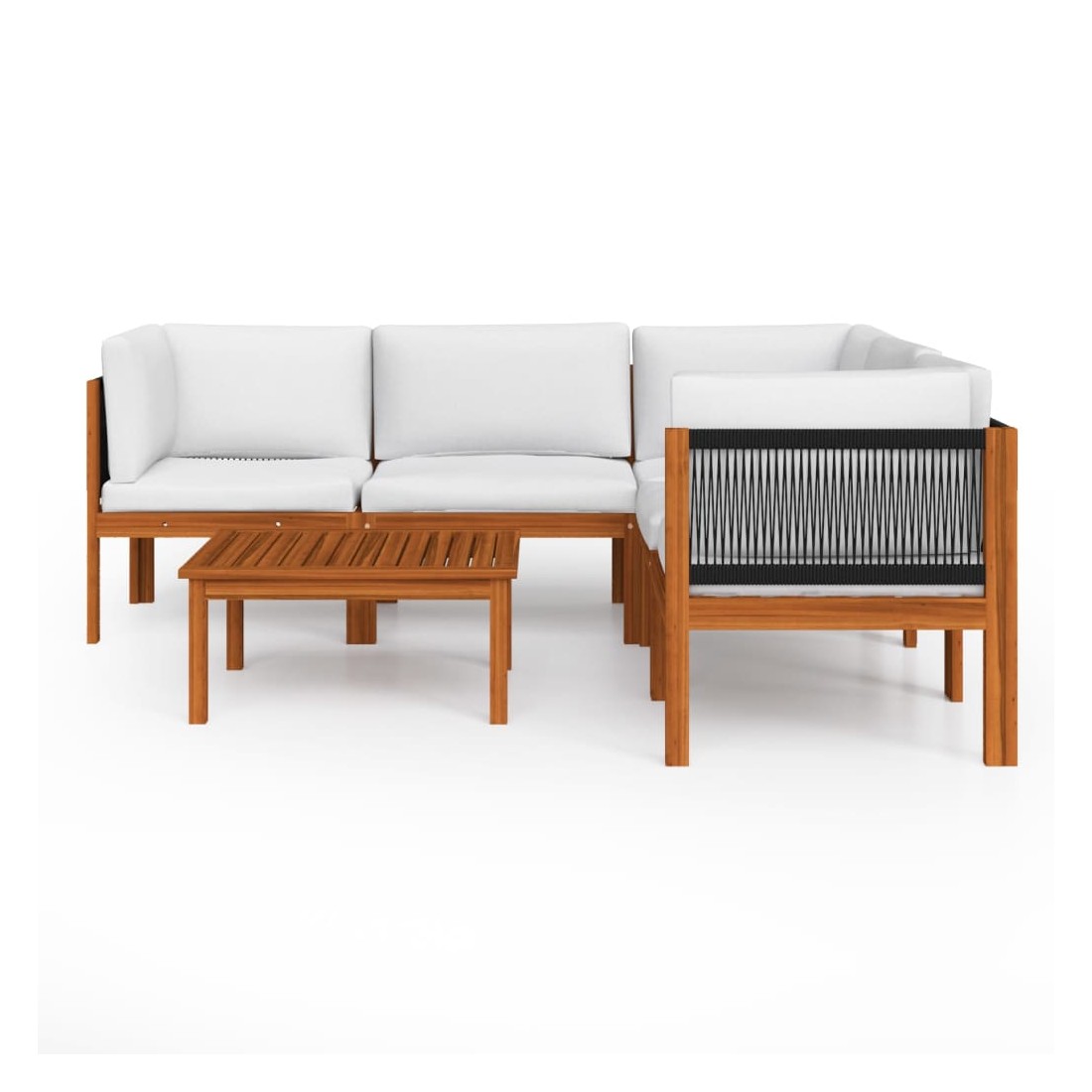 Salon de jardin 6 pièces avec coussins, bois d'acacia crème et corde