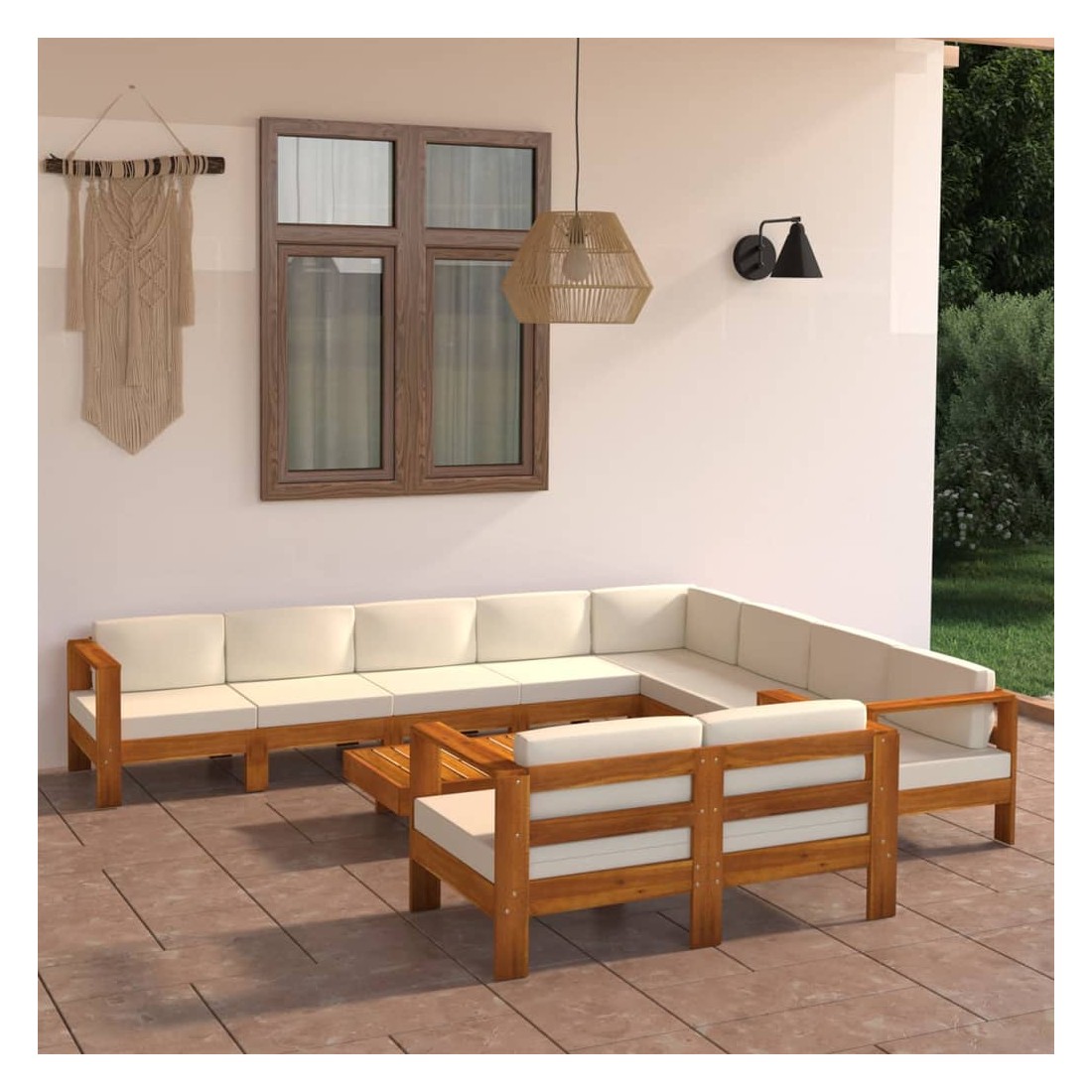 Décorez votre cour, transformez-la en un endroit accueillant pour vous asseoir et apprécier votre environnement ! Le salon de jardin en bois est un choix idéal pour vous détendre et vivre du bon temps avec vos amis ou votre famille dans le jardin, sur le patio ou le balcon. Le salon d'extérieur est soigneusement fabriqué en bois d'acacia massif, ce qui le rend robuste, durable et adapté à une utilisation en plein air. Les coussins de siège et les coussins de dossier bien rembourrés offrent un confort supplémentaire pendant votre temps de détente. La surface à finition à l'huile est facile à nettoyer avec un chiffon humide. De plus, le dessus de table robuste est idéal pour placer les boissons et les aliments à portée de main. Remarque : afin de prolonger la durée de vie des meubles d'extérieur, nous vous recommandons de les protéger avec une housse imperméable.