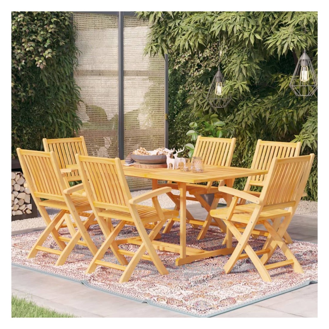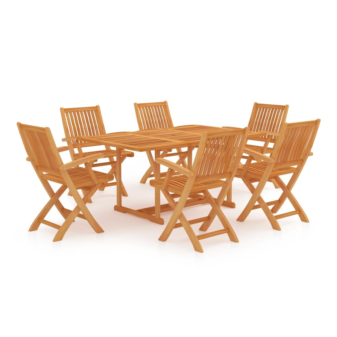 Cet ensemble de jardin en bois est parfait pour vos repas ou pour vous détendre dans le jardin ou sur le patio. Il est également idéal pour une utilisation à l'intérieur. Fabriquée en bois dur de teck extrêmement durable, cette pièce de meuble en teck a été chevronnée, séchée au four puis finement poncée pour lui donner un aspect très lisse. Le bois de teck est connu pour sa résistance exceptionnelle aux intempéries, ce qui le rend bien plus adapté aux meubles de jardin que tout autre type de bois. Le bois de teck est le choix idéal si vous souhaitez acheter une pièce de meubles de jardin durable. L’ensemble est appliqué avec une belle finition pour donner au bois une couleur chaude. La table comprend un trou pour un parasol afin de vous protéger du soleil. Les sièges et les dossiers incurvés des chaises peuvent bien s’adapter à votre corps. Avec un design pliable, les chaises peuvent être pliées pour économiser de l’espace lorsqu'elles ne sont pas utilisées. Elles sont également légères et faciles à déplacer. L’ensemble de meubles vous offre un confort et une grande commodité pour passer du temps avec votre famille et vos amis. De plus, cet ensemble est également facile à nettoyer avec un chiffon humide.