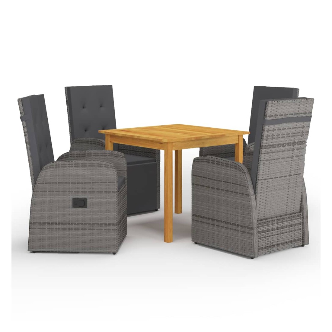 Créez une esthétique convaincante et uniforme dans votre espace extérieur avec cet ensemble de salle à manger de jardin ! La table de salle à manger est fabriquée en bois d’acacia massif avec une finition à l’huile, ce qui la rend stable, durable et facile à entretenir. Dotées d’un cadre en acier enduit de poudre recouvert de résine tressée résistante aux intempéries, ces chaises de salle à manger sont robustes et faciles à nettoyer. Avec son dossier et son repose-pied réglables, vous pouvez vous asseoir confortablement et vous détendre complètement. Le dossier s’inclinera en tirant sur le bouton situé sur le côté. Grâce à leur construction légère, les chaises sont faciles à déplacer. Elles sont également livrées avec des coussins hautement confortables et bien rembourrés pour un confo