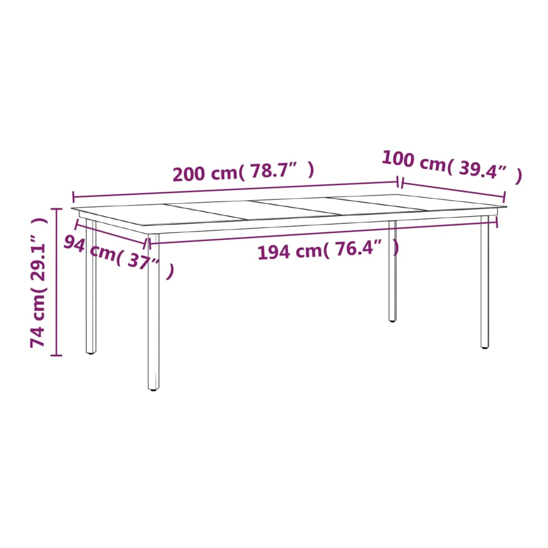 • Dimensions de la table : 200 x 100 x 74 cm (L x l x H)