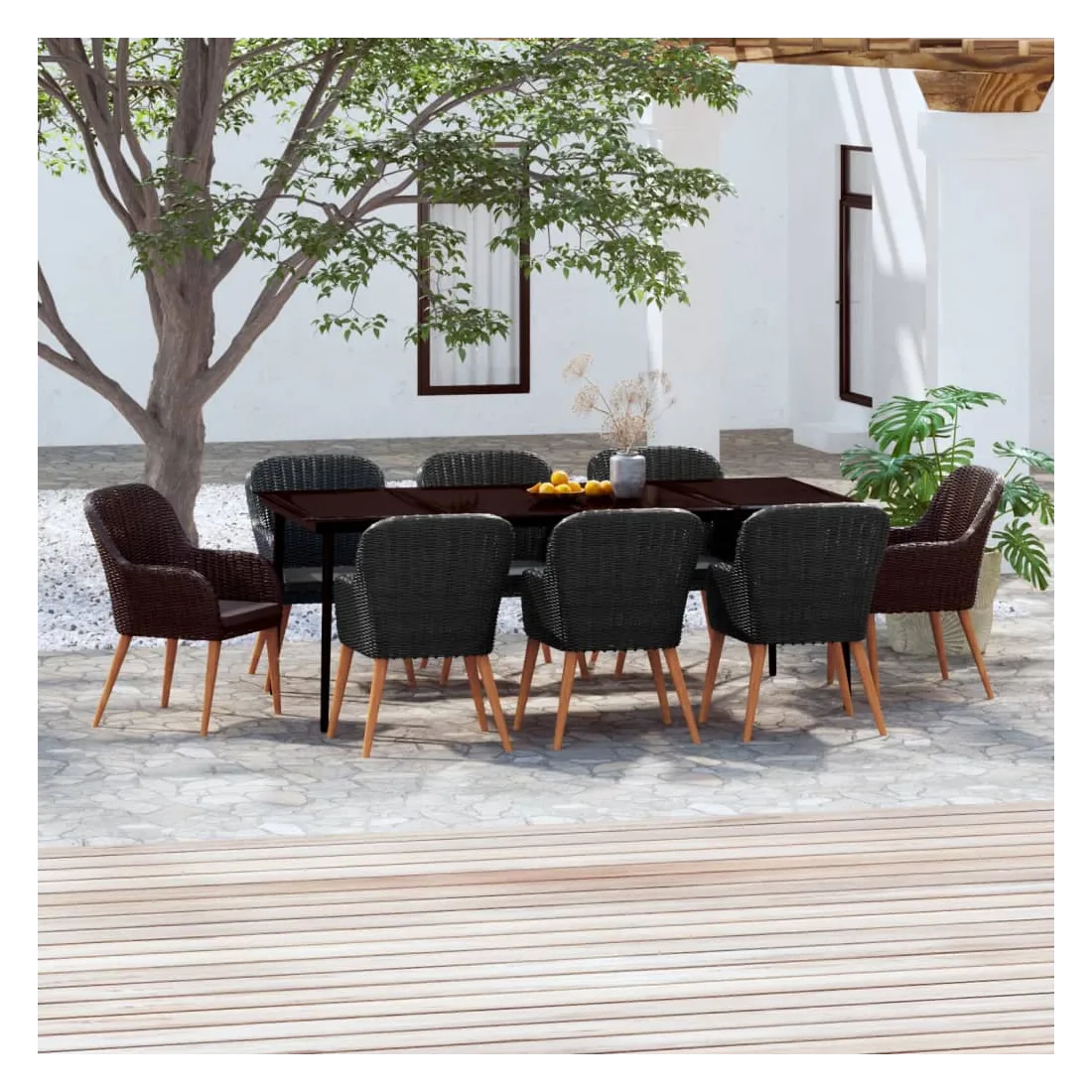 • Matériau : résine tressée, acier enduit de poudre, bois d'acacia massif avec une finition huilée, verre