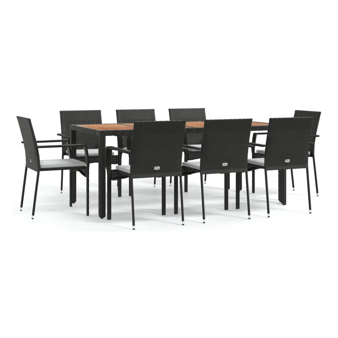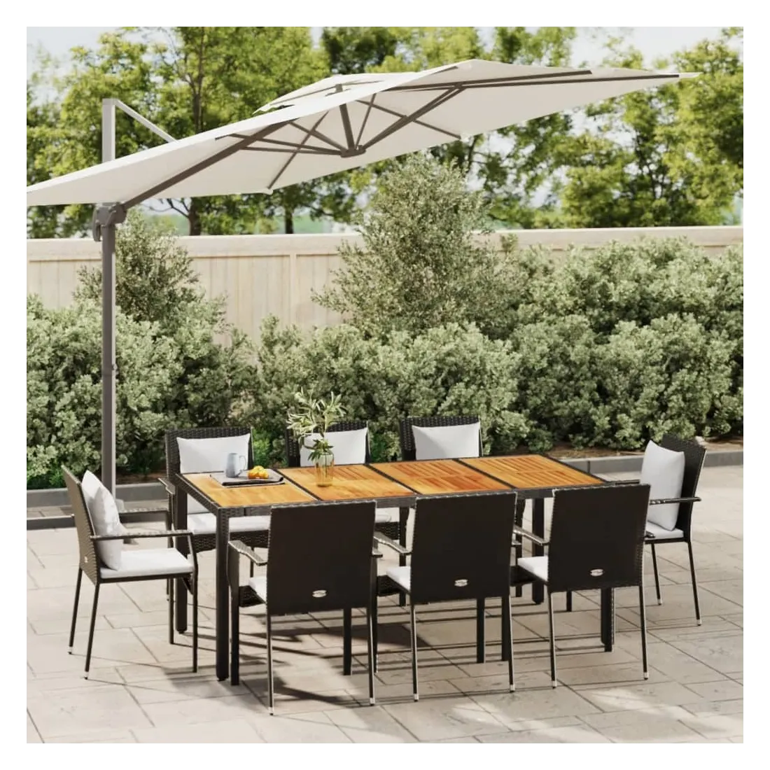 Cet ensemble de salle à manger de jardin tendance, au design élégant et contemporain, est un excellent choix pour manger ou vous détendre dans votre jardin. Matériau résistant aux intempéries : la résine tressée, également connue sous le nom de rotin poly, résiste aux intempéries et est facile à nettoyer. Elle reste belle à l'extérieur pendant une longue période. Elle offre une excellente qualité, commodité et un aspect esthétique.Cadre robuste : les cadres en acier enduit de poudre rendent l'ensemble de salle à manger d'extérieur robuste et stable pour une utilisation quotidienne à l'extérieur.Dessus de table pratique : le dessus de table en bois d'acacia massif est parfait pour placer des boissons, des aliments et des décorations. Il a une belle apparence et est facile à nettoyer.Conception modulaire : l'ensemble de salle à manger de jardin est flexible et facile à déplacer, vous pouvez donc le combiner avec d'autres segments modulaires dans la boutique en ligne pour créer vos propres configurations d'ensemble de salle à manger de jardin !Expérience d'assise confortable : le dossier ajoute un confort d'assise supplémentaire à la chaise de jardin. De plus, les coussins bien rembourrés vous permettent de vous asseoir confortablement. Bon à savoir :Pour faciliter au maximum le montage, chaque produit est livré avec des instructions. Remarque :Pour que vos meubles d'extérieur restent beaux, nous vous recommandons de les protéger avec une housse imperméable.