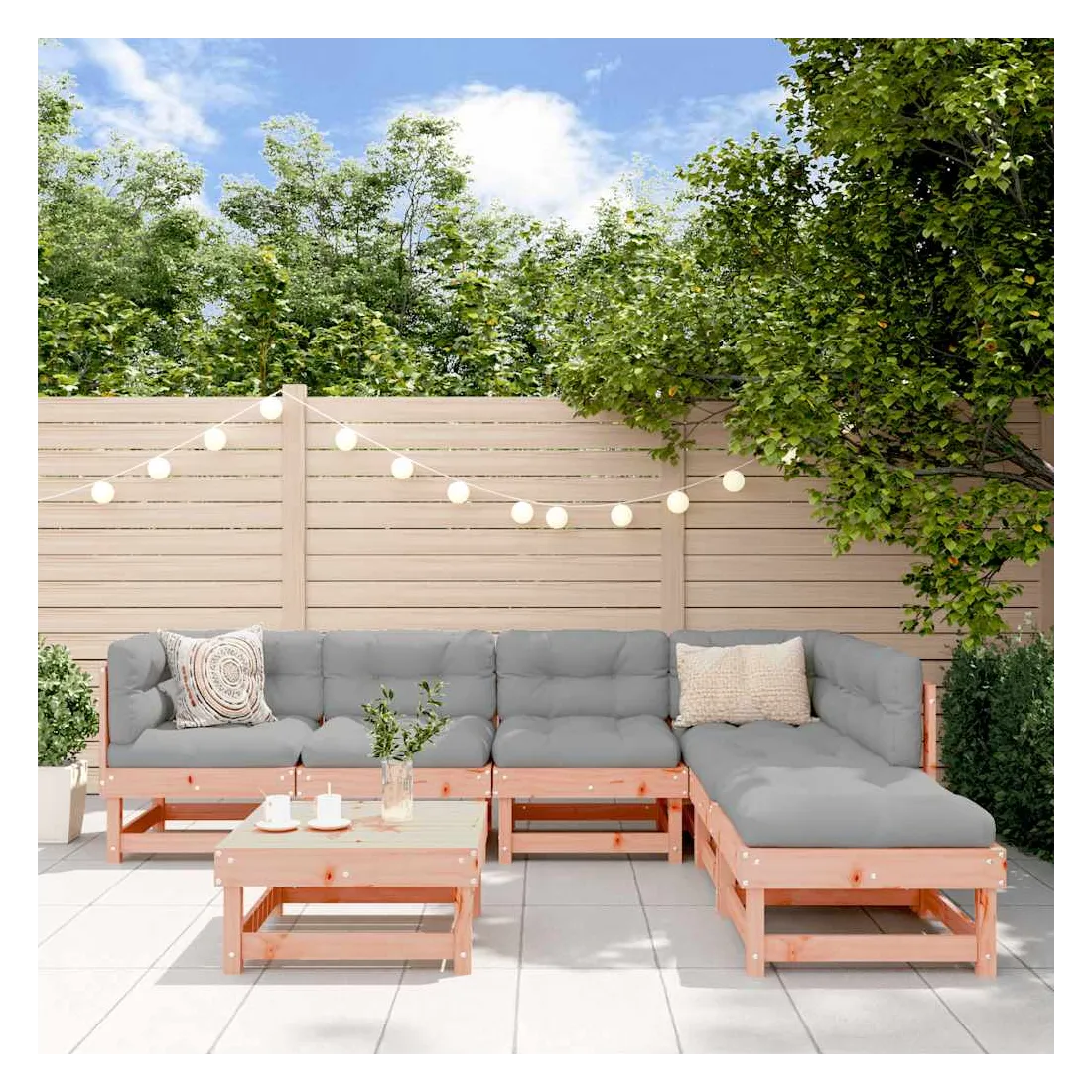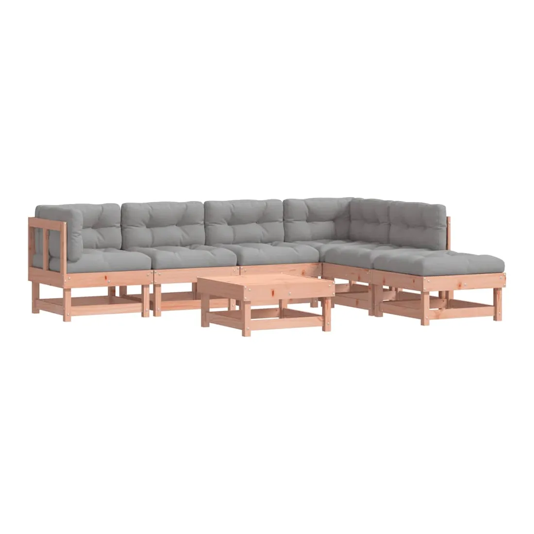 Ce salon de jardin en bois, qui se démarque par son design à lattes et ses coussins moelleux, sera un excellent supplément à votre jardin, patio ou terrasse pour profiter d'un moment agréable avec votre famille ou vos amis. Bois de douglas massif : le bois de douglas massif est un bois très durable qui fonctionne bien pour l'extérieur. Le bois de Douglas est également suffisamment solide pour être travaillé avec un minimum de soin, même sous l'influence des intempéries.Cadre robuste et stable : le cadre en bois rend l'ensemble de salon robuste et stable pour une utilisation quotidienne à l'extérieur.Expérience d'assise confortable : le dossier et l'accoudoir ajoutent un confort d'assise supplémentaire à l'ensemble de meubles de jardin. De plus, les coussins bien rembourrés vous permettent de vous asseoir confortablement.Design modulaire : le canapé est flexible et facile à déplacer. Vous pouvez le combiner avec d'autres segments modulaires de la boutique en ligne pour créer vos propres configurations de salon de jardin ! Bon à savoir :Pour que vos meubles d'extérieur restent beaux, nous vous recommandons de les protéger avec une housse imperméable.