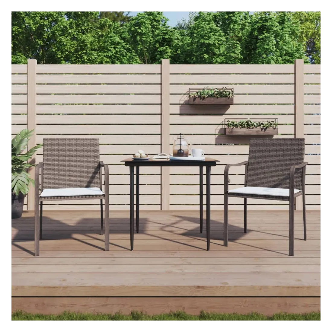 Cet ensemble à manger de jardin, combinant à la fois style et fonctionnalité, est sûrement destiné à être la pièce maîtresse de votre jardin, terrasse et de tout autre espace de vie. Matériau résistant aux intempéries : la résine tressée, également connue sous le nom de rotin poly, résiste aux intempéries et est facile à nettoyer. Elle reste belle à l'extérieur pendant une longue période. Elle offre une excellente qualité, commodité et un aspect esthétique.Cadre robuste et stable : les cadres en acier rendent l'ensemble à manger robuste et stable pour une utilisation quotidienne à l'extérieur.Dessus de table pratique : le plateau lisse de la table à manger est en verre trempé facile à nettoyer avec un chiffon humide. De plus, il offre un excellent support pour contenir vos repas, boissons et autres objets décoratifs.Assise confortable : la chaise de salle à manger est conçue avec des accoudoirs pour vous offrir une expérience d'assise confortable. Le coussin de siège épais et rembourré offre un confort ultime pendant votre temps d'assise. Remarque :Pour que vos meubles d'extérieur restent beaux, nous vous recommandons de les protéger avec une housse imperméable.