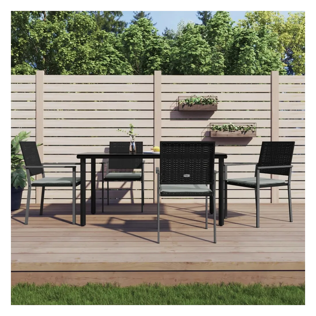 Cet ensemble à manger de jardin, combinant à la fois style et fonctionnalité, est sûrement destiné à être la pièce maîtresse de votre jardin, terrasse et de tout autre espace de vie. Matériau résistant aux intempéries : la résine tressée, également connue sous le nom de rotin poly, résiste aux intempéries et est facile à nettoyer. Elle reste belle à l'extérieur pendant une longue période. Elle offre une excellente qualité, commodité et un aspect esthétique.Cadre robuste et stable : les cadres en acier rendent l'ensemble à manger robuste et stable pour une utilisation quotidienne à l'extérieur.Dessus de table pratique : le plateau lisse de la table à manger est en verre trempé facile à nettoyer avec un chiffon humide. De plus, il offre un excellent support pour contenir vos repas, boissons et autres objets décoratifs.Assise confortable : la chaise de salle à manger est conçue avec des accoudoirs pour vous offrir une expérience d'assise confortable. Le coussin de siège épais et rembourré offre un confort ultime pendant votre temps d'assise. Remarque :Pour que vos meubles d'extérieur restent beaux, nous vous recommandons de les protéger avec une housse imperméable.