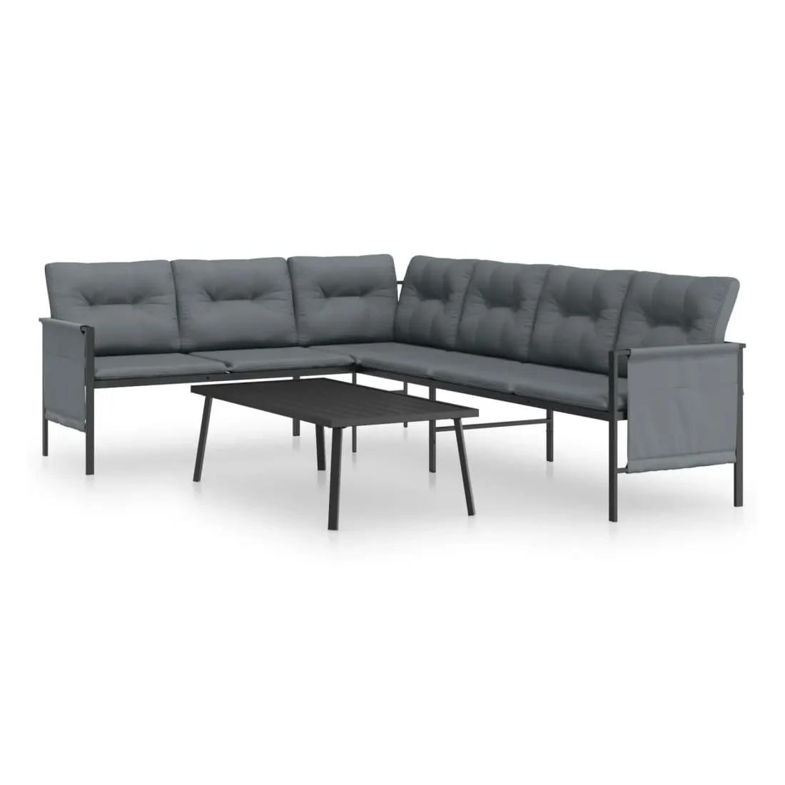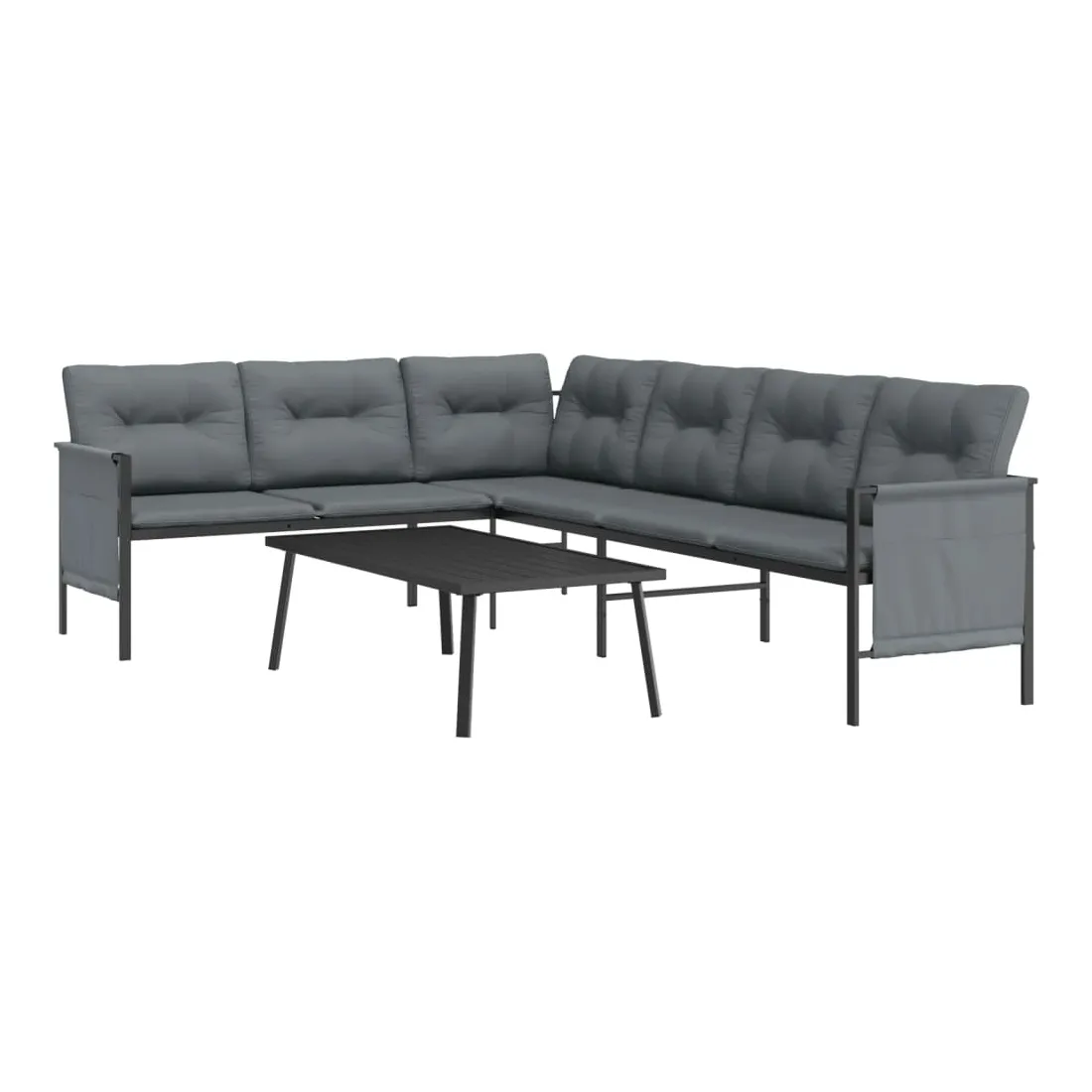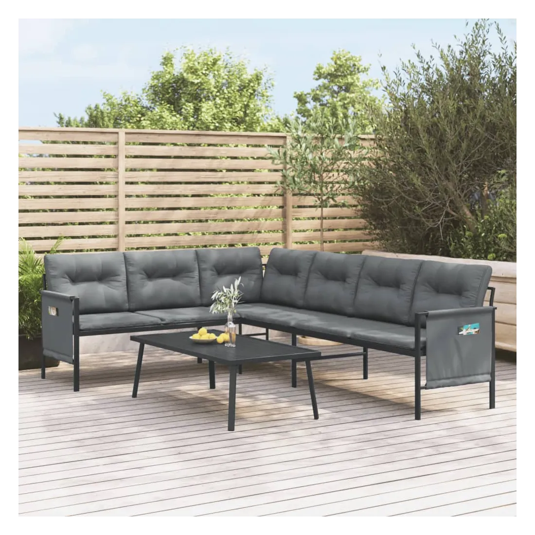 Cet ensemble de salon de jardin élégant et confortable est un choix idéal pour vous détendre et profiter du beau temps, faire une sieste ou discuter avec vos amis ou votre famille. Matériau robuste : l'acier est un matériau exceptionnellement dur et solide. Il offre robustesse et stabilité. Le revêtement par poudre et le revêtement électronique de l'acier créent une couche protectrice contre l'usure et la corrosion.Cadre stable : le cadre en acier enduit de poudre et d'un revêtement électronique garantit la robustesse et la stabilité de l'ensemble de salon.Sièges confortables : les coussins bien rembourrés sont très confortables et ajoutent une expérience d'assise très confortable.Dessus de table pratique : le dessus de table robuste de la table d'extérieur est parfait pour placer des repas, des boissons et d'autres objets décoratifs.Sac de rangement latéral : les sacs de rangement latéraux des sièges de jardin peuvent garder vos articles essentiels bien organisés et à portée de main. Remarque :Pour que vos meubles d'extérieur restent beaux, nous vous recommandons de les protéger avec une housse imperméable.
