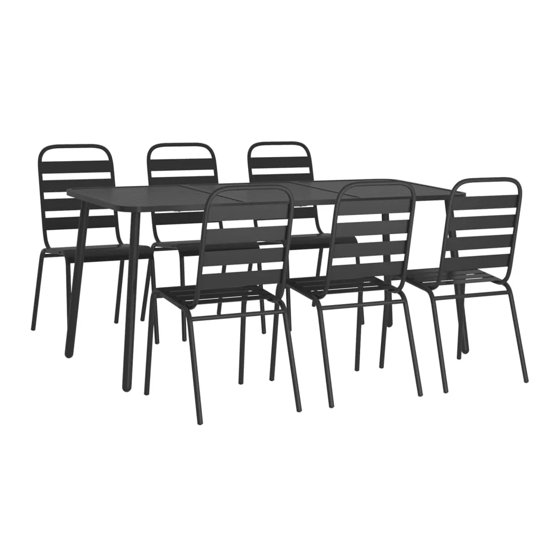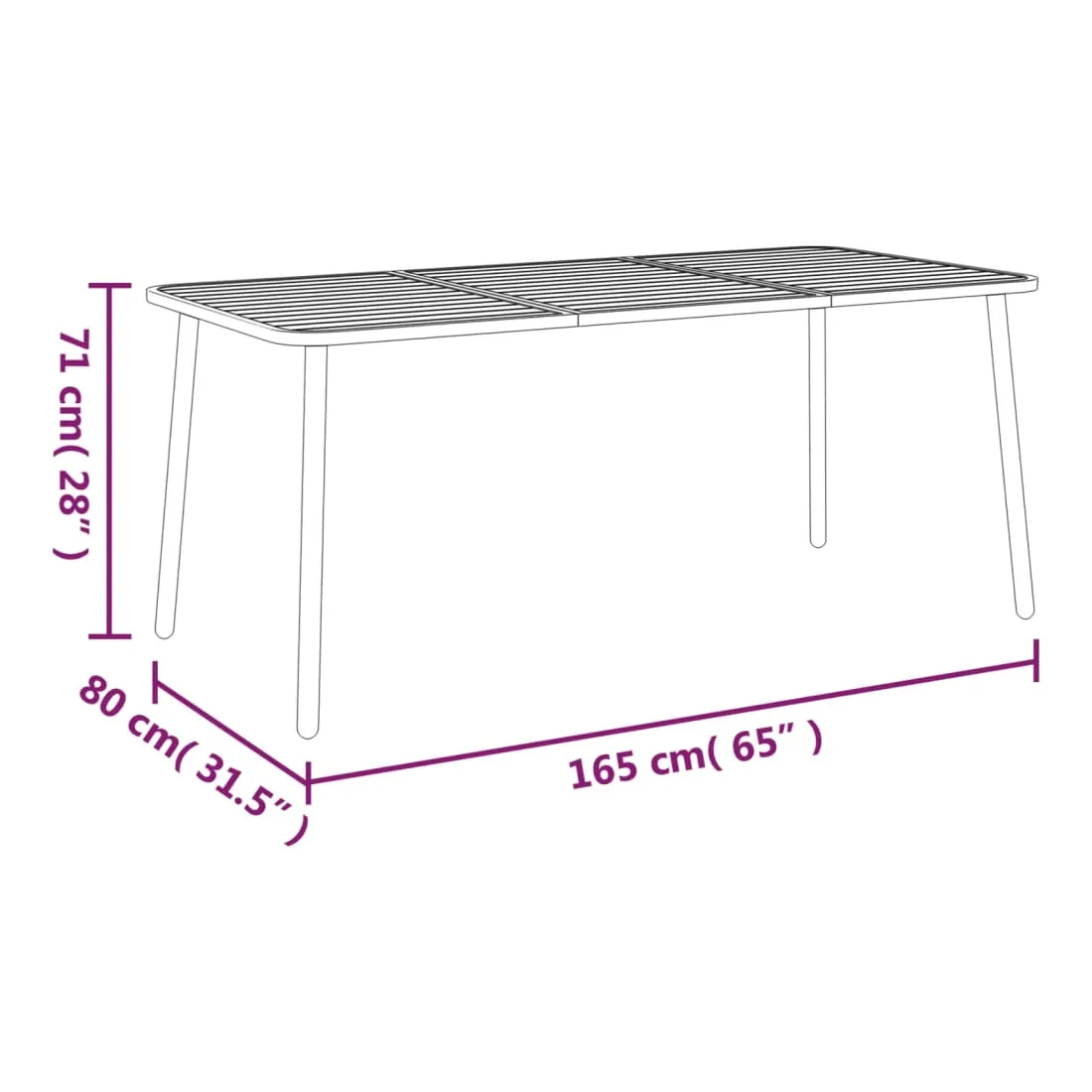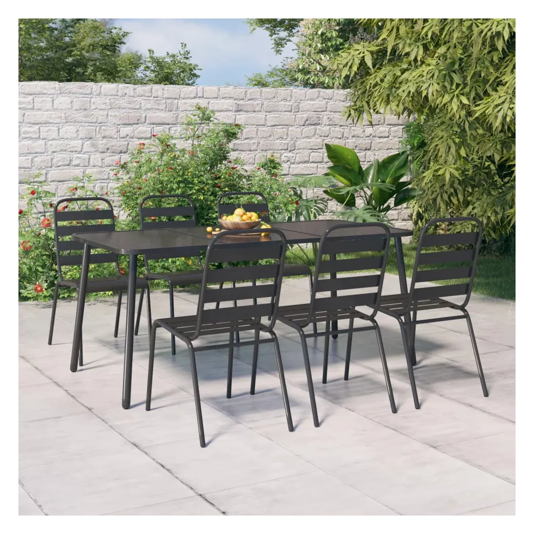 Cet ensemble de salle à manger de jardin tendance, au design élégant et contemporain, est un choix parfait pour vous détendre dans votre jardin. Matériau robuste : l'acier est un matériau exceptionnellement dur et solide. Il offre robustesse et stabilité. Le revêtement par poudre et le revêtement électronique de l'acier créent une couche protectrice contre l'usure et la corrosion.Cadre stable : le cadre en acier enduit de poudre et e-coated assure la robustesse et la stabilité de l'ensemble de salle à manger.Fonction empilable : les chaises de salle à manger sont empilables pour économiser de l'espace lorsqu'elles ne sont pas utilisées.Table pratique : le dessus robuste de la table à manger est parfait pour placer des repas, des boissons et d'autres objets décoratifs.Design à lattes : la table à manger de jardin avec un design à lattes est simple et intemporelle et convient aux balcons, porches, jardins, terrasses, etc. Remarque :Pour que vos meubles d'extérieur restent beaux, nous vous recommandons de les protéger avec une housse imperméable.