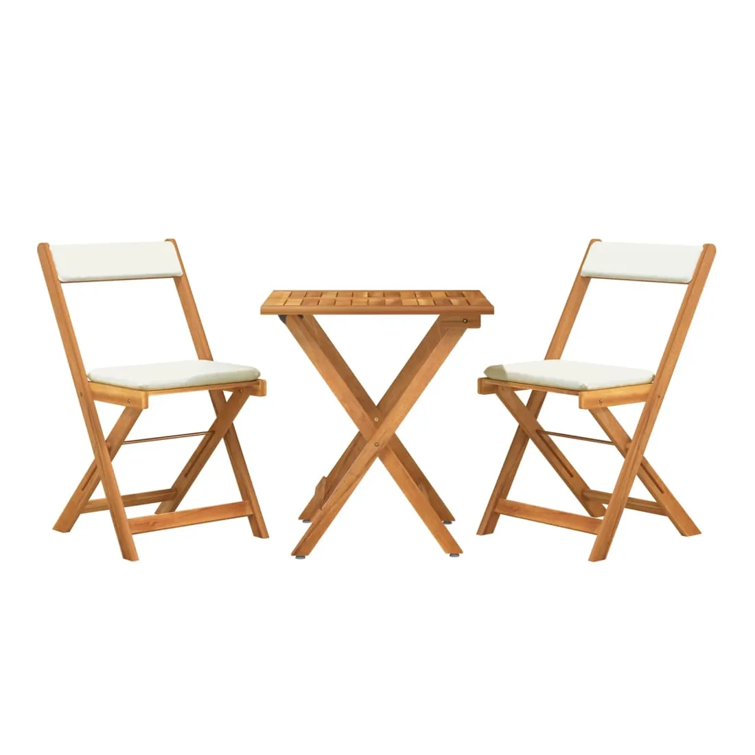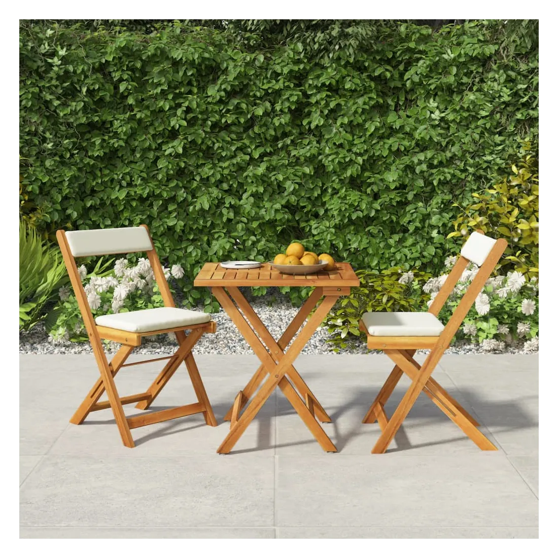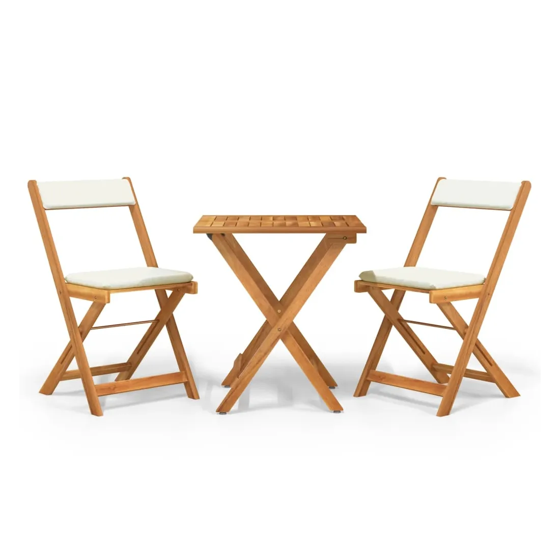 Cet ensemble de bistro pliable en bois avec coussins, fabriqué en bois d'acacia massif, est un excellent choix pour dîner ou vous détendre dans le jardin. Matériau durable : le bois d'acacia massif est un matériau naturel magnifique. Le bois d'acacia un bois dur tropical, qui est dense, robuste et durable.Design pliable : la table et les chaises peuvent être facilement repliées lorsqu'elles ne sont pas utilisées pour faciliter le rangement et le transport.Expérience de siège confortable : des coussins supplémentaires sont inclus pour votre confort. Bon à savoir :Pour faciliter au maximum le montage, chaque produit est livré avec des instructions. Remarque :Pour que vos meubles d'extérieur restent beaux, nous vous recommandons de les protéger avec une housse imperméable.