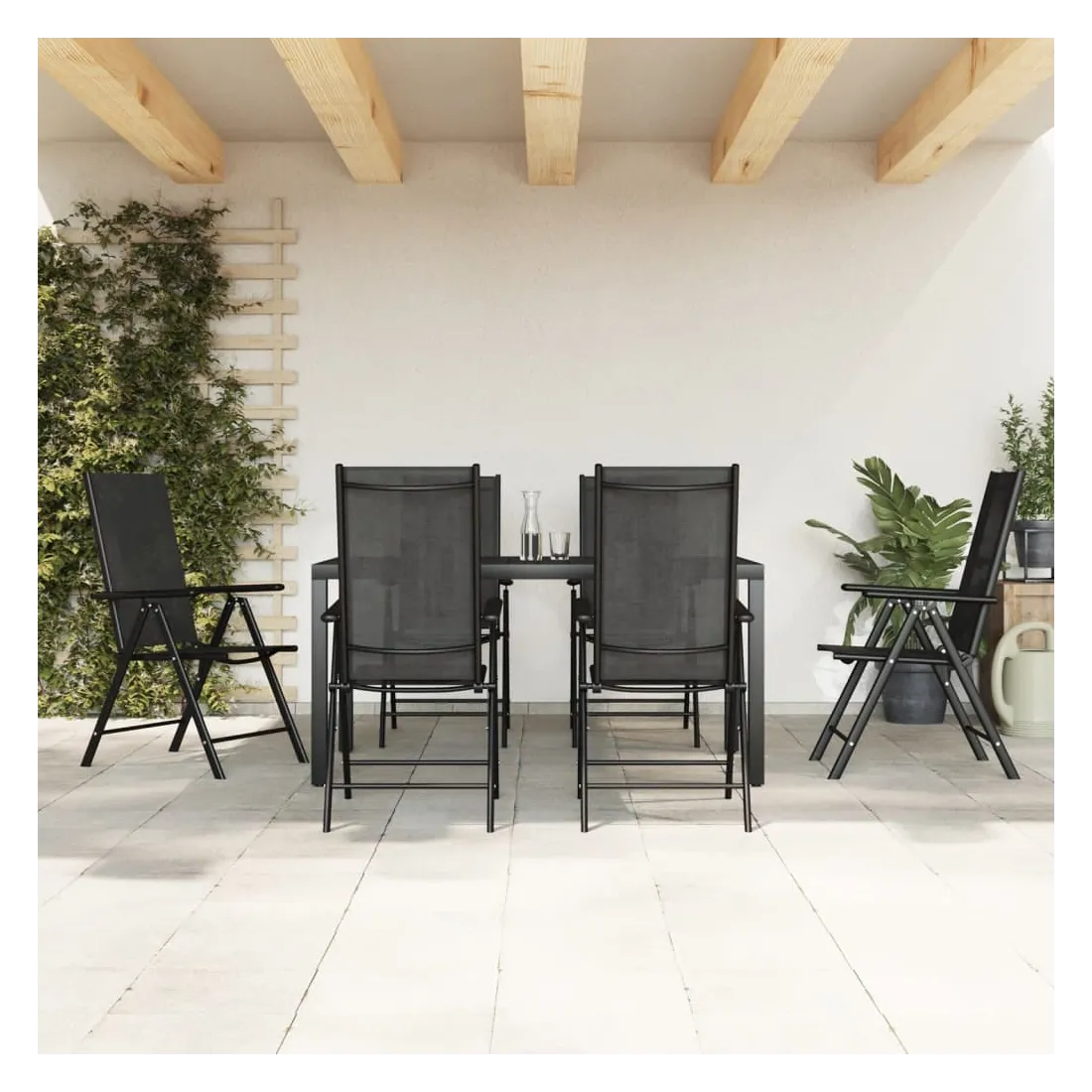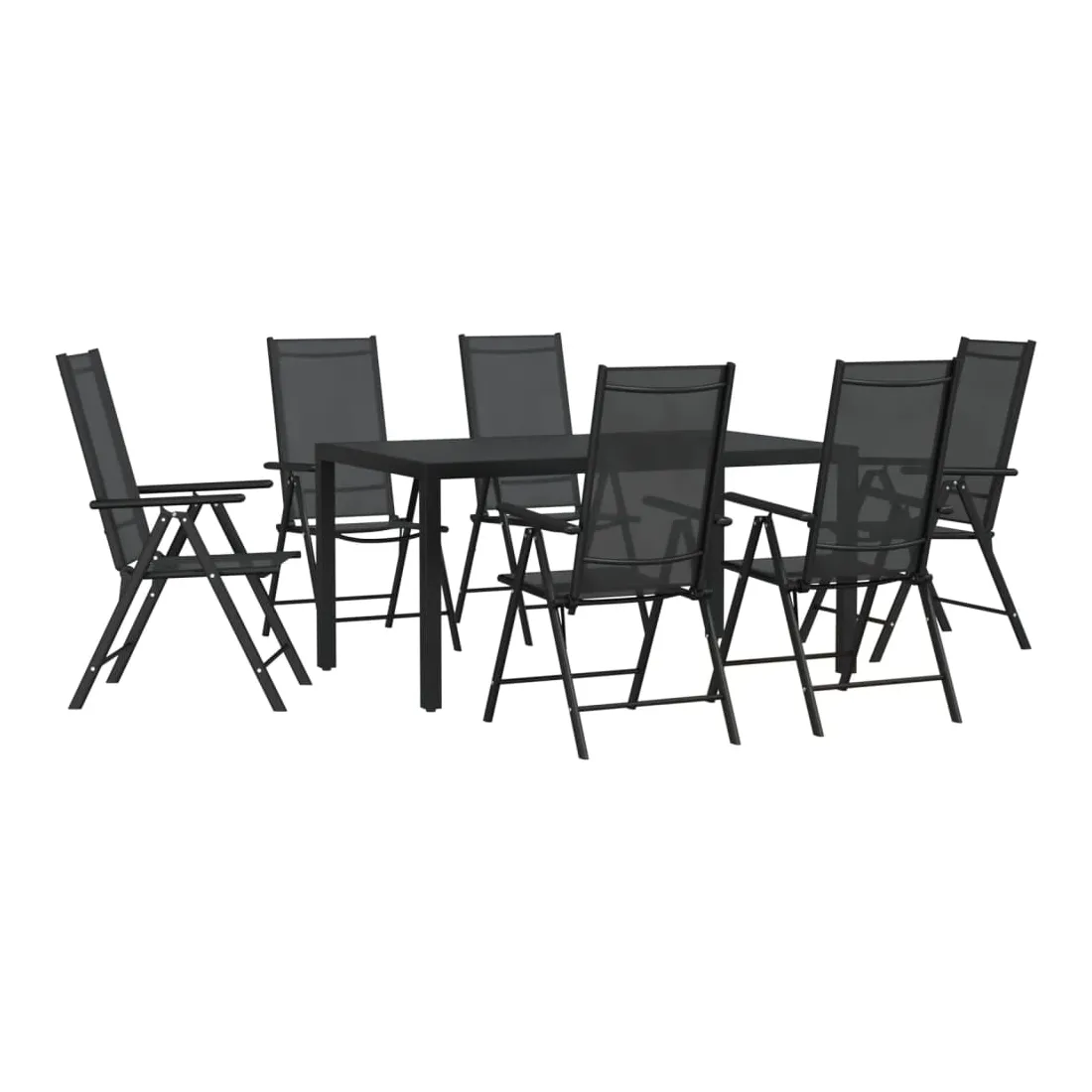 Cet ensemble de salle à manger de jardin à la fois pratique et élégant est parfait pour vous détendre ou dîner dans votre jardin ou sur votre terrasse. Matériau respirant : les sièges sont confortables grâce au textilène respirant. Le tissu textilène permet à l'air de circuler librement à travers lui tout en étant résistant aux rayons UV. Le textilène est donc idéal par temps chauds. En tant que matériau durable et solide, il est très résistant aux déchirures, aux perforations et à la moisissure.Cadre robuste : le cadre en aluminium revêtu de poudre rend l'ensemble de salle à manger robuste et durable pour une utilisation à l'extérieur.Dossier réglable : les dossiers des chaises de jardin sont réglables en 7 positions afin que vous puissiez toujours trouver la position la plus confortable.Fonction pliable : la chaise inclinable peut être pliée pour gagner de la place lorsqu'elle n'est pas utilisée.Table pratique : la table à manger est dotée d'un dessus de table en WPC, facile à nettoyer et adapté à une utilisation en plein air. Le dessus de table robuste est parfait pour placer des repas, des boissons, des vases, des coupes de fruits ou d'autres objets décoratifs. Bon à savoir :Pour que vos meubles d'extérieur restent beaux, nous vous recommandons de les protéger avec une housse imperméable.
