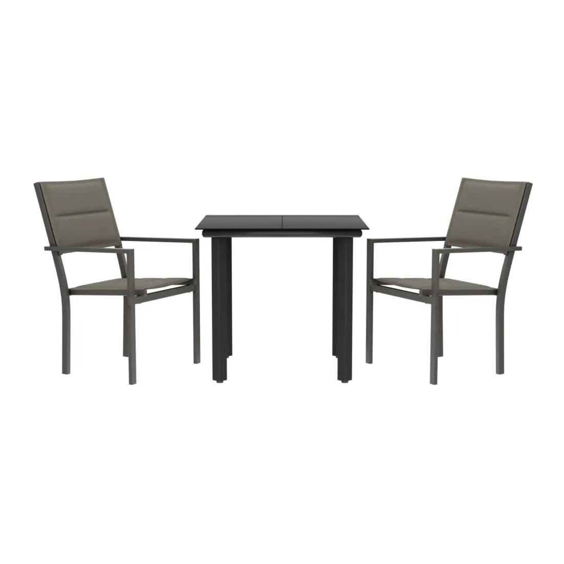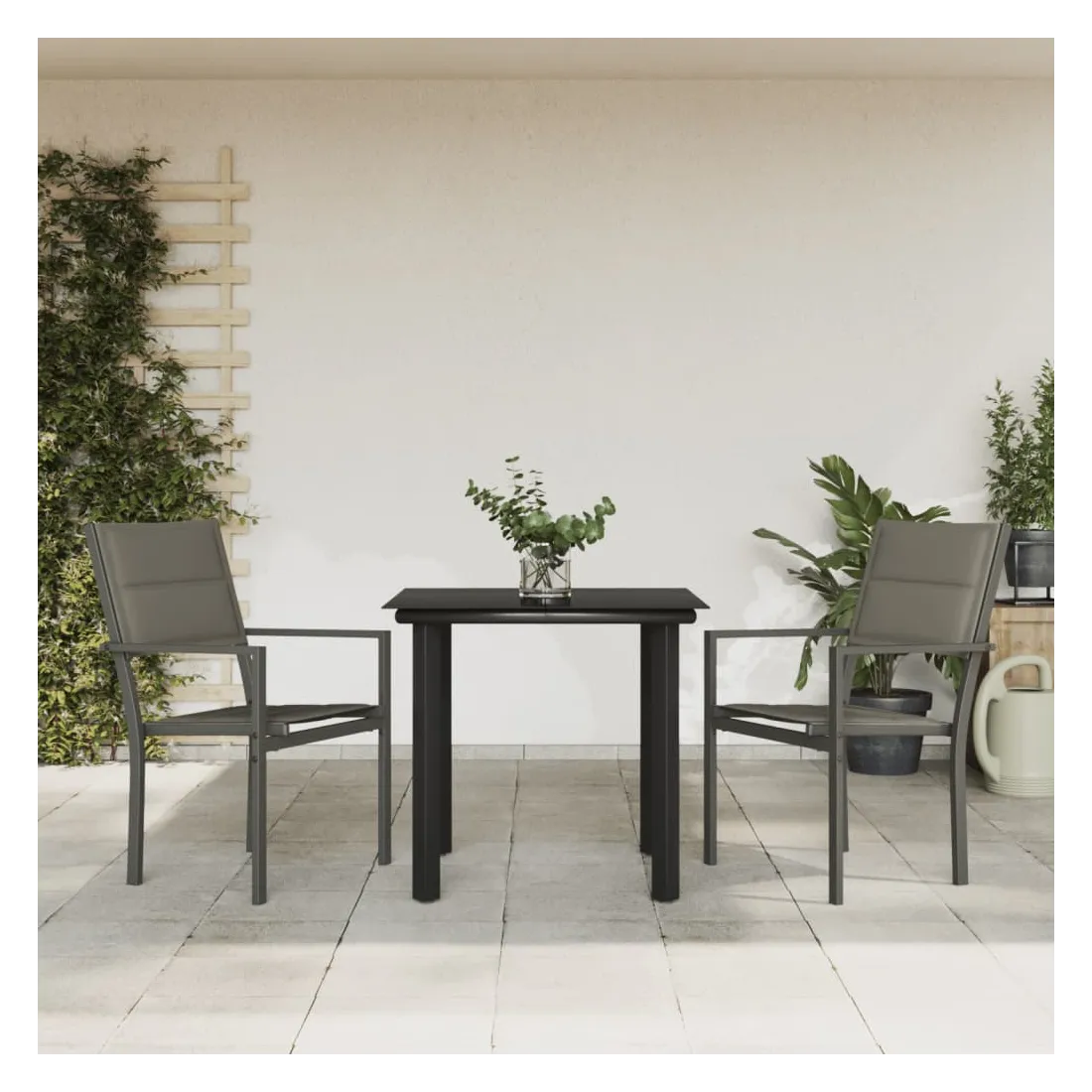 Profitez d'un bon repas ou d'un thé l'après-midi dans votre espace extérieur avec cet ensemble de salle à manger de jardin ! Ayant un design élégant, il deviendra le point central de votre jardin et de votre terrasse ! Cadre stable : les fauteuils et la table ont une construction en acier revêtu de poudre, ce qui les rend robustes et stables.Matériau durable : grâce au tissu textilène résistant avec rembourrage, ces chaises d'extérieur sont très confortables, résistantes aux intempéries et faciles à nettoyer.Dessus de table robustes : le dessus de table est en verre trempé, ce qui le rend facile à nettoyer. De plus, le dessus de table est parfait pour placer des collations, des boissons, des vases, des bols de fruits ou d'autres objets décoratifs.Expérience d'assise confortable : le dossier et les accoudoirs ergonomiques vous offrent une meilleure expérience d'assise. Bon à savoir :Pour que vos meubles d'extérieur restent beaux, nous vous recommandons de les protéger avec une housse imperméable.
