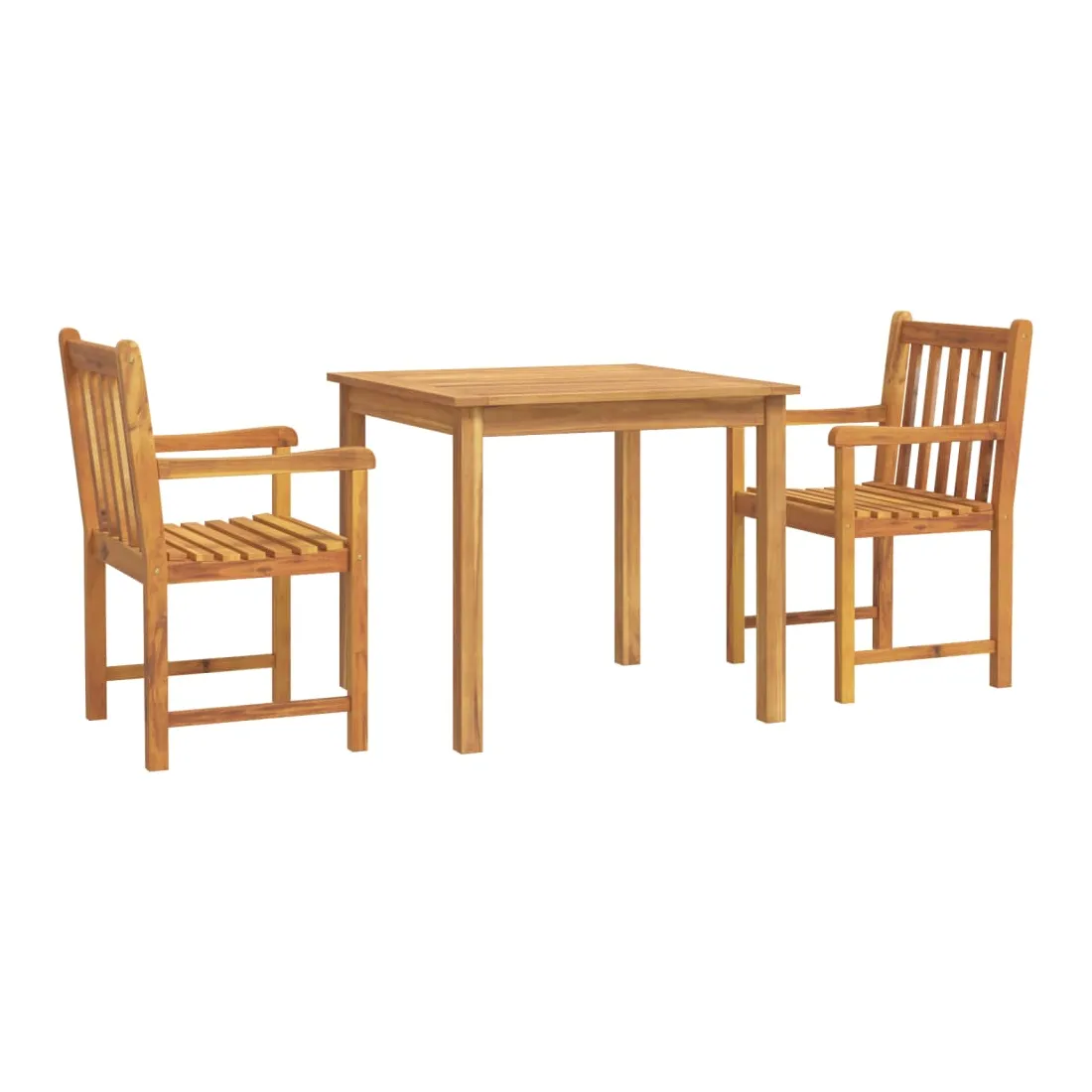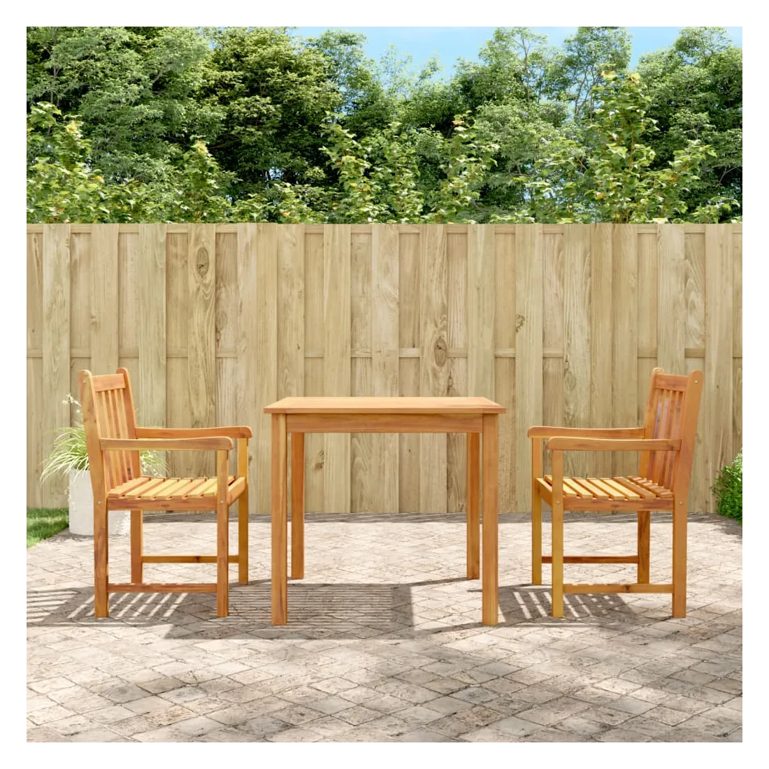 Profitez d'un bon repas ou d'un thé l'après-midi dans votre espace extérieur avec cet ensemble à manger de jardin en bois ! Bois d'acacia massif : le bois d'acacia massif est un matériau naturel magnifique. Le bois d'acacia un bois dur tropical, qui est dense, robuste et durable.Dessus de table pratique : le dessus de table robuste de la table à manger permet de placer des collations, des paniers de fruits, des objets décoratifs et d'autres objets nécessaires.Assise confortable : la chaise à manger est conçue avec un dossier et des accoudoirs pour vous offrir une expérience d'assise confortable. Bon à savoir :Pour que vos meubles d'extérieur restent beaux, nous vous recommandons de les protéger avec une housse imperméable.