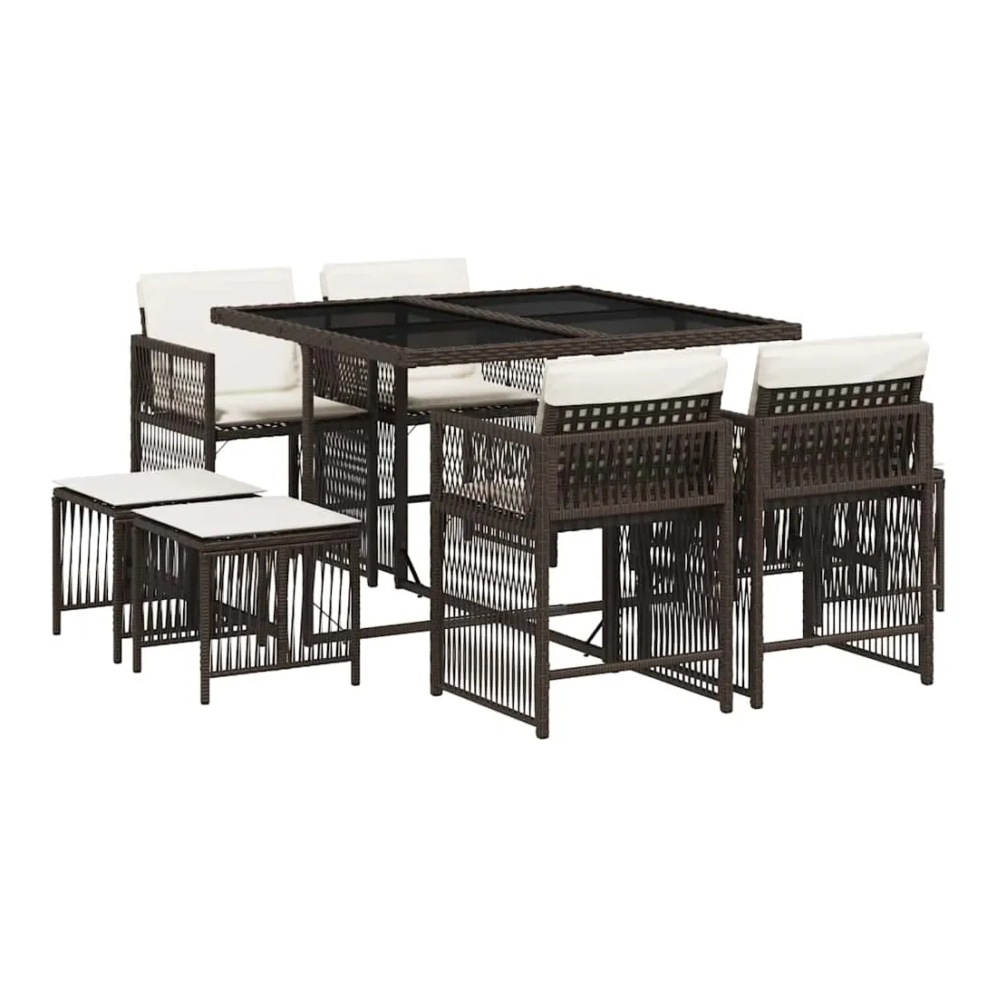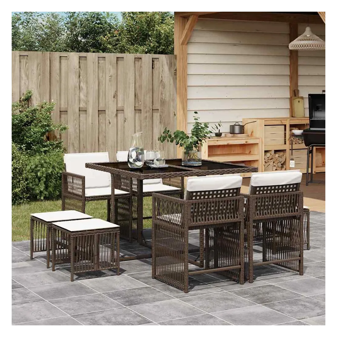 Cet ensemble de salle à manger de jardin est un excellent choix pour les repas en plein air ou pour vous détendre dans le jardin, l'arrière-cour ou le patio. Matériau durable : la résine tressée, également connue sous le nom de poly rotin, est un matériau synthétique solide et nécessitant peu d'entretien qui ressemble au rotin naturel. Il est léger, facile à nettoyer et couramment utilisé pour les meubles d'extérieur en raison de sa durabilité et de ses propriétés de résistance aux intempéries.Rangement compact : ces chaises sont dotées d'un dossier rabattable, ce qui permet de les ranger facilement sous la table. Une fois pliées, elles se rangent parfaitement sous la table, formant un cube peu encombrant.Expérience d'assise confortable : ce mobilier d'extérieur, doté de coussins épais, offre une expérience d'assise confortable.Housse amovible et lavable : ces coussins de siège sont dotés de housses amovibles pour un lavage et un entretien faciles. Les housses de coussin ont un rabat à l'arrière pour une fixation facile aux dossiers.Dessus en verre : le dessus de la table d'extérieur est fabriqué en verre trempé solide et durable, ce qui le rend facile à nettoyer avec un chiffon humide et ajoute une touche d'élégance à votre espace extérieur. Bon à savoir :Pour que vos meubles d'extérieur restent beaux, nous vous recommandons de les protéger avec une housse imperméable.