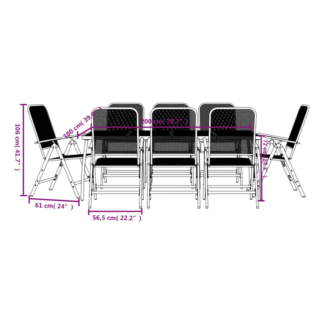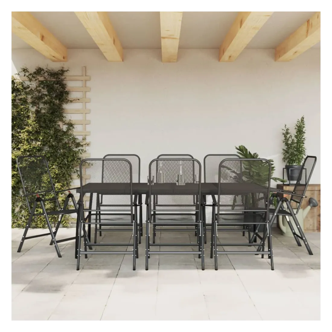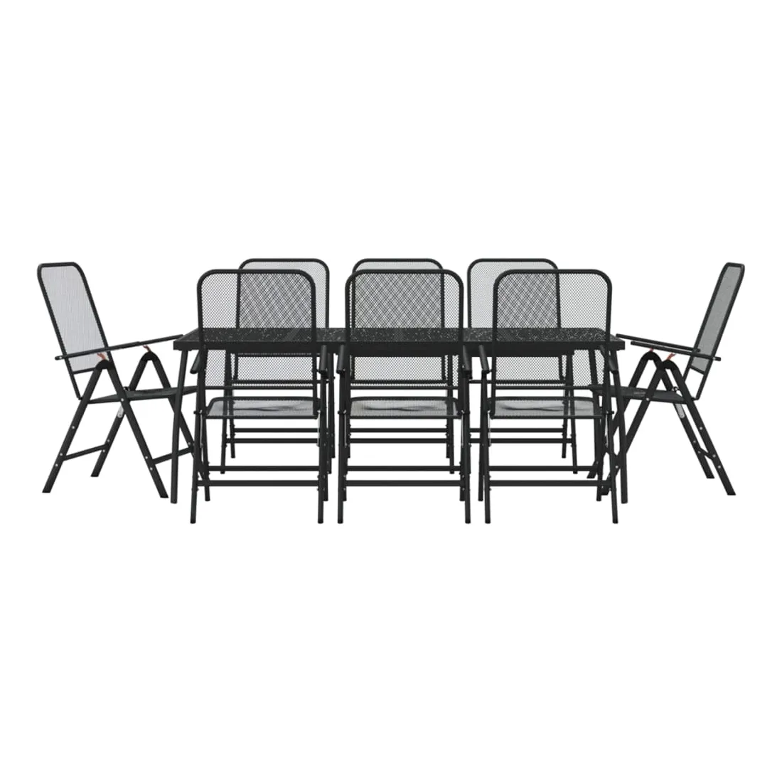 Profitez d'un bon repas ou d'un thé l'après-midi dans votre espace extérieur avec cet ensemble de salle à manger de jardin ! Ayant un design élégant, il deviendra le point central de votre jardin et de votre terrasse ! Cadre robuste : le cadre en métal rend cet ensemble de meubles de jardin robuste et durable, offrant un service à vie.Conception en maille : cet ensemble de salle à manger, avec son design en maille, peut efficacement éviter l'accumulation d'eau, ajoutant une apparence élégante à votre espace de vie extérieur.Dessus de table pratique : le dessus robuste de la table de jardin est parfait pour placer les repas, les boissons et d'autres objets décoratifs.Facile à déplacer : ces chaises à manger de jardin sont pliables pour gagner de la place lorsqu'elles ne sont pas utilisées. Vous pouvez facilement les transporter avec vous lors de vos sorties en plein air.Dossier réglable : ces chaises inclinables ont des dossiers qui s'inclinent dans 7 réglages, de sorte que vous puissiez toujours trouver la position la plus confortable. Bon à savoir :Pour que vos meubles d'extérieur restent beaux, nous vous recommandons de les protéger avec une housse imperméable.