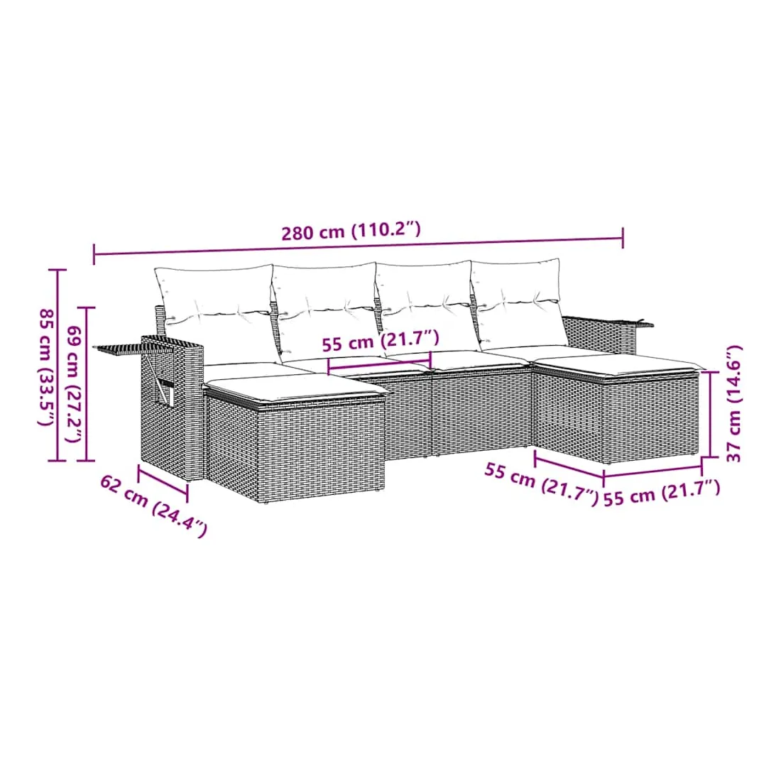 Cet ensemble de canapés de jardin est le complément parfait de votre arrière-cour, terrasse ou patio, offrant un espace confortable et accueillant pour discuter avec la famille et les amis ou simplement se détendre et profiter de l'extérieur. Matériau durable : la résine tressée, également connue sous le nom de poly rotin, est un matériau synthétique solide et nécessitant peu d'entretien qui ressemble au rotin naturel. Il est léger, facile à nettoyer et couramment utilisé pour les meubles d'extérieur en raison de sa durabilité et de ses propriétés de résistance aux intempéries. Table d'appoint pratique : ce mobilier d'extérieur comprend des tables d'appoint pliables avec un ressort à gaz sur les accoudoirs, offrant des endroits pratiques pour garder vos essentiels à portée de main. Expérience d'assise confortable : ce mobilier d'extérieur, doté de coussins épais, offre une expérience d'assise confortable. Housse amovible et lavable : ces coussins de siège sont dotés de housses amovibles pour un lavage et un entretien faciles.Conception modulaire : cet ensemble de meubles d'extérieur a une conception modulaire, ce qui le rend complètement flexible et facile à déplacer, afin que vous puissiez créer un agencement de meubles d'extérieur personnalisé. Bon à savoir :Pour que vos meubles d'extérieur restent beaux, nous vous recommandons de les protéger avec une housse imperméable.