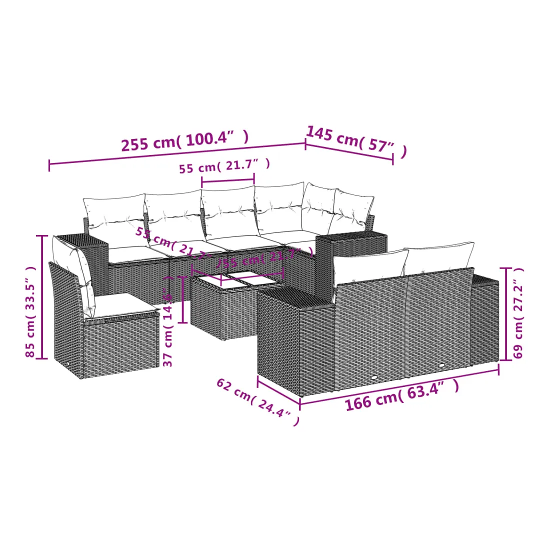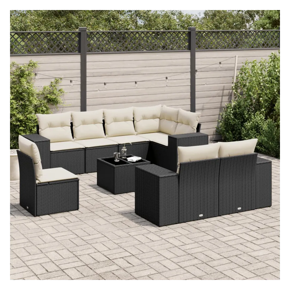 Cet ensemble de canapés de jardin est le complément parfait de votre arrière-cour, terrasse ou patio, offrant un espace confortable et accueillant pour discuter avec la famille et les amis ou simplement se détendre et profiter de l'extérieur. Matériau durable : la résine tressée, également connue sous le nom de poly rotin, est un matériau synthétique solide et nécessitant peu d'entretien qui ressemble au rotin naturel. Il est léger, facile à nettoyer et couramment utilisé pour les meubles d'extérieur en raison de sa durabilité et de ses propriétés de résistance aux intempéries.Expérience d'assise confortable : ce mobilier d'extérieur, doté de coussins épais, offre une expérience d'assise confortable.Dessus en verre : le dessus de la table d'extérieur est fabriqué en verre trempé solide et durable, ce qui le rend facile à nettoyer avec un chiffon humide et ajoute une touche d'élégance à votre espace extérieur.Housse amovible et lavable : ces coussins de siège sont dotés de housses amovibles pour un lavage et un entretien faciles.Conception modulaire : cet ensemble de meubles d'extérieur a une conception modulaire, ce qui le rend complètement flexible et facile à déplacer, afin que vous puissiez créer un agencement de meubles d'extérieur personnalisé. Bon à savoir :Pour que vos meubles d'extérieur restent beaux, nous vous recommandons de les protéger avec une housse imperméable.