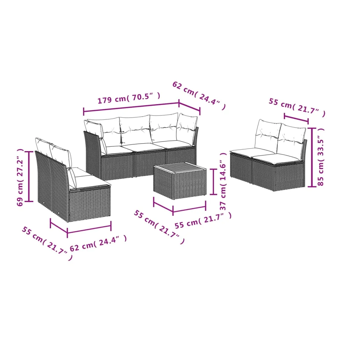 - 7 x coussin de siège avec housse amovible et lavable