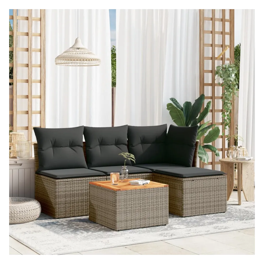 Cet ensemble de canapés de jardin est le complément parfait de votre arrière-cour, terrasse ou patio, offrant un espace confortable et accueillant pour discuter avec la famille et les amis ou simplement se détendre et profiter de l'extérieur. Matériau durable : la résine tressée, également connue sous le nom de poly rotin, est un matériau synthétique solide et nécessitant peu d'entretien qui ressemble au rotin naturel. Il est léger, facile à nettoyer et couramment utilisé pour les meubles d'extérieur en raison de sa durabilité et de ses propriétés de résistance aux intempéries.Expérience d'assise confortable : ce mobilier d'extérieur, doté de coussins épais, offre une expérience d'assise confortable.Dessus stable et facile à nettoyer : cette table de jardin a un dessus en bois d'acacia robuste, durable et facile à nettoyer avec un chiffon humide.Housse amovible et lavable : ces coussins de siège sont dotés de housses amovibles pour un lavage et un entretien faciles.Conception modulaire : cet ensemble de meubles d'extérieur a une conception modulaire, ce qui le rend complètement flexible et facile à déplacer, afin que vous puissiez créer un agencement de meubles d'extérieur personnalisé. Bon à savoir :Pour que vos meubles d'extérieur restent beaux, nous vous recommandons de les protéger avec une housse imperméable.