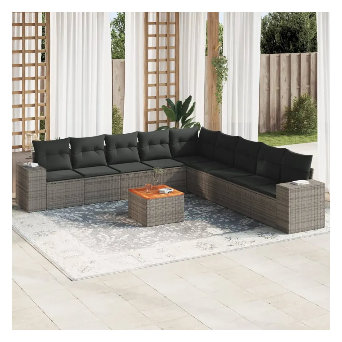 Cet ensemble de canapés de jardin est le complément parfait de votre arrière-cour, terrasse ou patio, offrant un espace confortable et accueillant pour discuter avec la famille et les amis ou simplement se détendre et profiter de l'extérieur. Matériau durable : la résine tressée, également connue sous le nom de poly rotin, est un matériau synthétique solide et nécessitant peu d'entretien qui ressemble au rotin naturel. Il est léger, facile à nettoyer et couramment utilisé pour les meubles d'extérieur en raison de sa durabilité et de ses propriétés de résistance aux intempéries.Dessus stable et facile à nettoyer : cette table de jardin a un dessus en bois d'acacia robuste, durable et facile à nettoyer avec un chiffon humide. Expérience d'assise confortable : ce mobilier d'extérieur, doté de coussins épais, offre une expérience d'assise confortable. Housse amovible et lavable : ces coussins de siège sont dotés de housses amovibles pour un lavage et un entretien faciles.Conception modulaire : cet ensemble de meubles d'extérieur a une conception modulaire, ce qui le rend complètement flexible et facile à déplacer, afin que vous puissiez créer un agencement de meubles d'extérieur personnalisé. Bon à savoir :Pour que vos meubles d'extérieur restent beaux, nous vous recommandons de les protéger avec une housse imperméable.