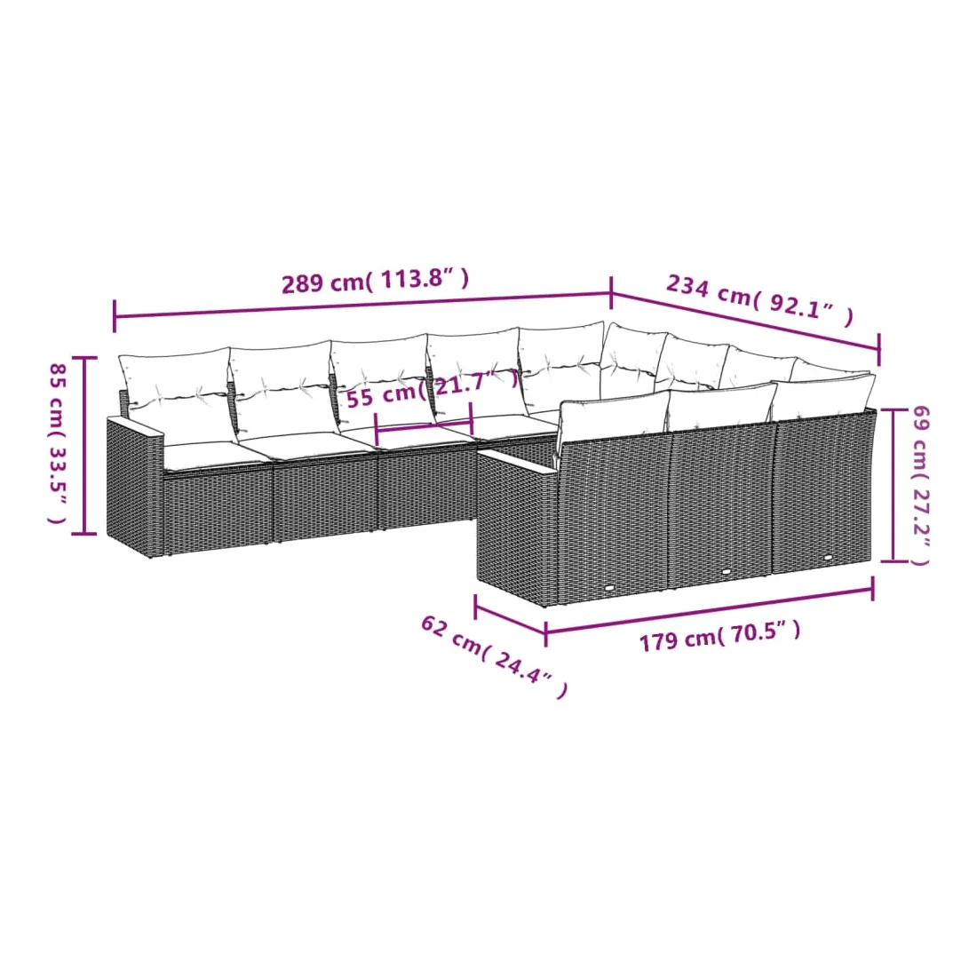 Cet ensemble de canapés de jardin est le complément parfait de votre arrière-cour, terrasse ou patio, offrant un espace confortable et accueillant pour discuter avec la famille et les amis ou simplement se détendre et profiter de l'extérieur. Matériau durable : la résine tressée, également connue sous le nom de poly rotin, est un matériau synthétique solide et nécessitant peu d'entretien qui ressemble au rotin naturel. Il est léger, facile à nettoyer et couramment utilisé pour les meubles d'extérieur en raison de sa durabilité et de ses propriétés de résistance aux intempéries.Housse amovible et lavable : ces coussins de siège sont dotés de housses amovibles pour un lavage et un entretien faciles.Cadre robuste et stable : le cadre en acier enduit de poudre assure la solidité et la stabilité du meuble de jardin pour une utilisation quotidienne à l'extérieur.Conception modulaire : cet ensemble de meubles d'extérieur a une conception modulaire, ce qui le rend complètement flexible et facile à déplacer, afin que vous puissiez créer un agencement de meubles d'extérieur personnalisé. Bon à savoir :Pour que vos meubles d'extérieur restent beaux, nous vous recommandons de les protéger avec une housse imperméable.