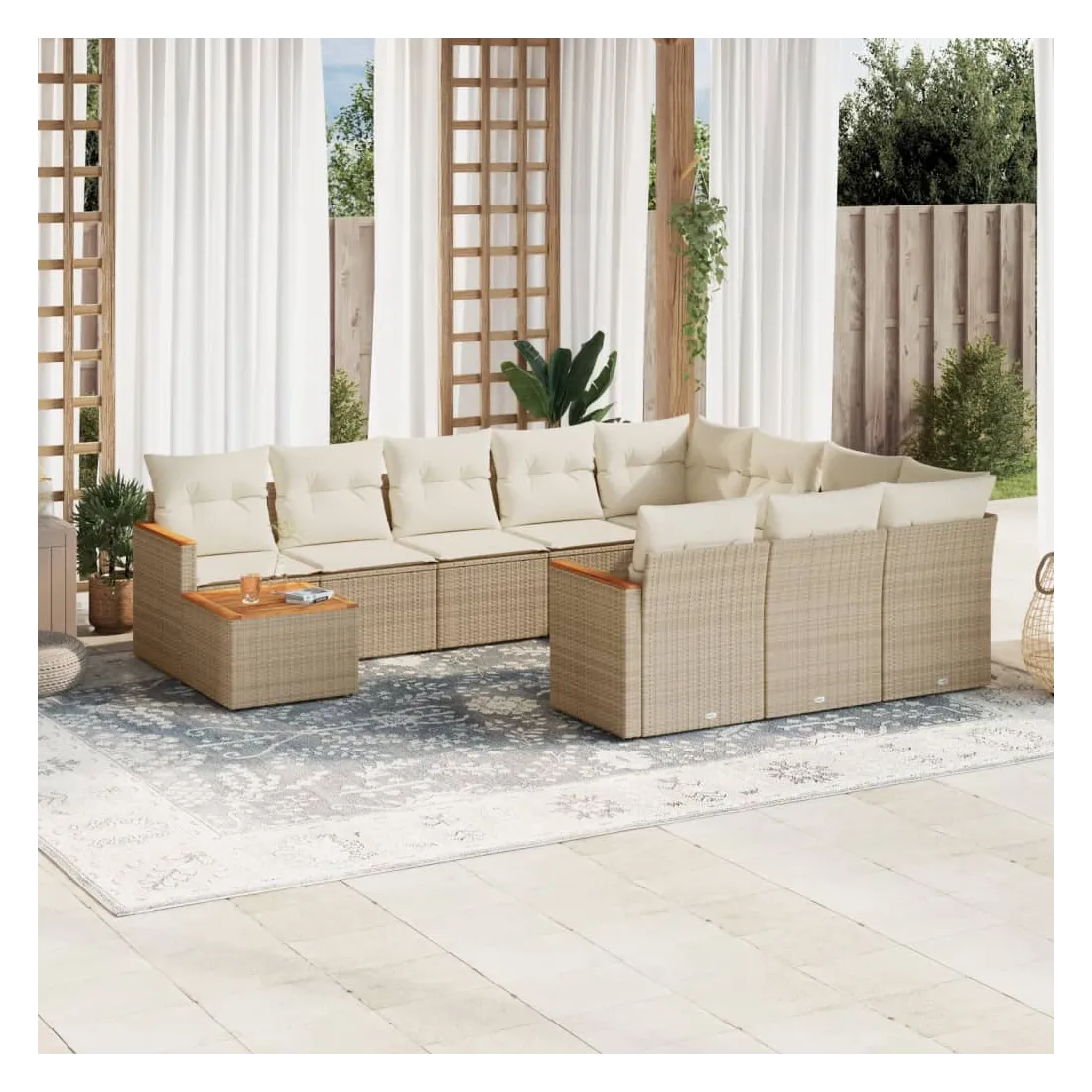 Cet ensemble de canapés de jardin est le complément parfait de votre arrière-cour, terrasse ou patio, offrant un espace confortable et accueillant pour discuter avec la famille et les amis ou simplement se détendre et profiter de l'extérieur. Matériau durable : la résine tressée, également connue sous le nom de poly rotin, est un matériau synthétique solide et nécessitant peu d'entretien qui ressemble au rotin naturel. Il est léger, facile à nettoyer et couramment utilisé pour les meubles d'extérieur en raison de sa durabilité et de ses propriétés de résistance aux intempéries.Dessus stable et facile à nettoyer : cette table de jardin a un dessus en bois d'acacia robuste, durable et facile à nettoyer avec un chiffon humide.Housse amovible et lavable : ces coussins de siège sont dotés de housses amovibles pour un lavage et un entretien faciles.Cadre robuste et stable : le cadre en acier enduit de poudre assure la solidité et la stabilité du meuble de jardin pour une utilisation quotidienne à l'extérieur.Conception modulaire : cet ensemble de meubles d'extérieur a une conception modulaire, ce qui le rend complètement flexible et facile à déplacer, afin que vous puissiez créer un agencement de meubles d'extérieur personnalisé. Bon à savoir :Pour que vos meubles d'extérieur restent beaux, nous vous recommandons de les protéger avec une housse imperméable.